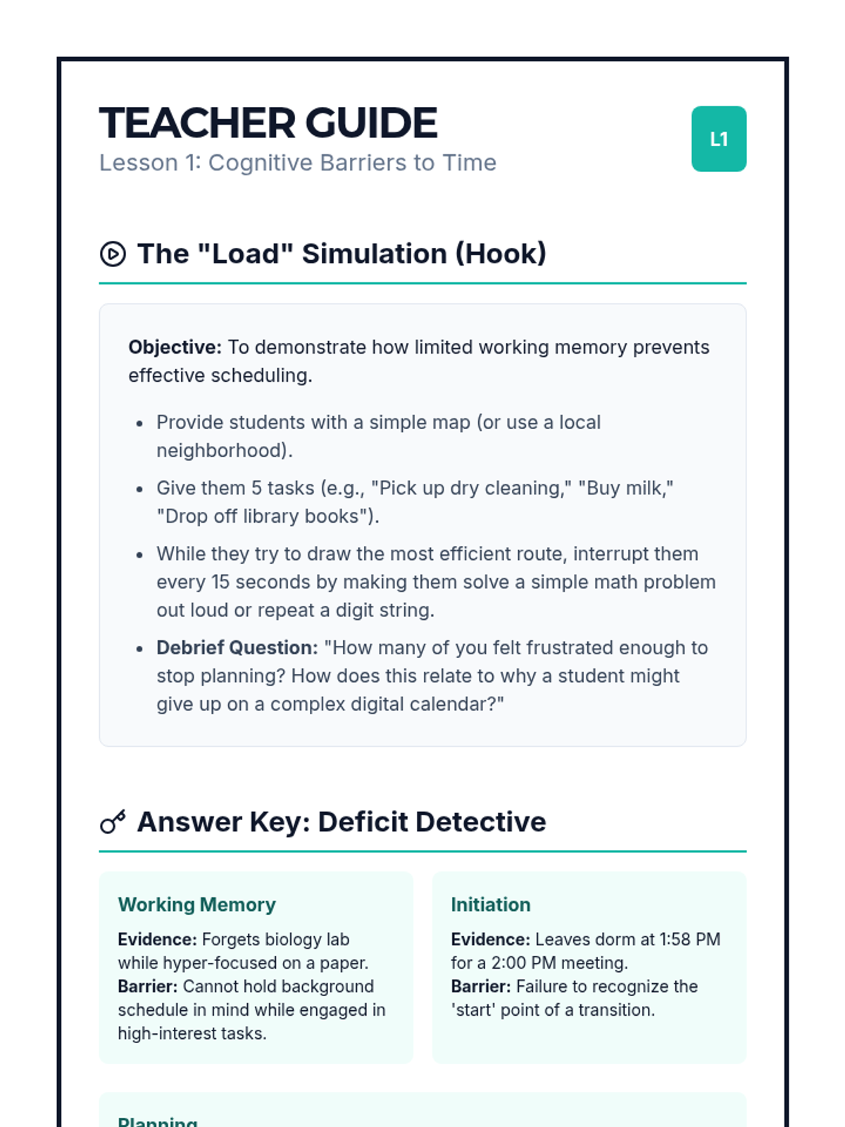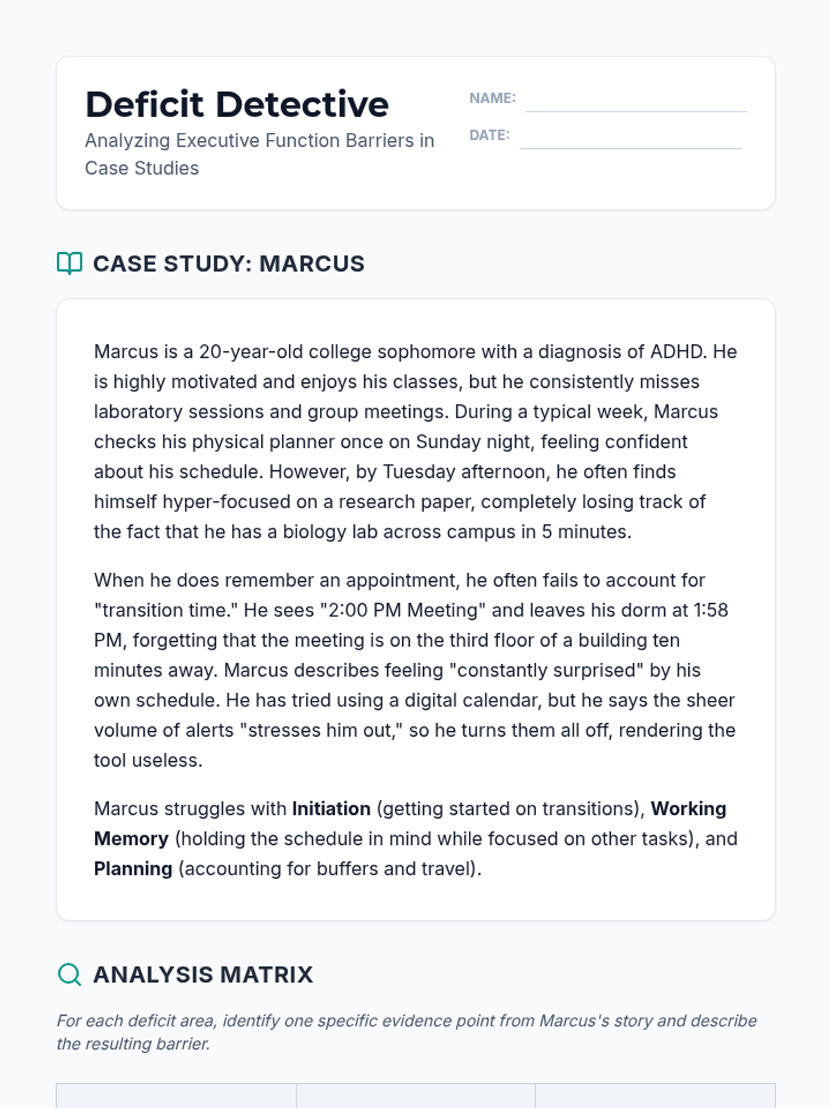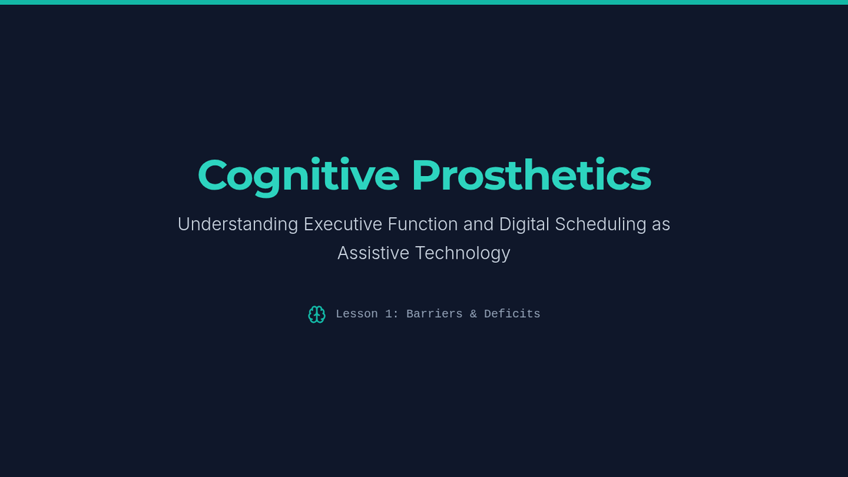 Students explore core executive function components—working memory, initiation, and planning—and how deficits in these areas create barriers to time management. The concept of 'cognitive prosthetics' is introduced to frame digital calendars as essential assistive technology.