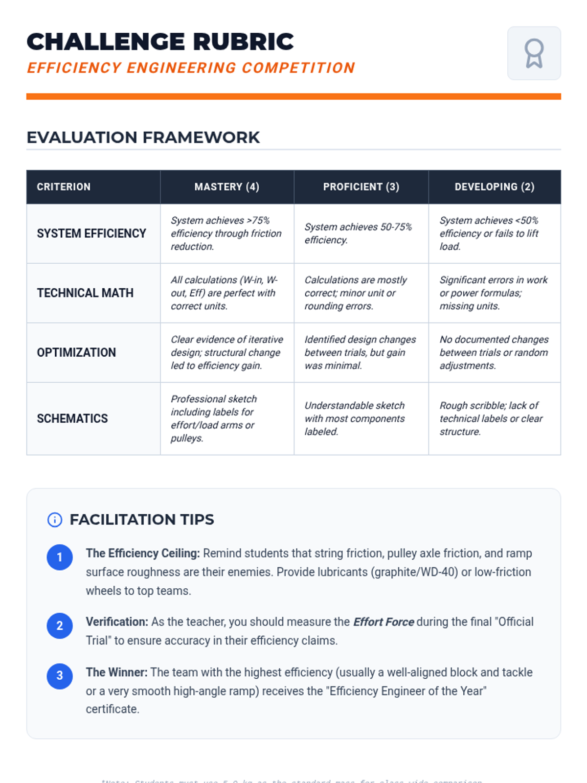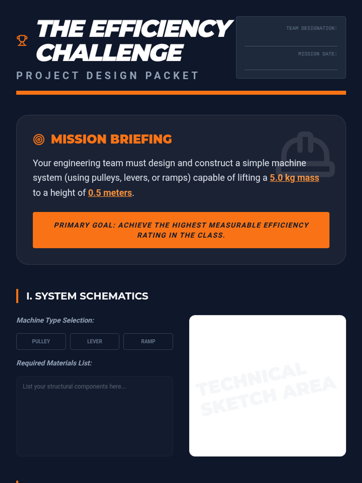 A project-based challenge where students design and build a machine to lift a mass with the highest possible efficiency.