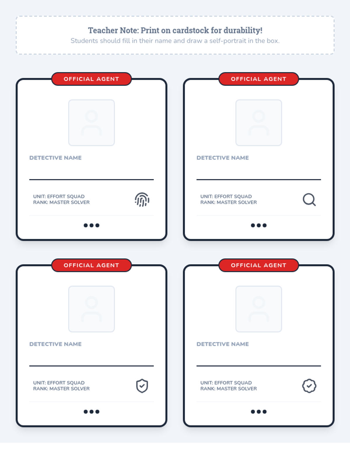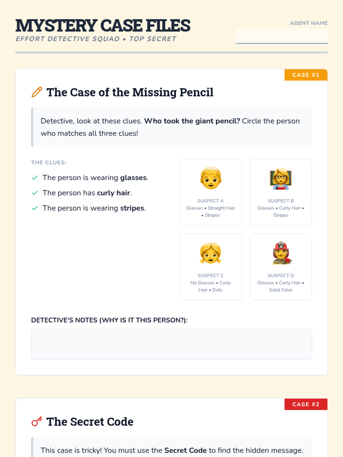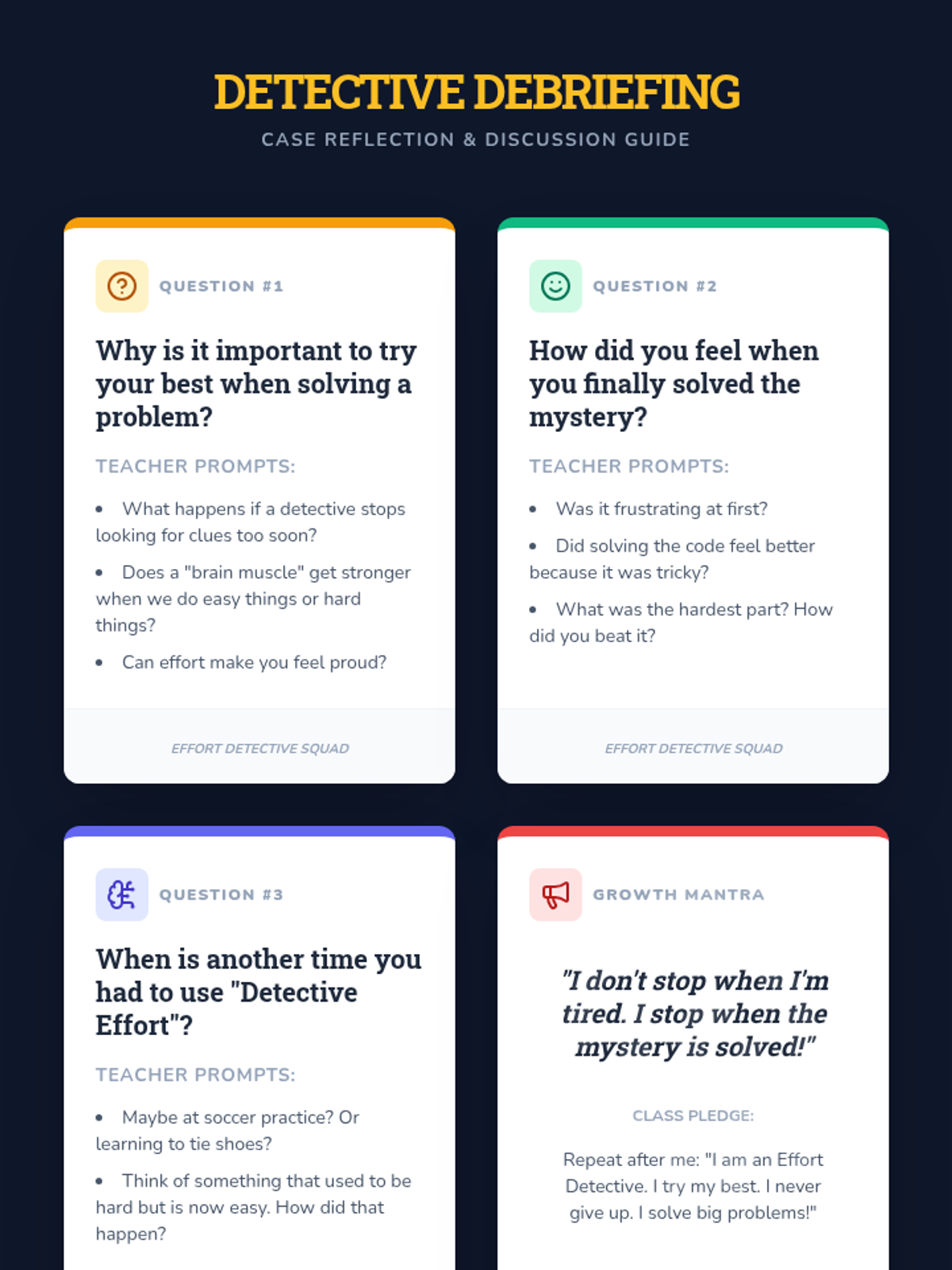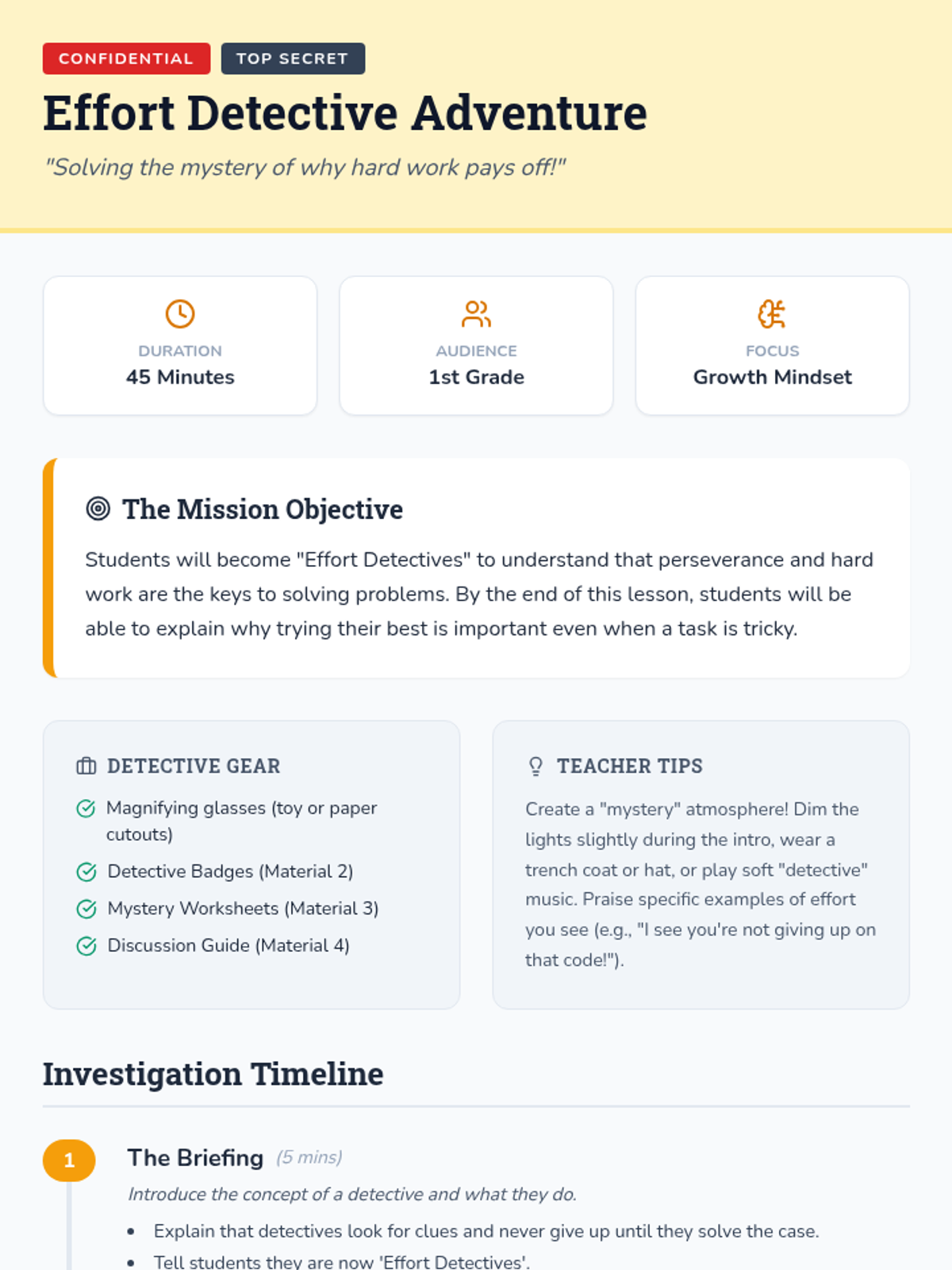 A 1st-grade lesson where students become 'Effort Detectives' to solve mysteries, emphasizing that persistence and effort lead to success. Students create badges, solve classroom-themed mysteries, and reflect on their problem-solving journey.
