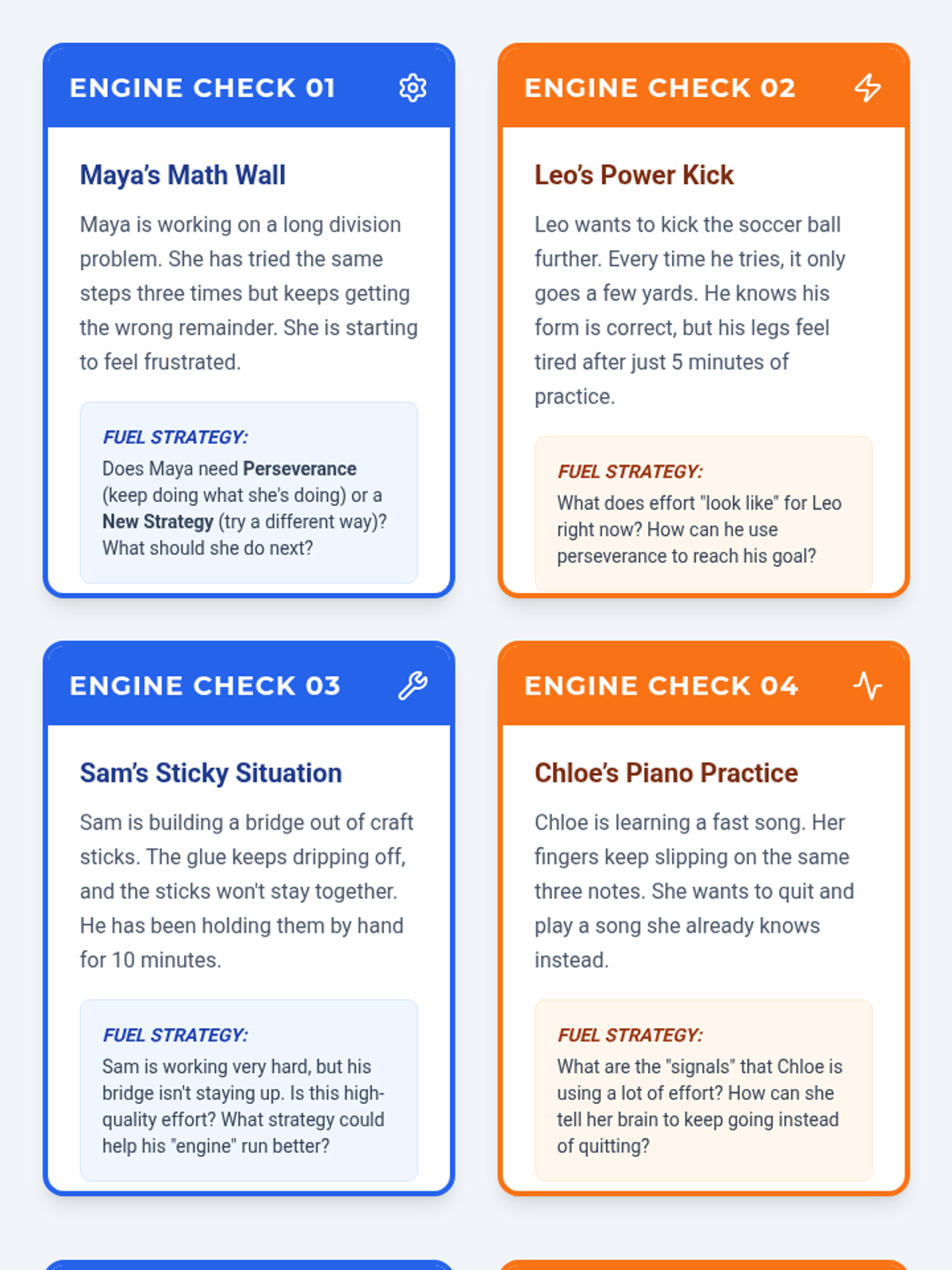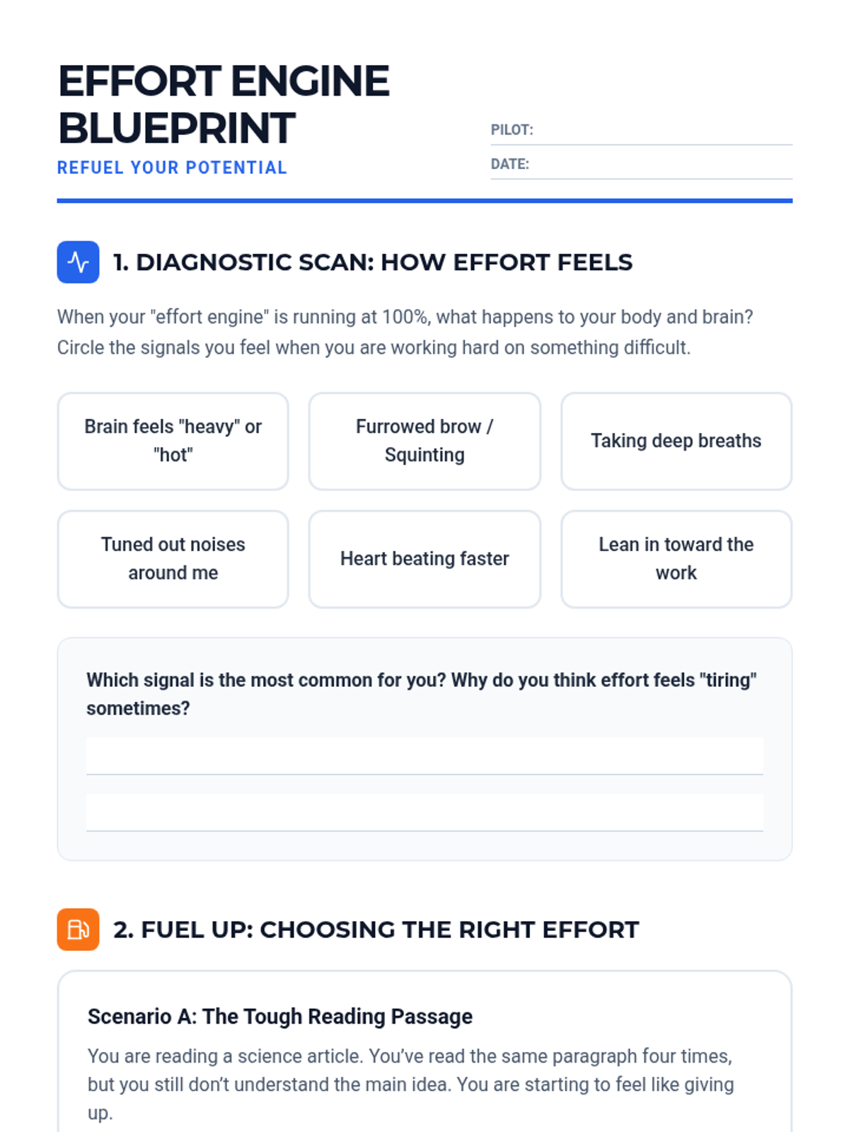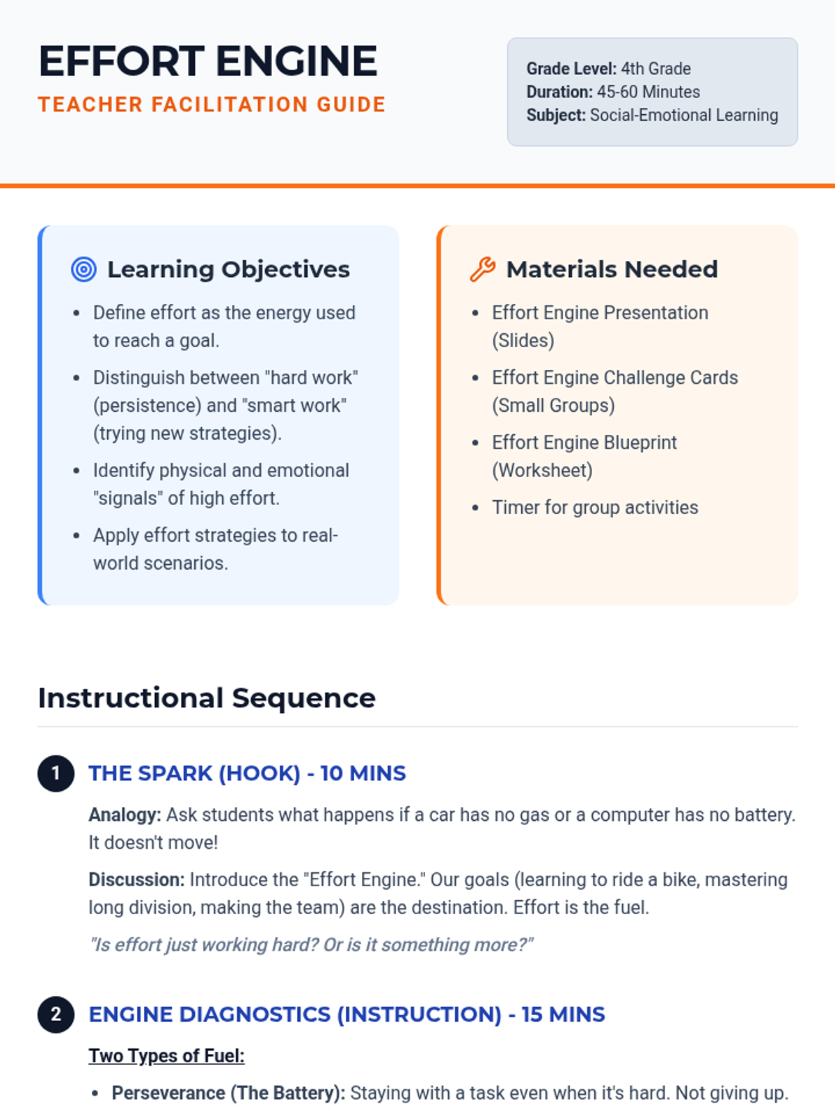 A lesson for 4th graders exploring how effort acts as the 'fuel' for reaching goals, focusing on perseverance and strategic thinking. Students will identify what effort looks and feels like in different scenarios.