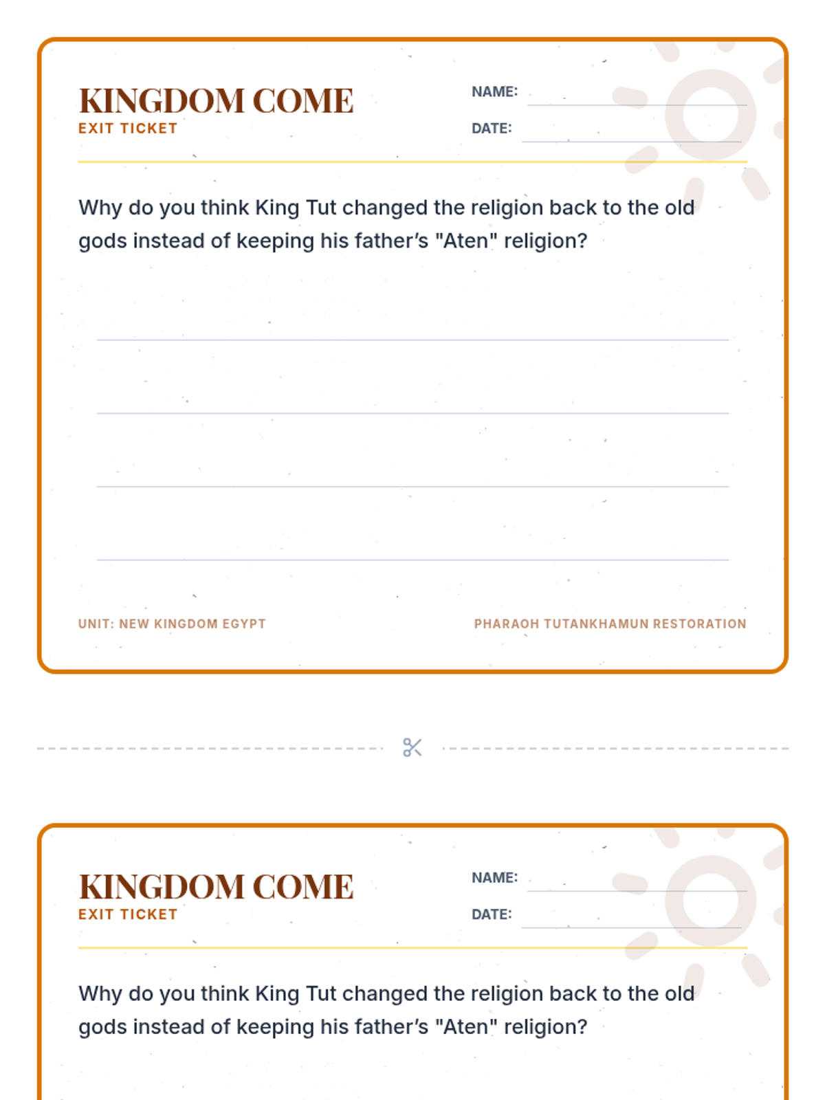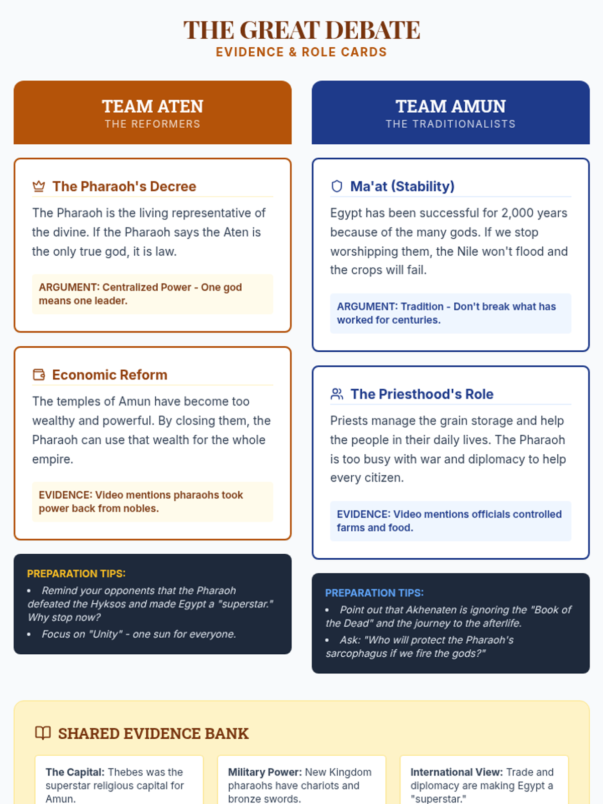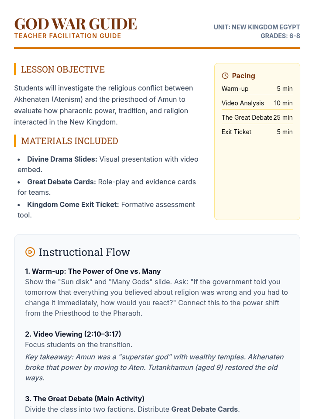 Students explore the religious and political upheaval of Egypt's New Kingdom by debating the merits of Akhenaten's monotheistic revolution versus the traditional priesthood of Amun. The lesson uses video analysis and a structured debate to understand how religion, power, and tradition collided during the reigns of Akhenaten and Tutankhamun.
