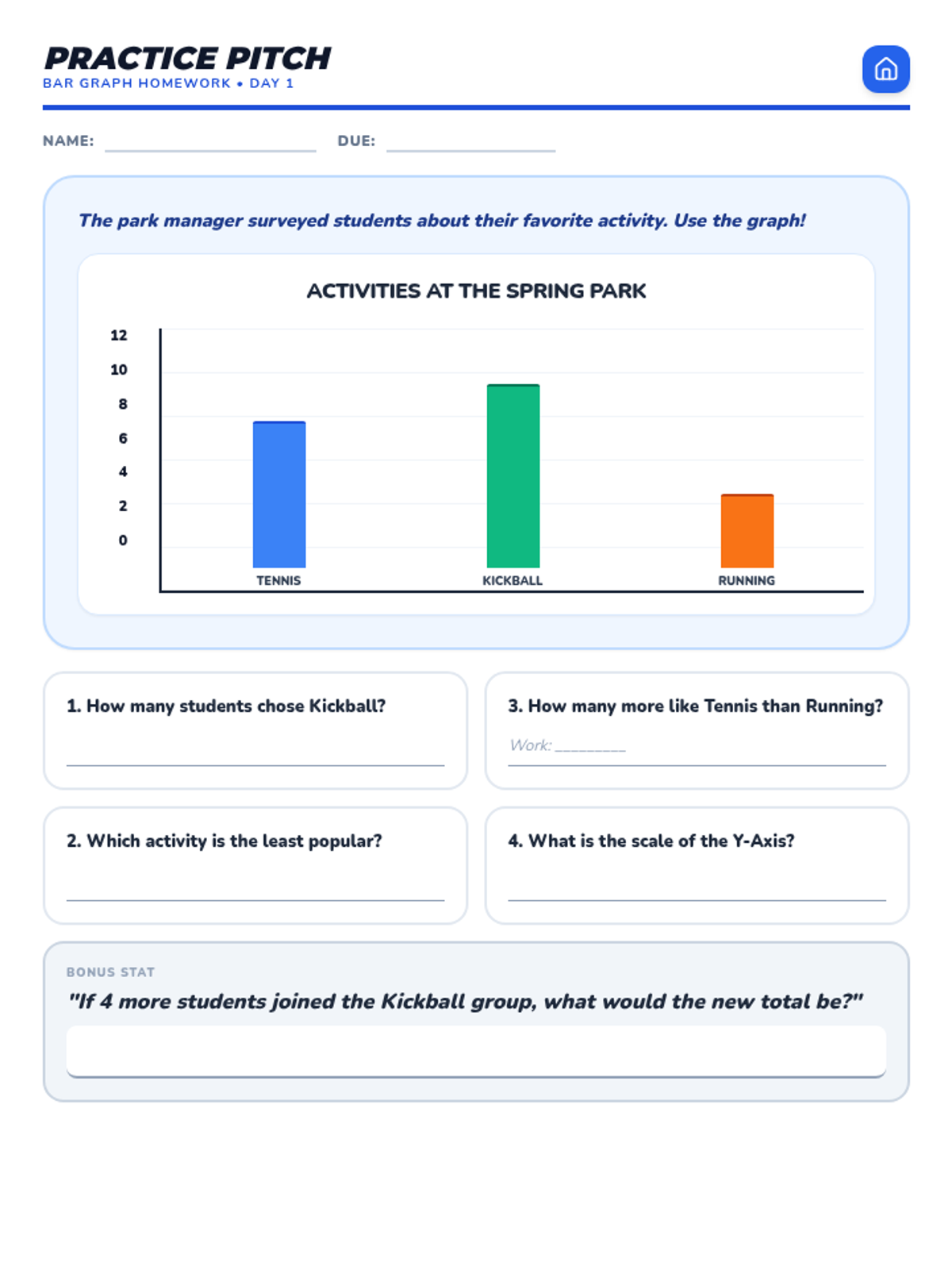 Students learn to read and analyze bar graphs by interpreting data about spring activities and answering comparative questions.