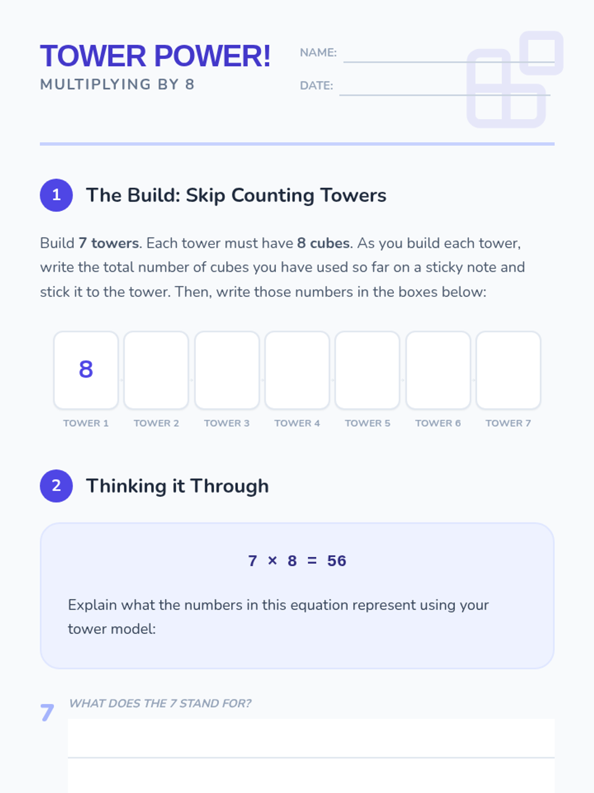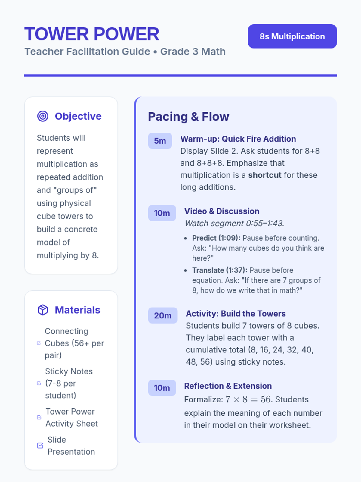 A 3rd-grade math lesson that introduces multiplication by 8 through repeated addition and physical cube models. Students build towers to visualize 'groups of' and transition from addition to multiplication equations.