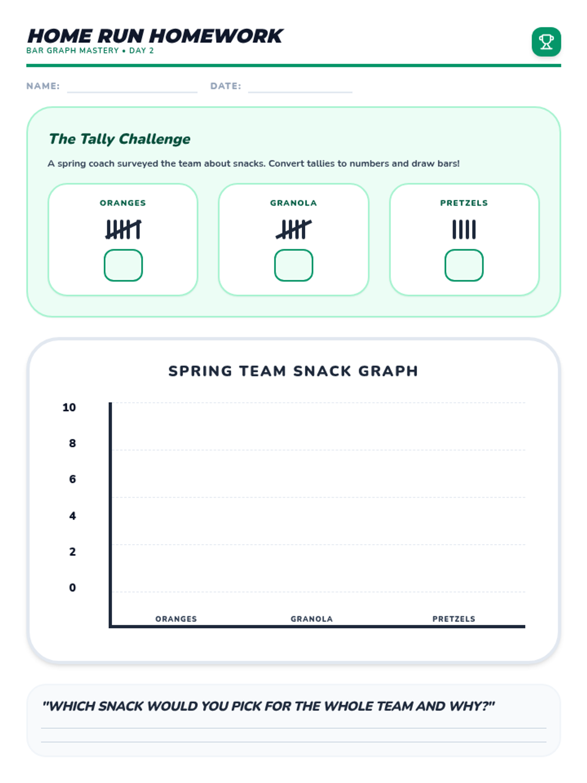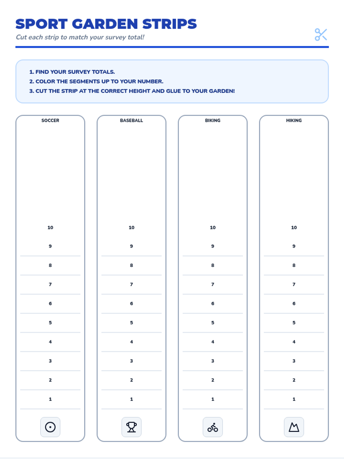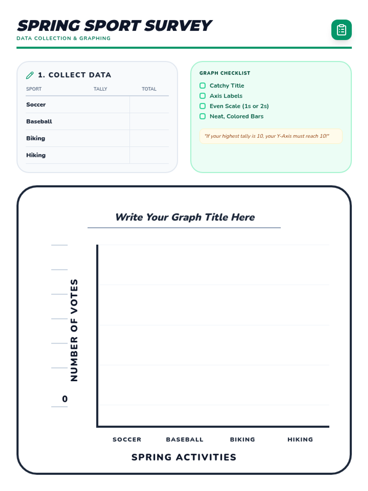 Students collect data through a class survey and create their own bar graphs, culminating in a creative spring-themed sports craft.