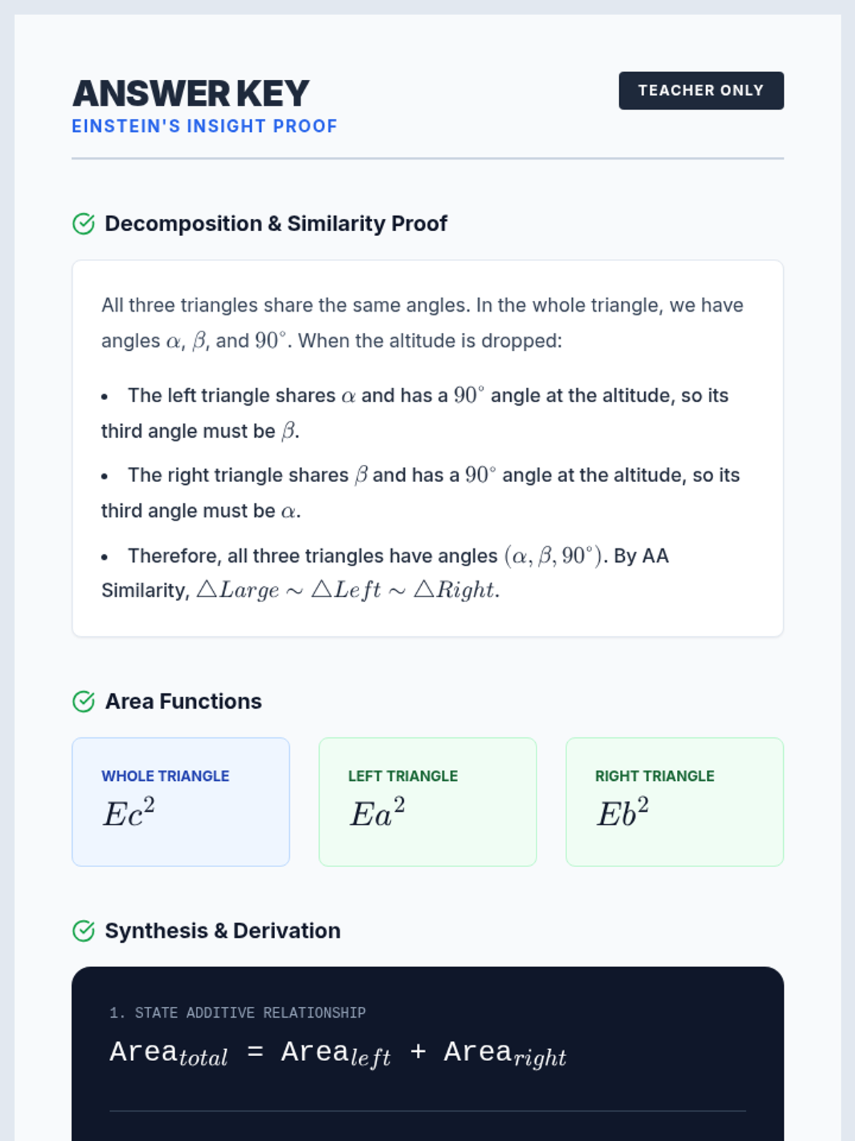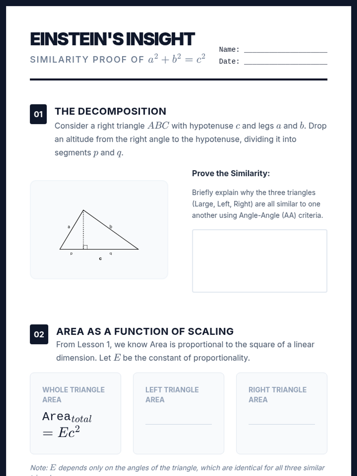 Deconstruct Albert Einstein's proof of the Pythagorean theorem using similarity and area additivity.