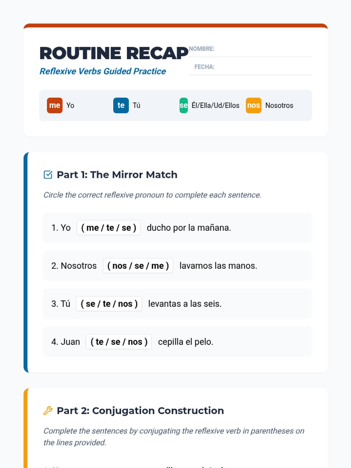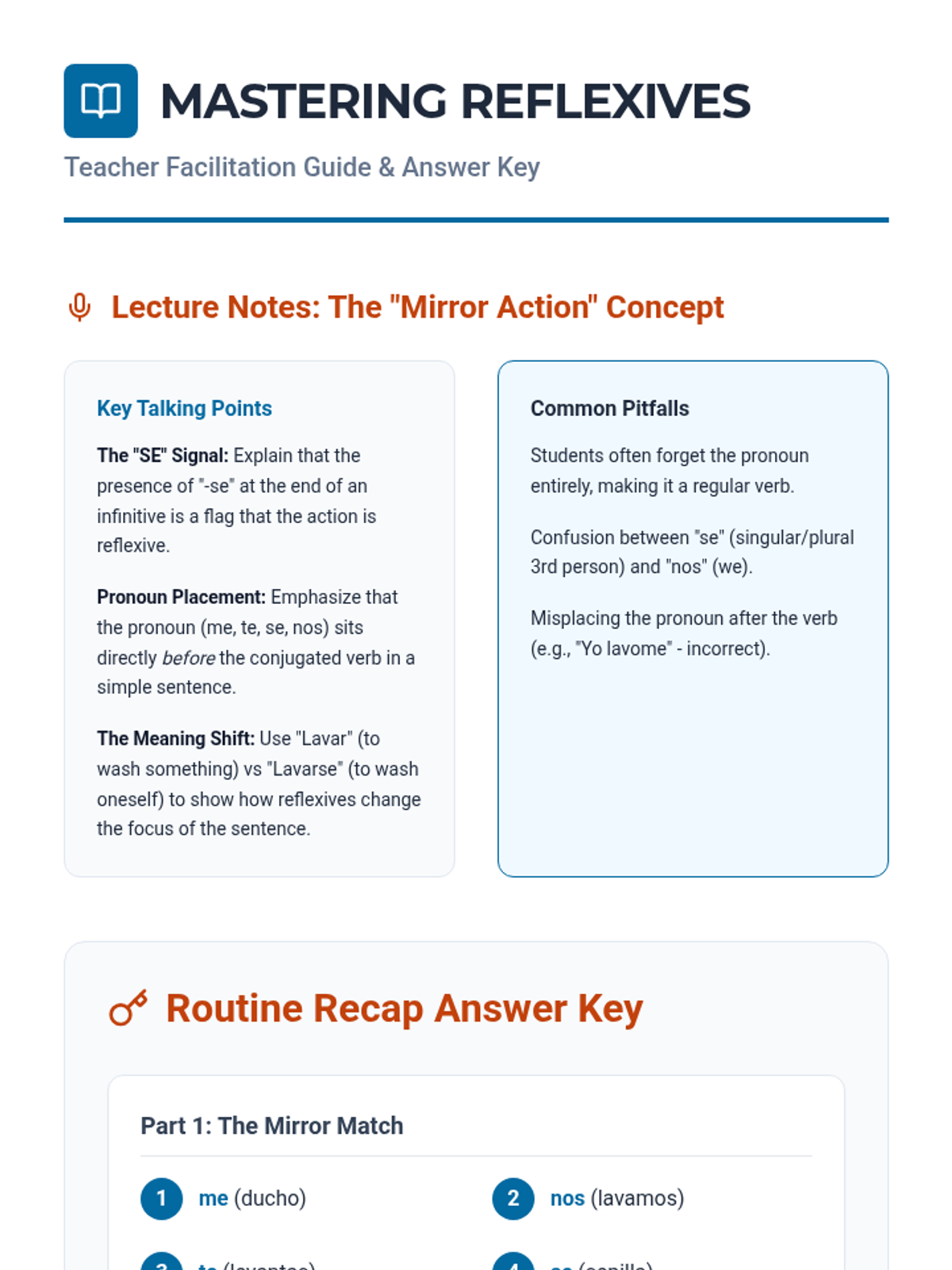 This lesson introduces students to reflexive verbs in Spanish, focusing on the pronouns me, te, se, and nos within the context of daily routines. Students will learn the mechanics of conjugation and how to describe their personal actions.