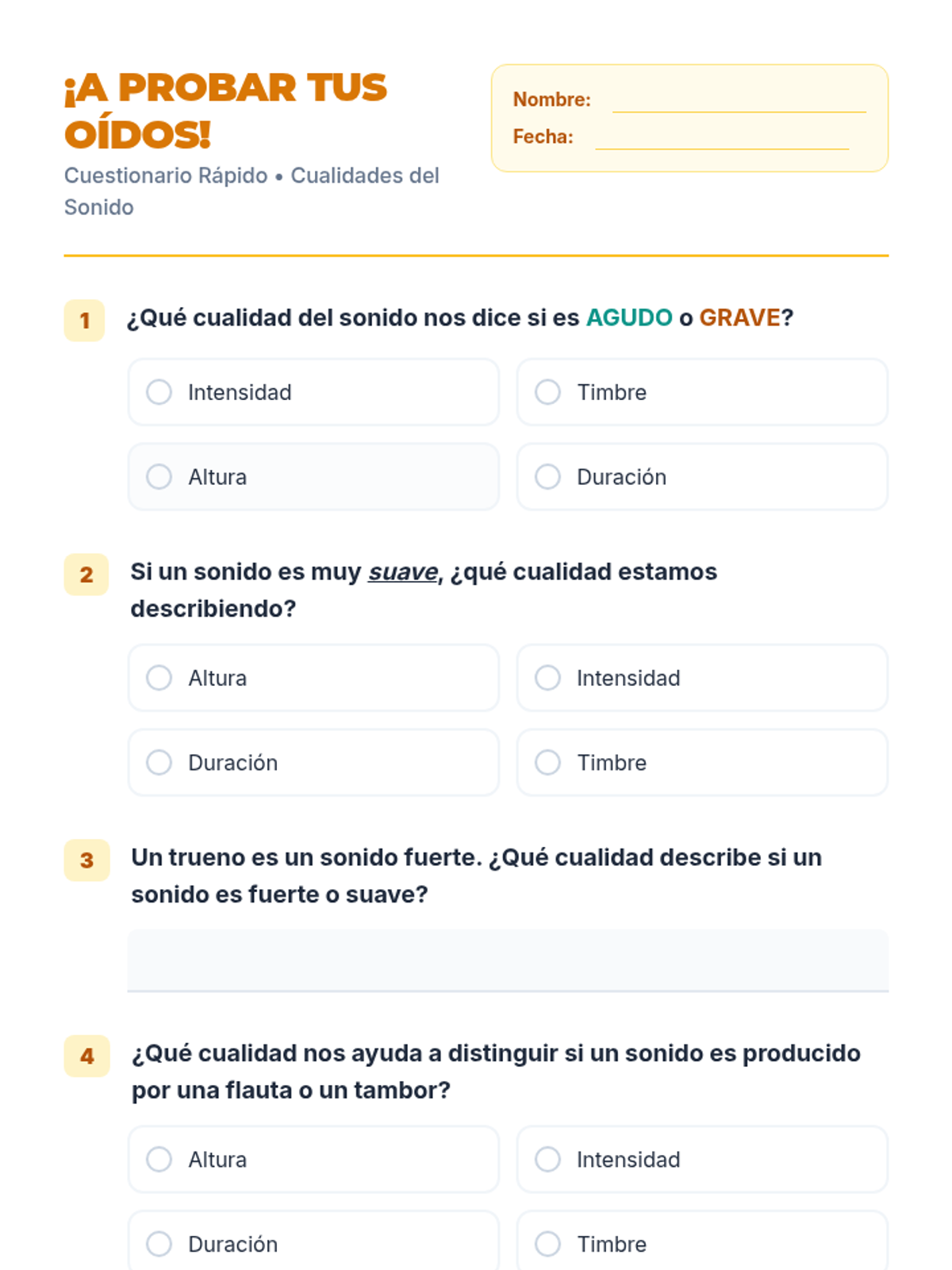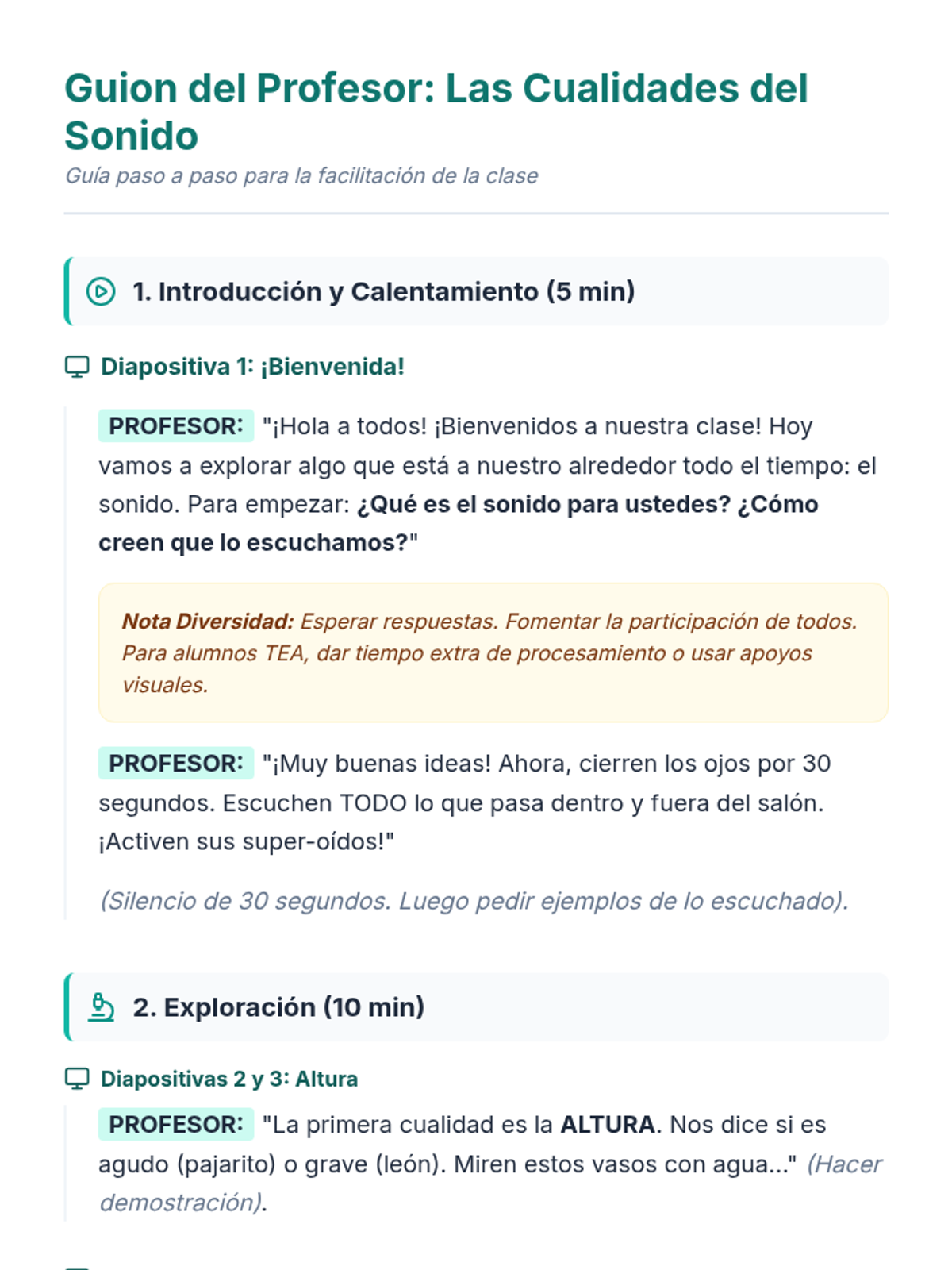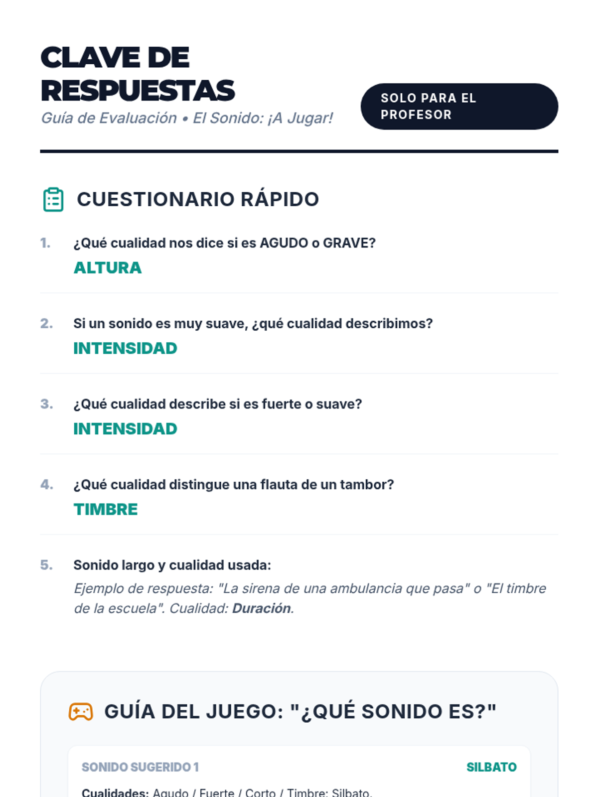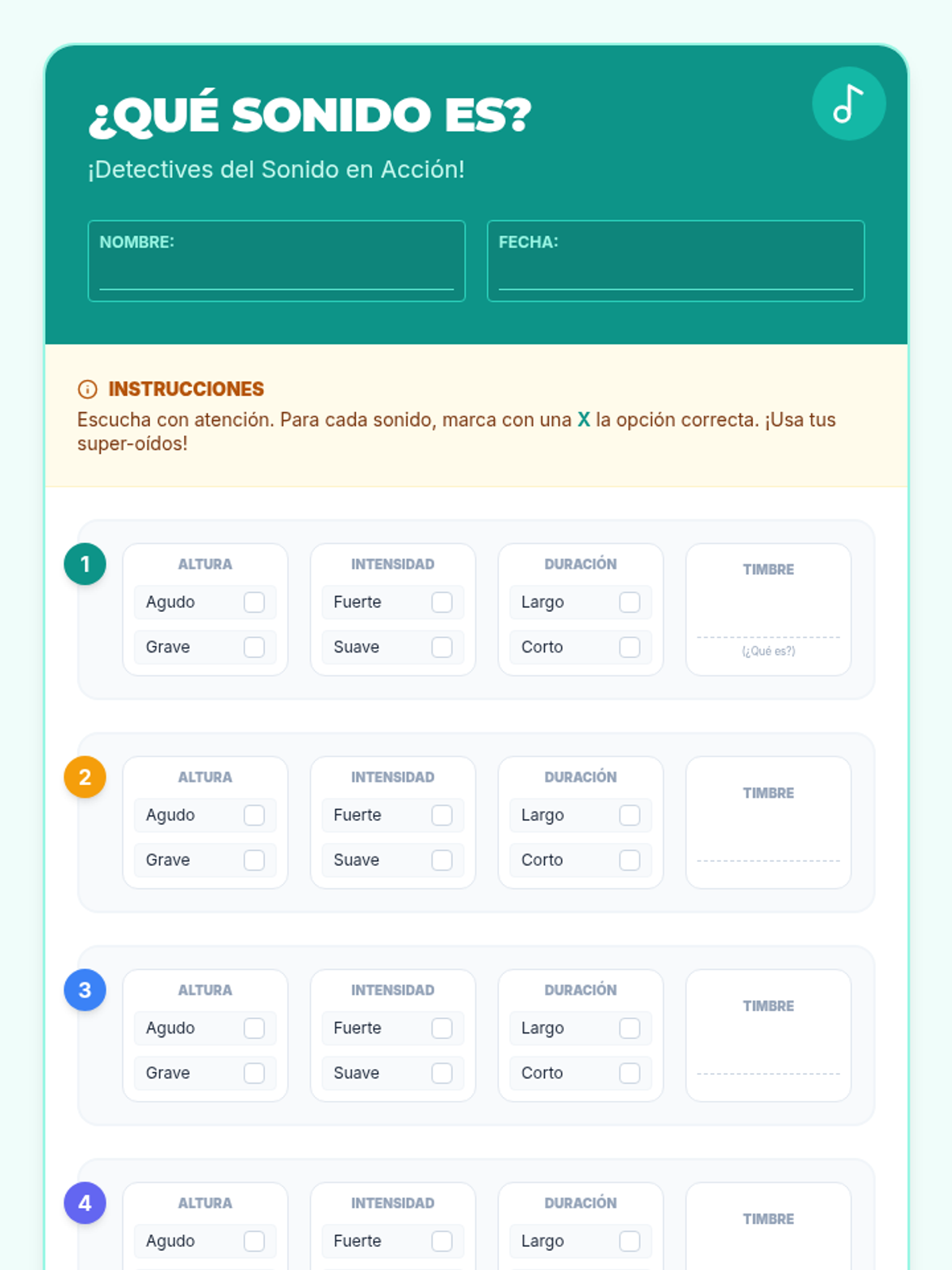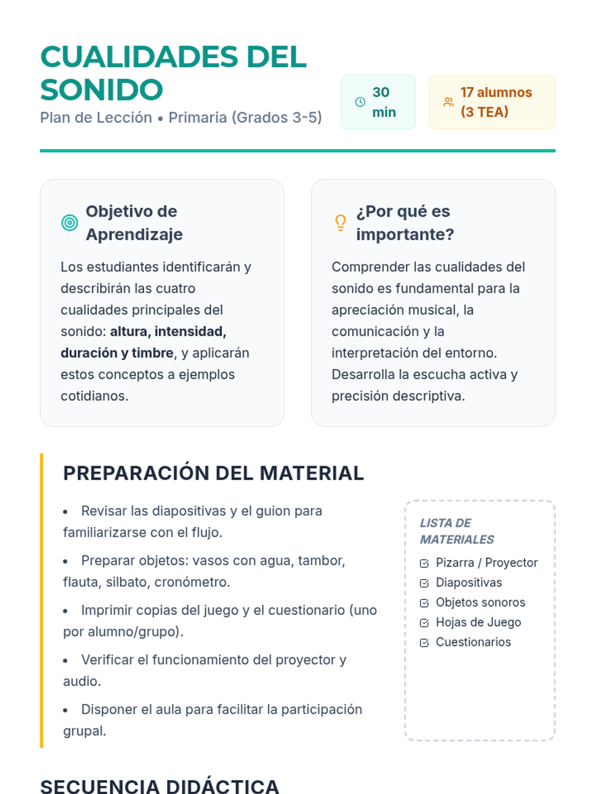 Una lección interactiva de 30 minutos para introducir a los estudiantes de primaria en las cuatro cualidades del sonido: altura, intensidad, duración y timbre, mediante experimentos prácticos y un juego auditivo.