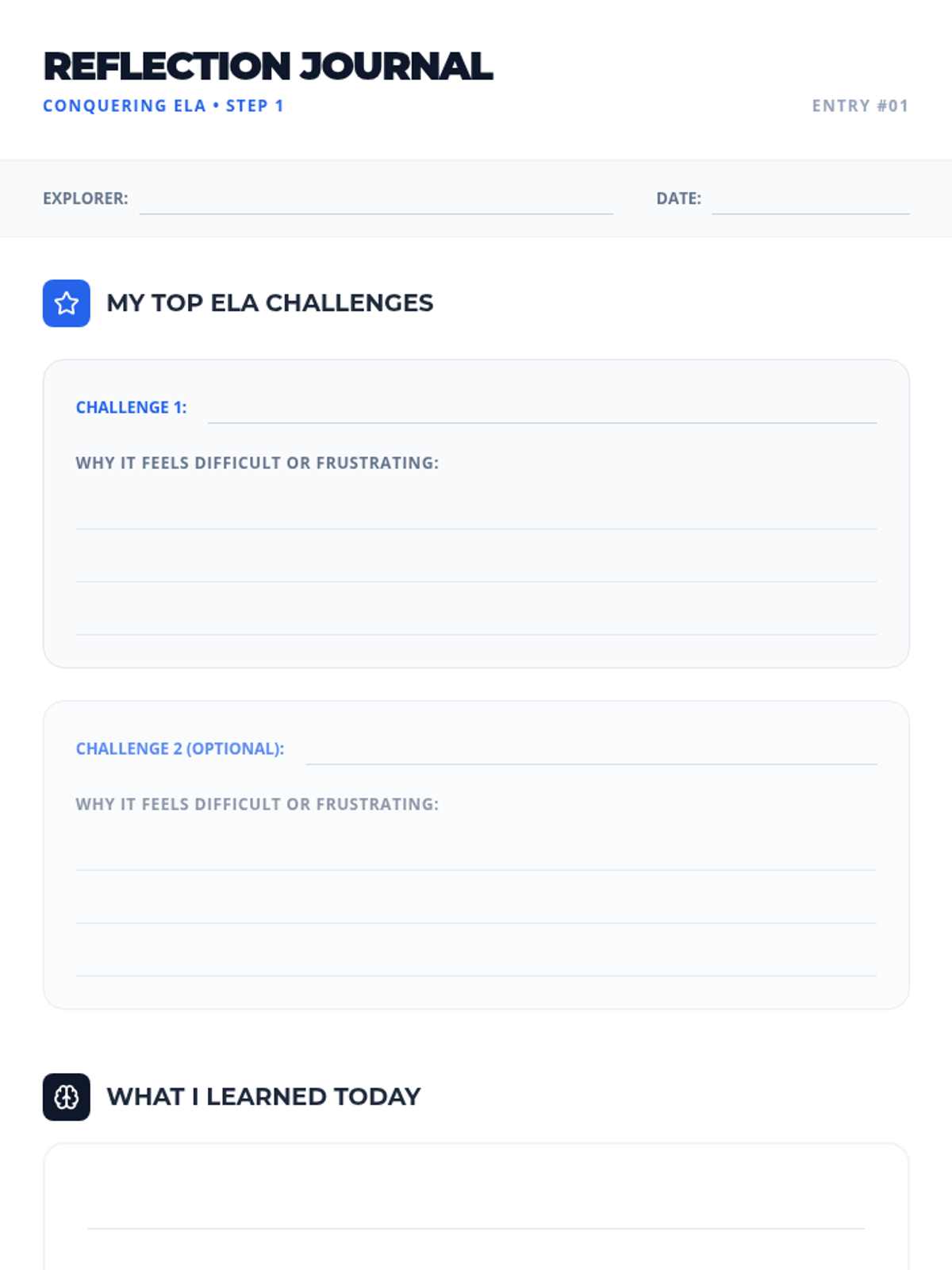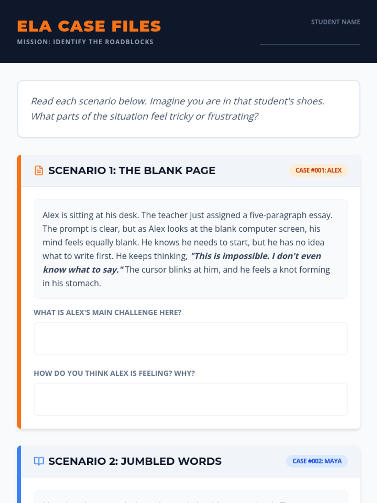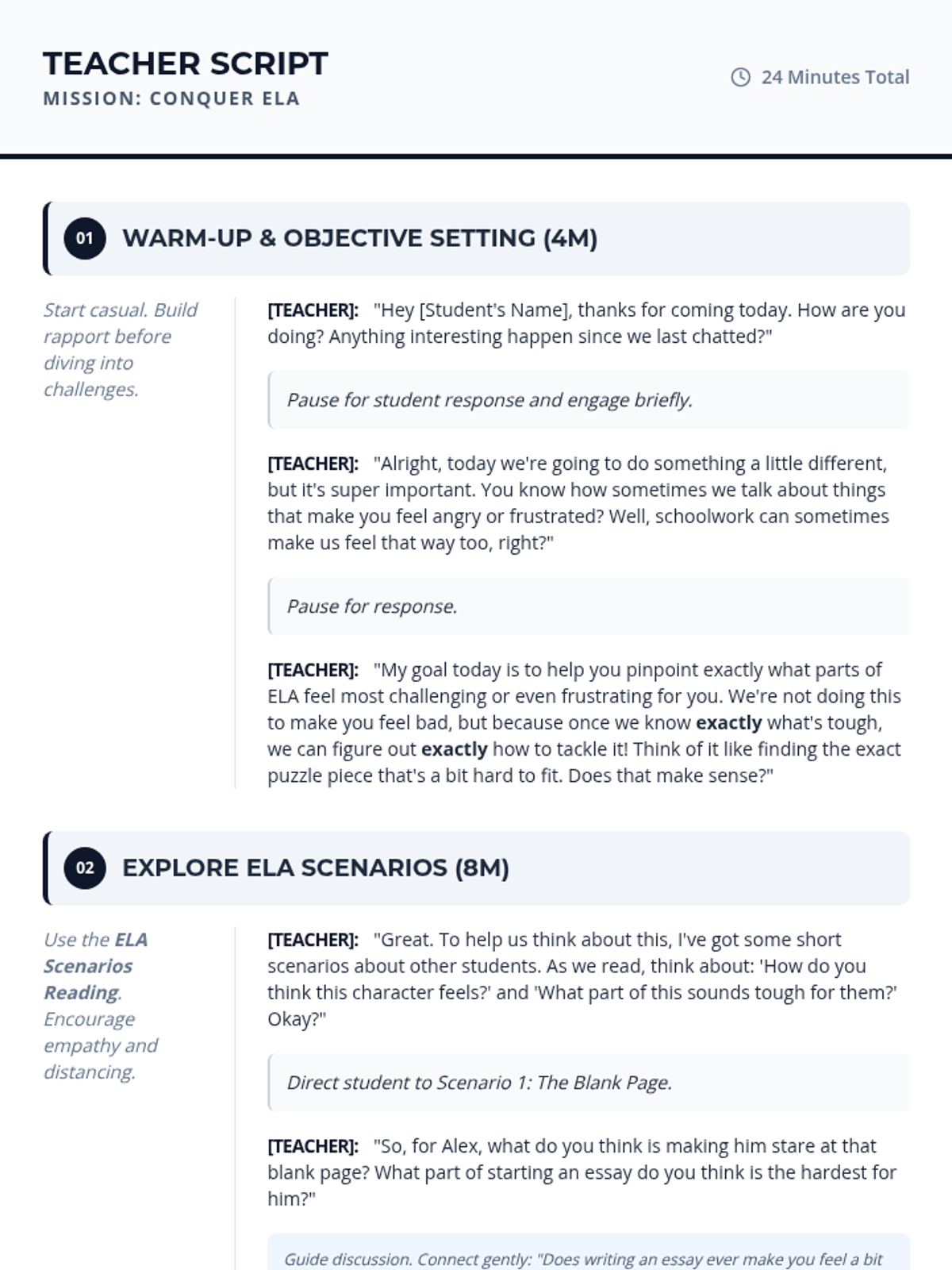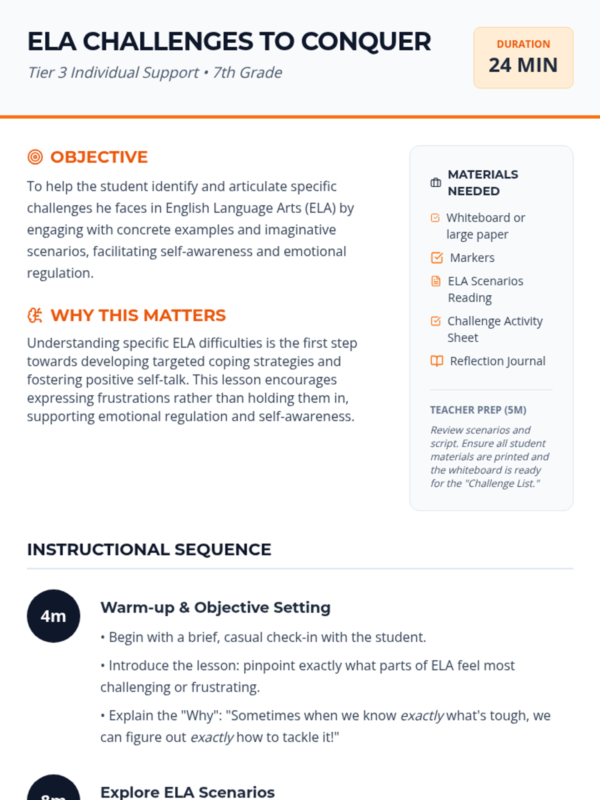A 24-minute Tier 3 individual session for a 7th-grade student to identify specific ELA challenges through scenarios, building self-awareness and laying the groundwork for positive self-talk strategies.