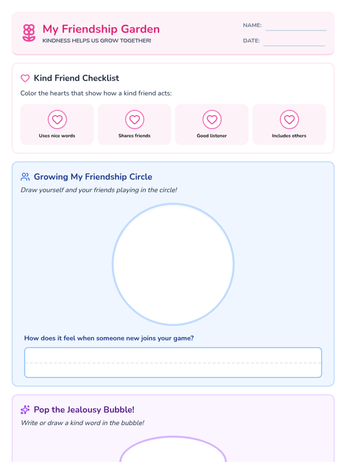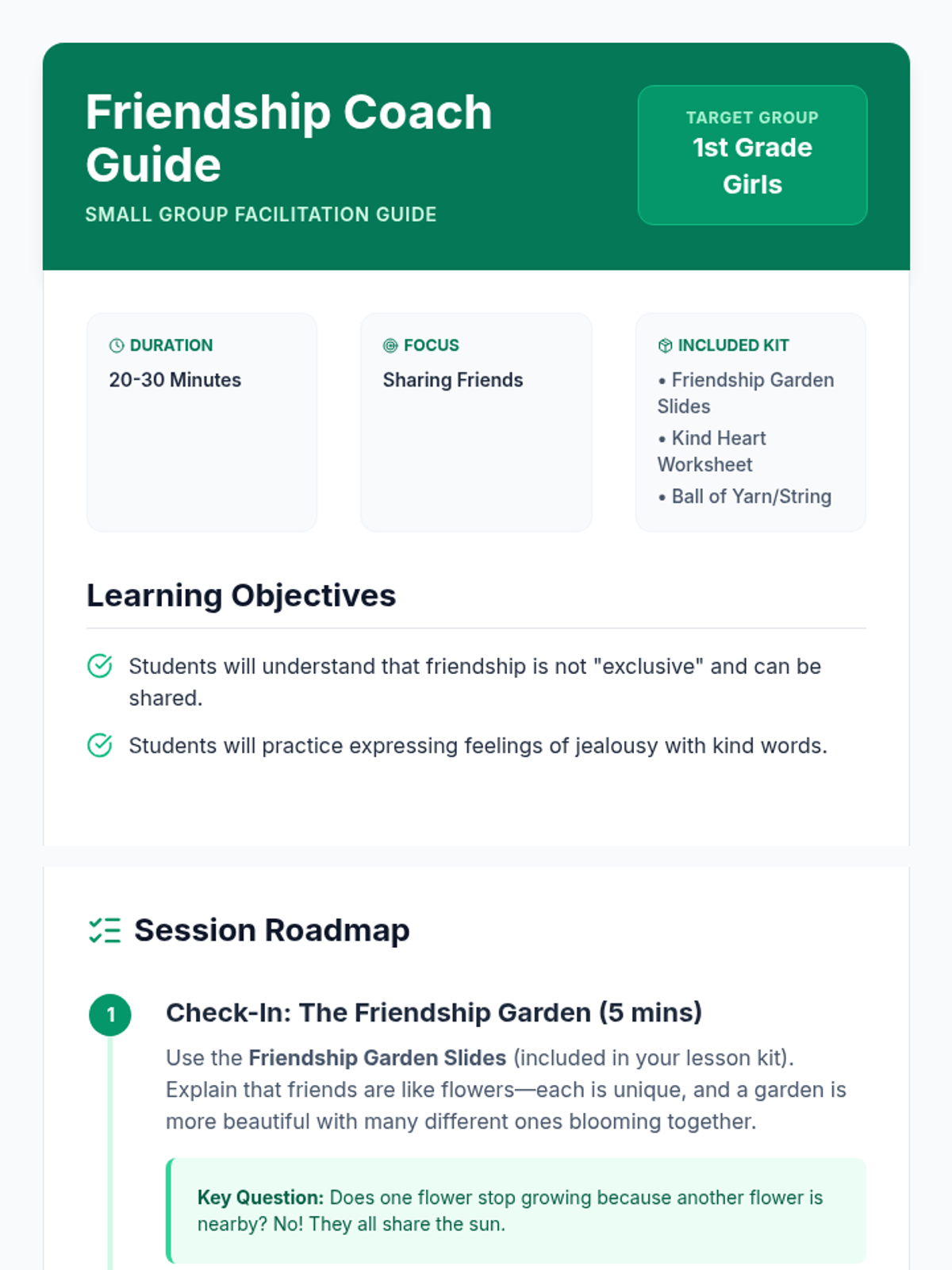 A small group guidance lesson for first-grade girls focused on managing jealousy, sharing friends, and practicing kindness in social circles.