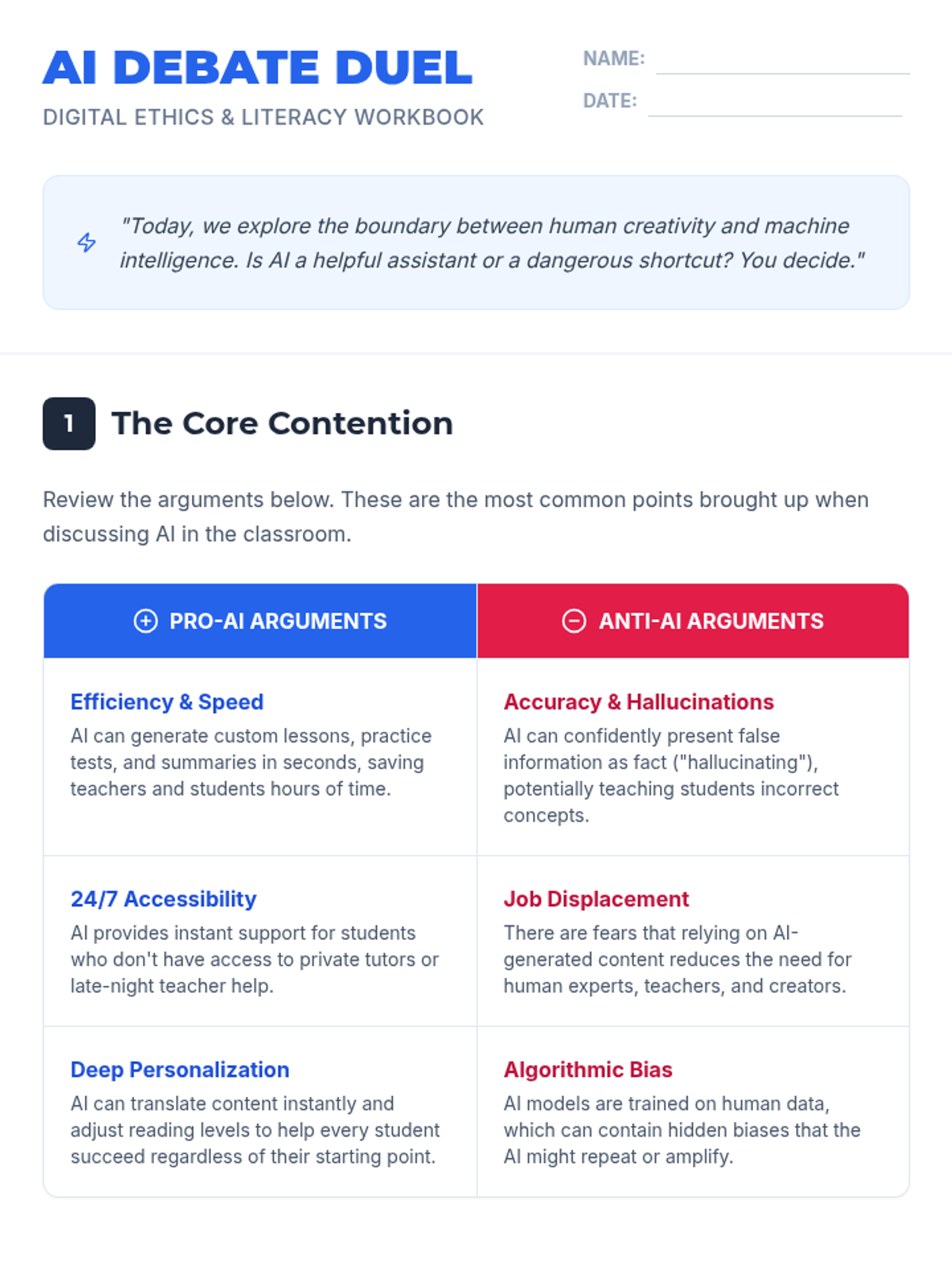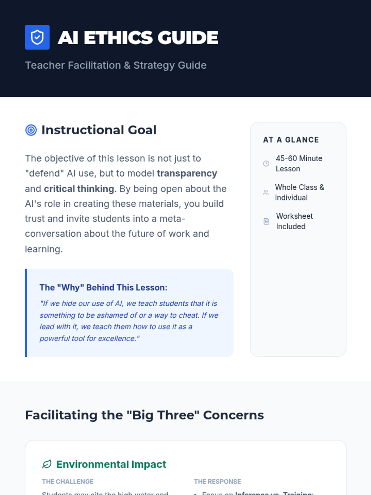 A lesson exploring the ethics and utility of AI-generated educational content, addressing common concerns like environmental impact and job displacement while highlighting the benefits of personalization and accessibility.