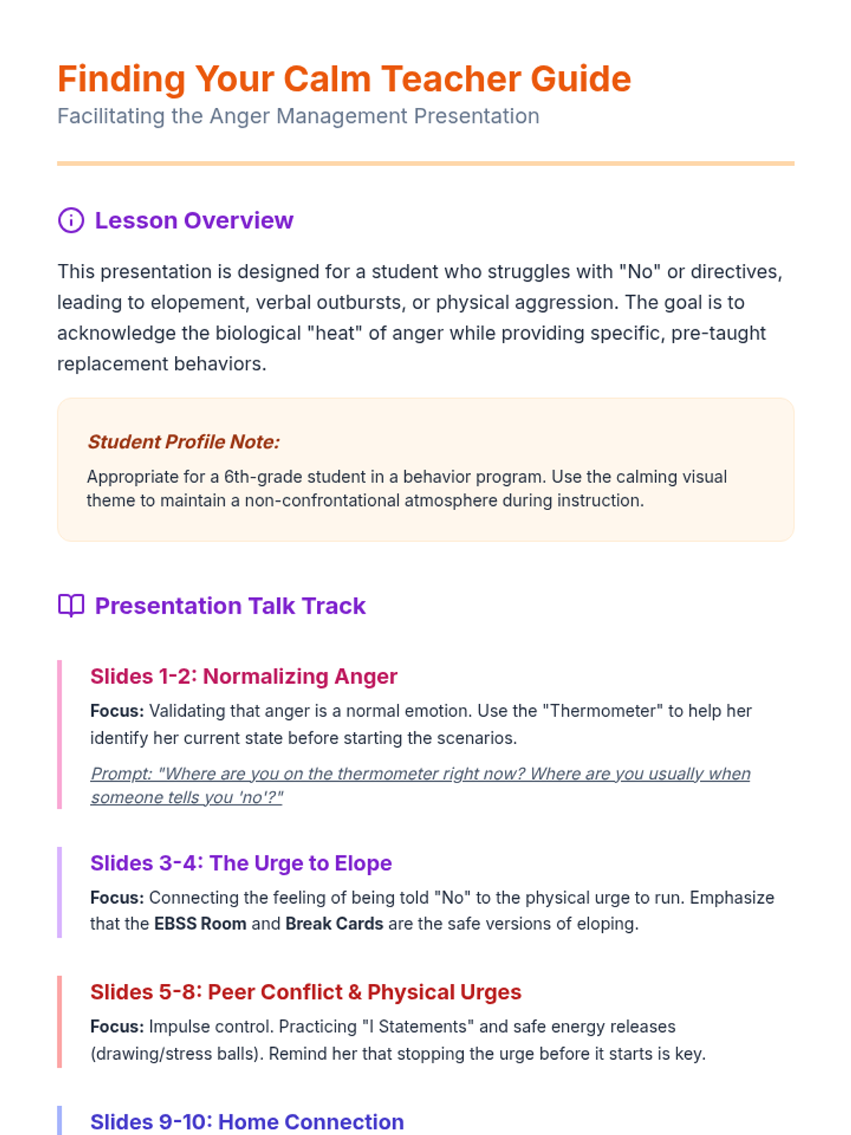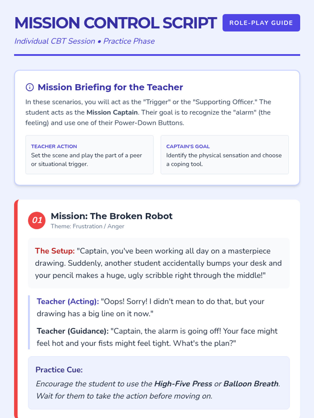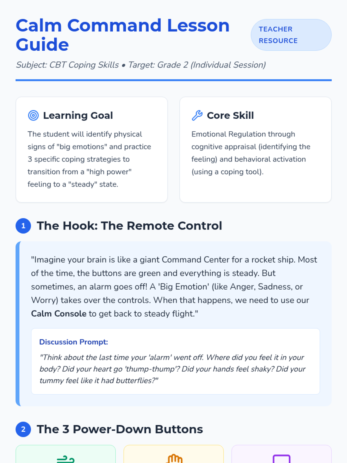 A CBT-based individual lesson for 2nd graders to help them identify big emotions and utilize effective coping strategies to regain calm.