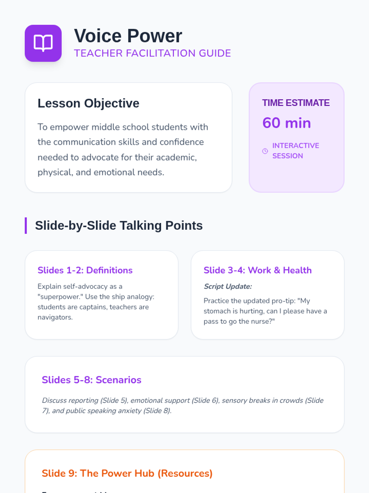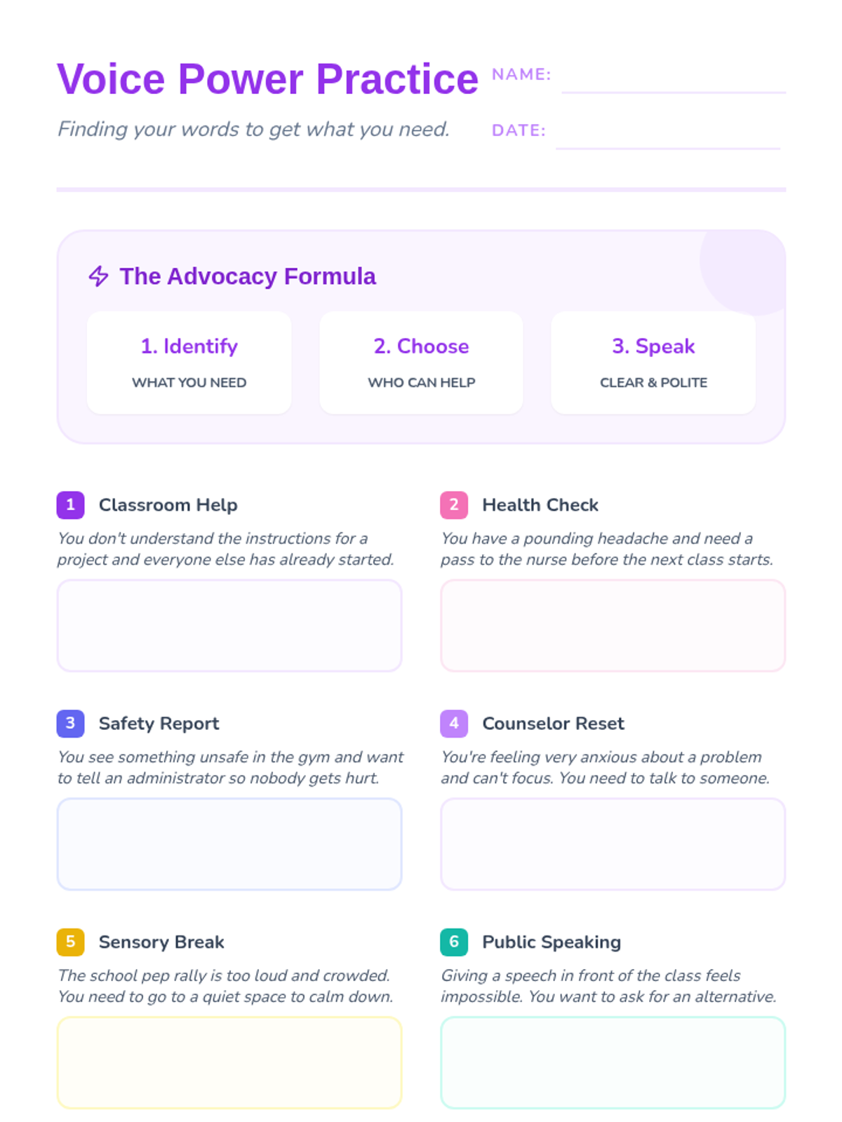 A middle school lesson focused on teaching students how to advocate for their needs across various school settings, from requesting academic help to seeking emotional support.