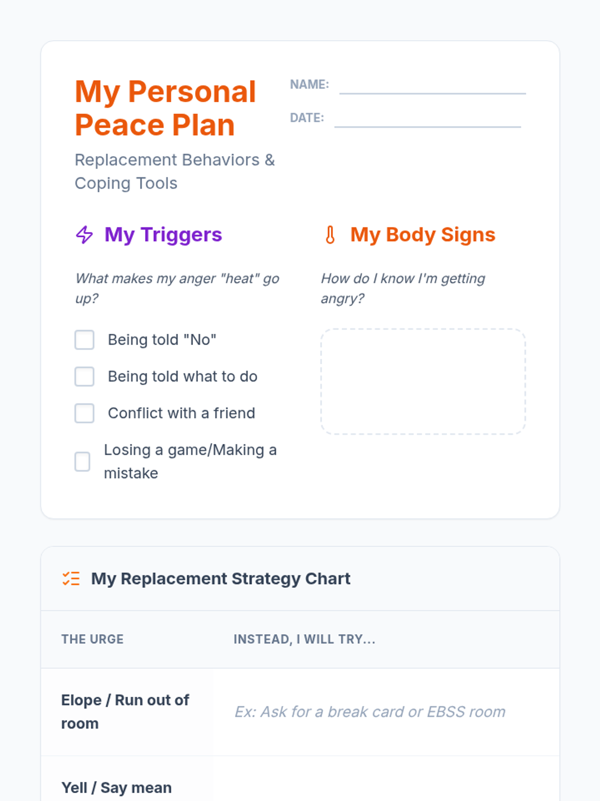 A visual and instructional lesson designed to help a student navigate anger triggers, particularly being told 'no' or experiencing conflict, by identifying urges and replacing them with grounding techniques and coping skills.