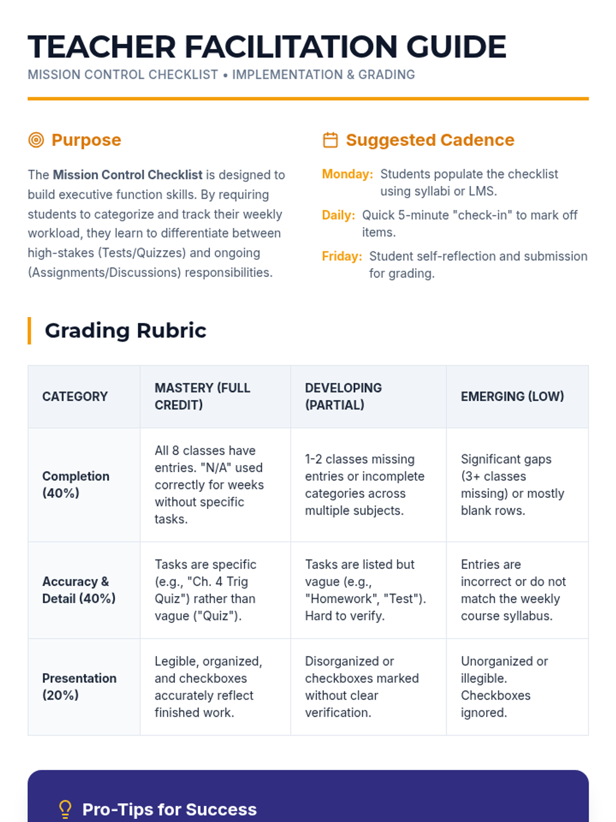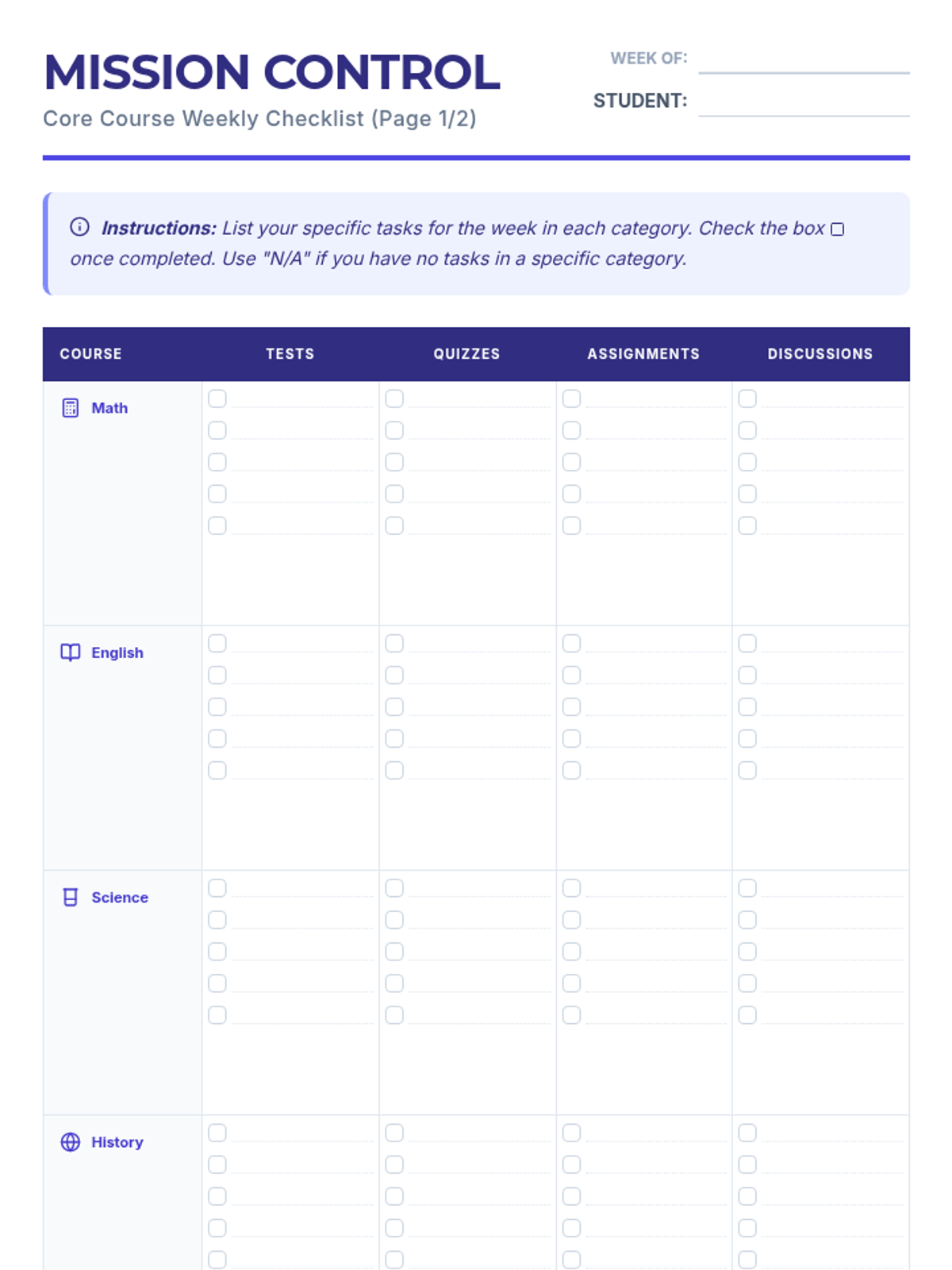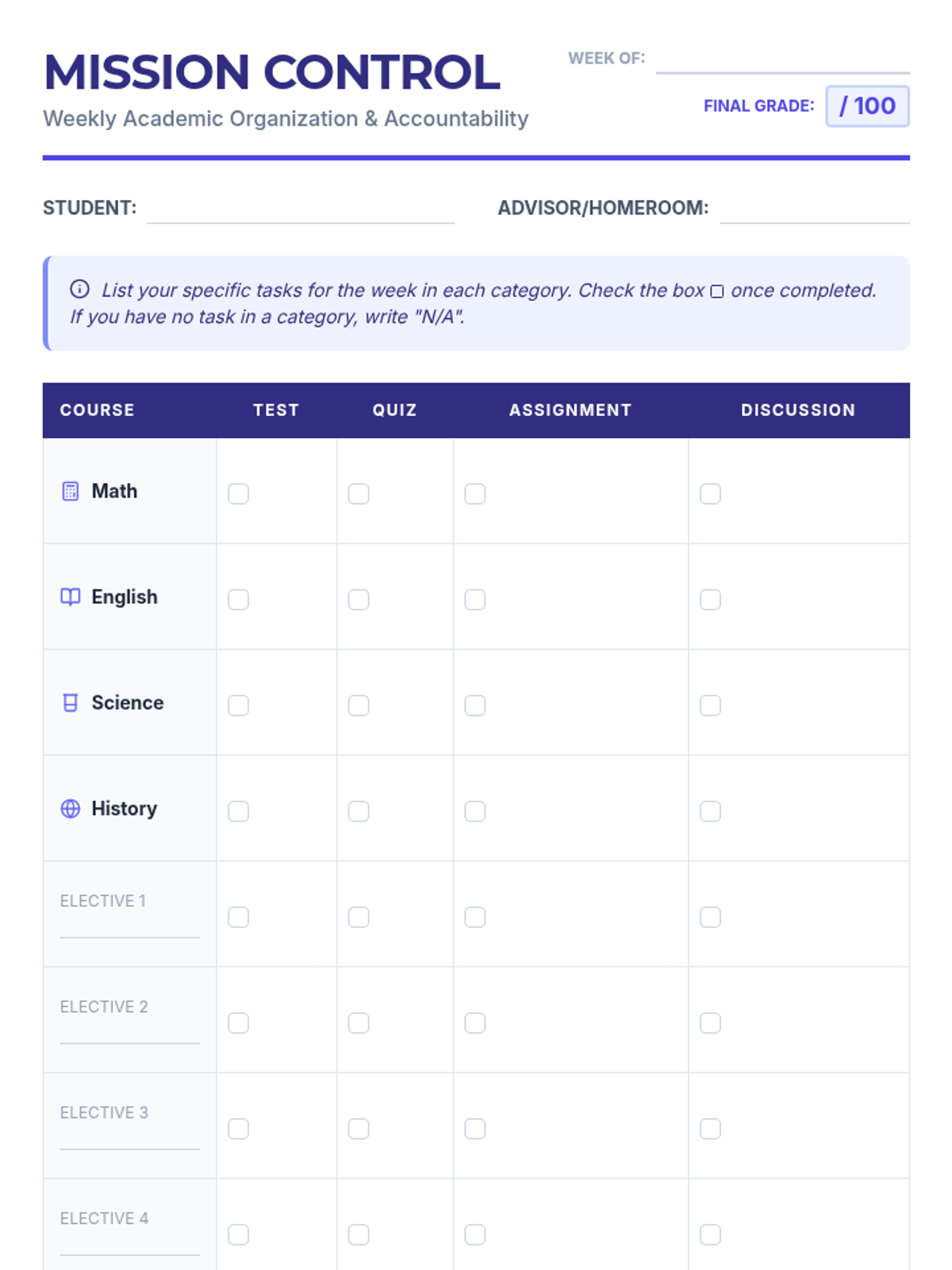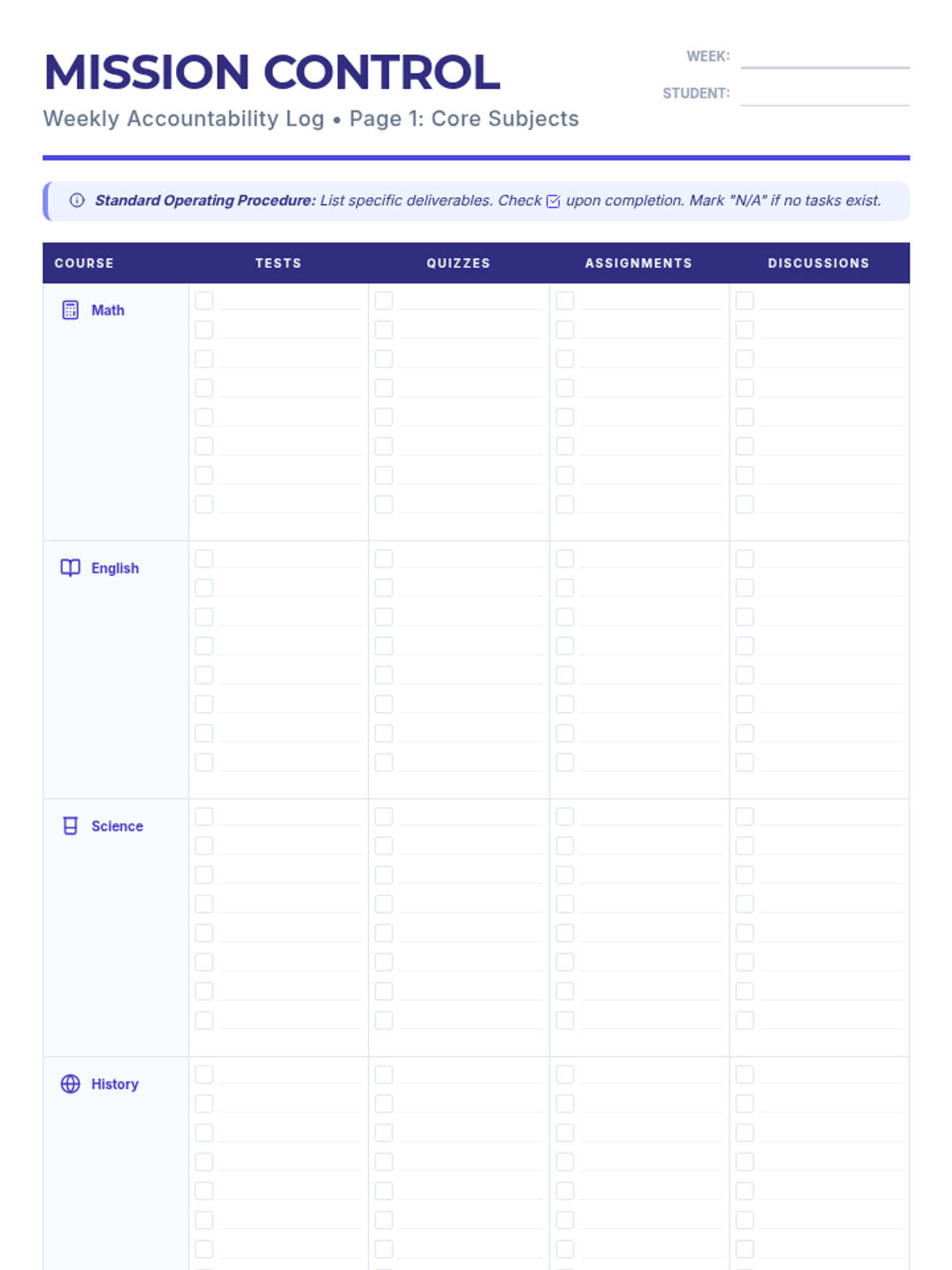 A comprehensive system for student organization and accountability, featuring a weekly tracking tool for 8 core and elective courses.