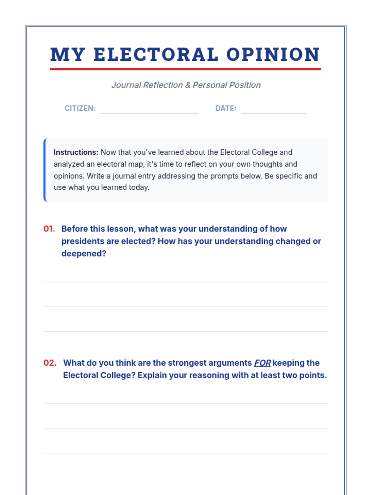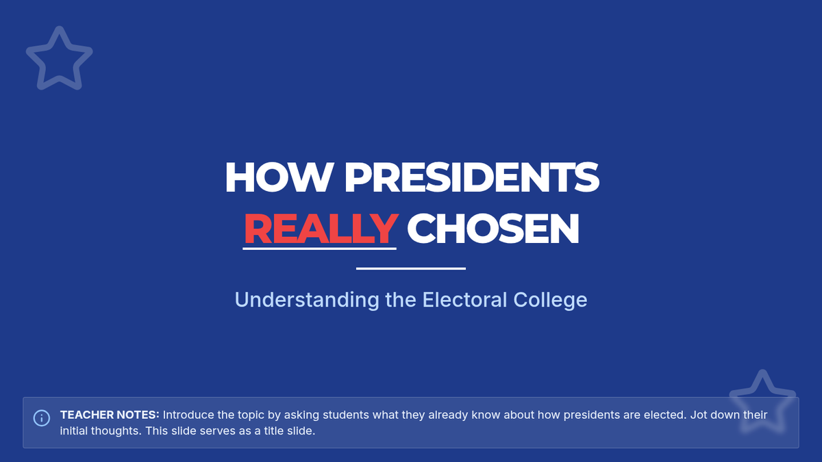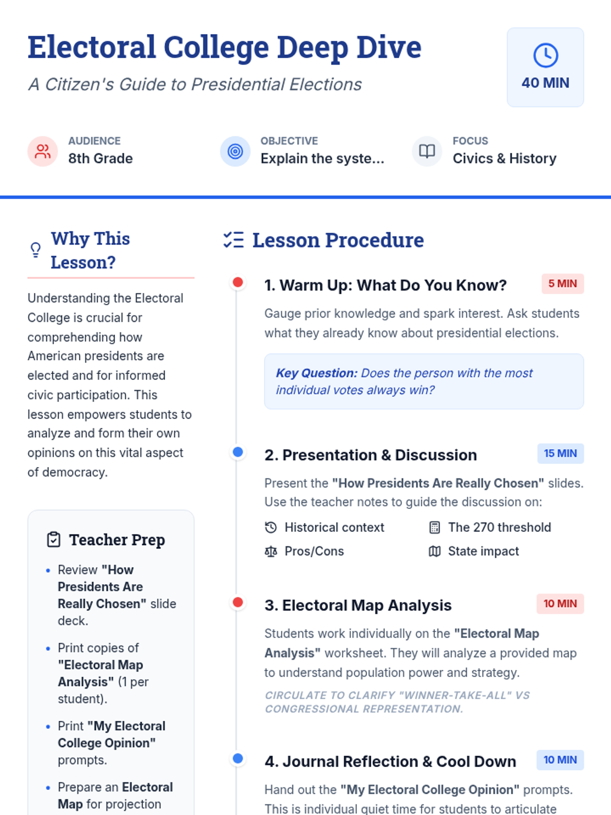 A focused 40-minute lesson for 8th graders on the history, mechanics, and debates surrounding the Electoral College system in American democracy.
