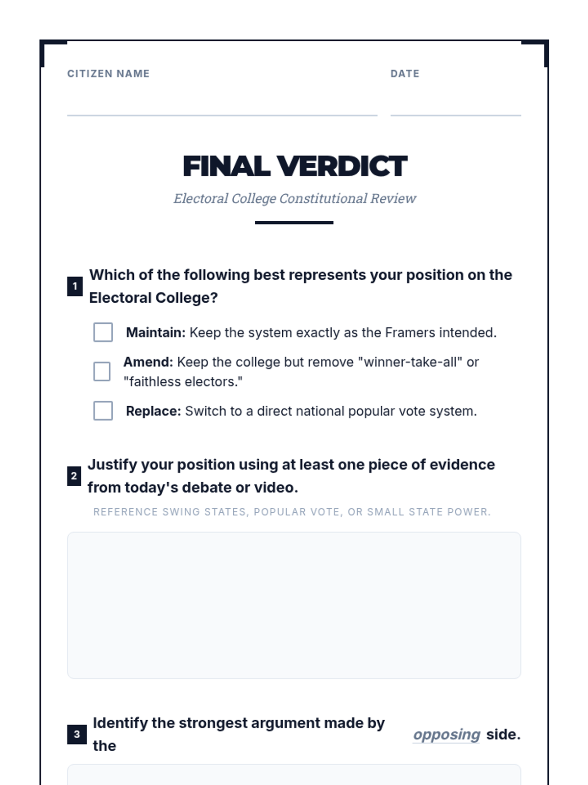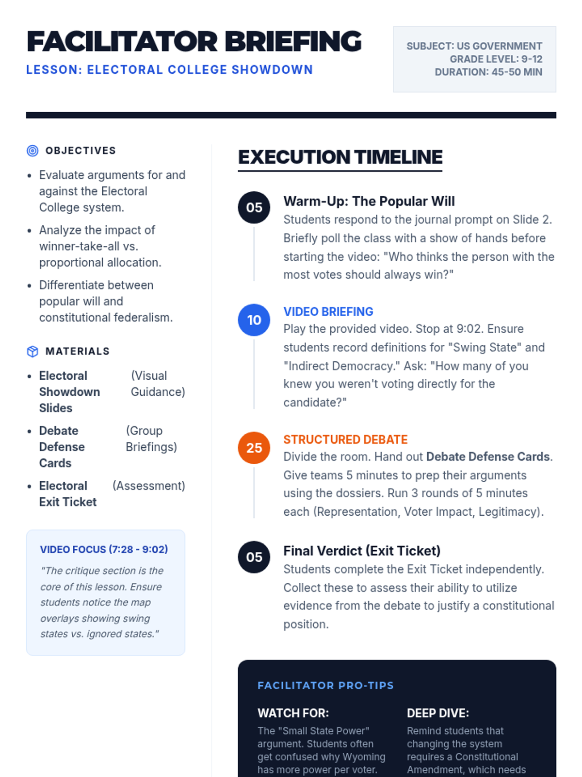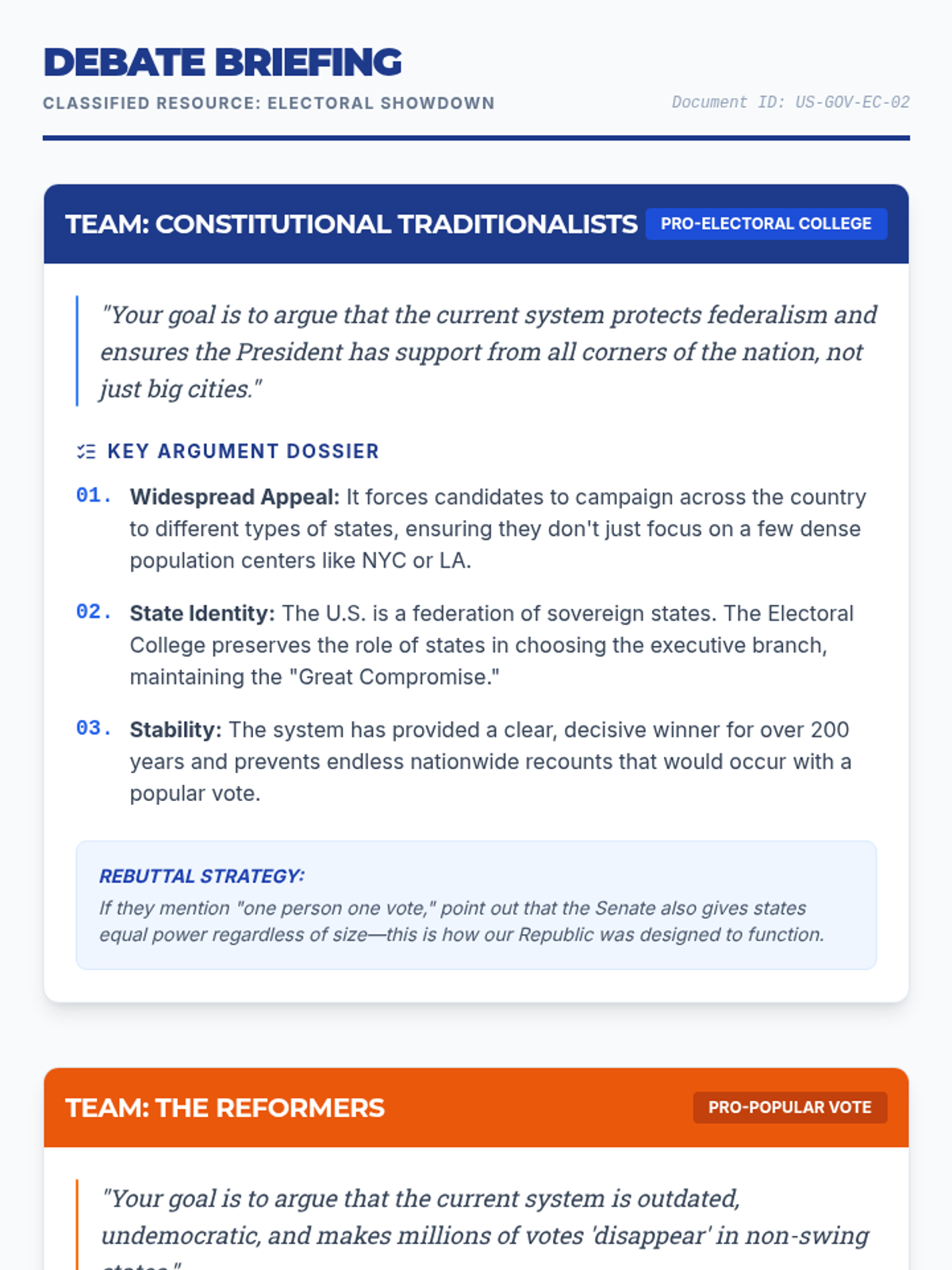 A high-stakes debate lesson where students analyze the mechanics and fairness of the Electoral College, culminating in a structured argument between Constitutional Traditionalists and Reformers.
