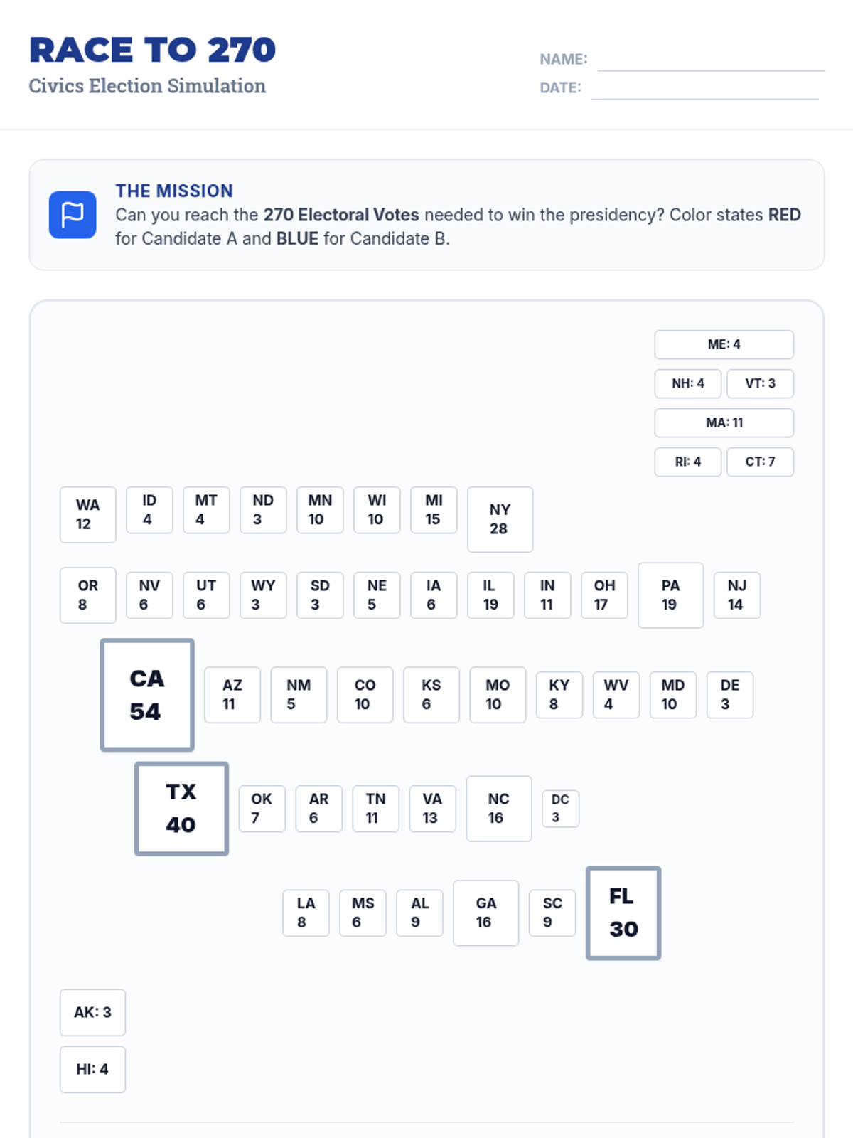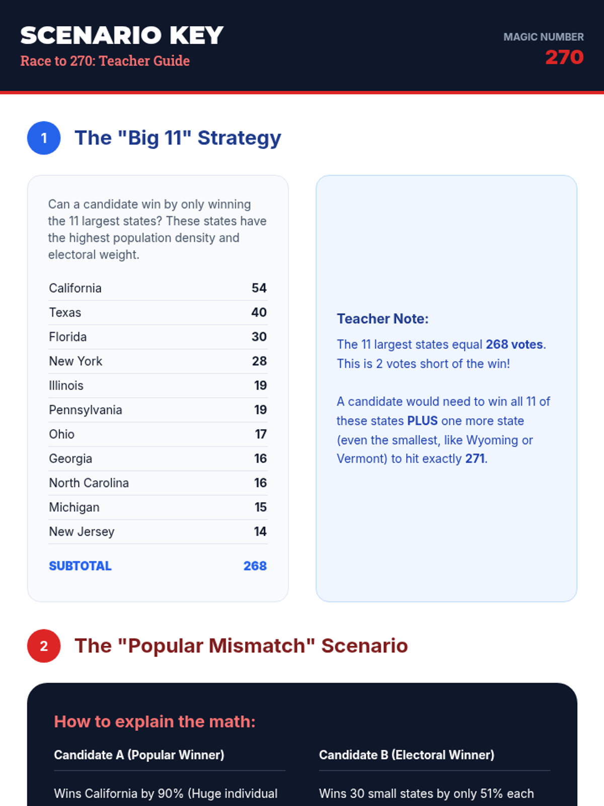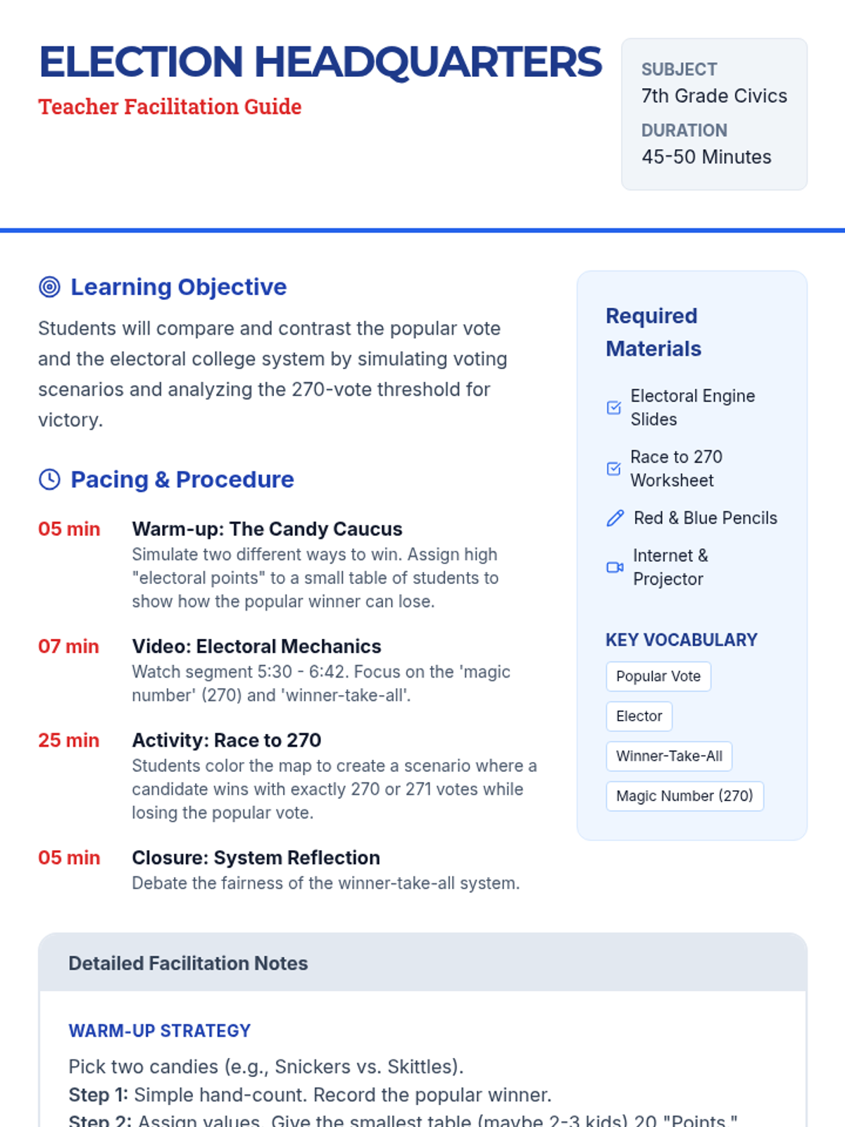 Students explore the differences between the popular vote and the Electoral College through a candy poll simulation, a targeted video analysis, and a 'Race to 270' mapping activity where they simulate election scenarios.