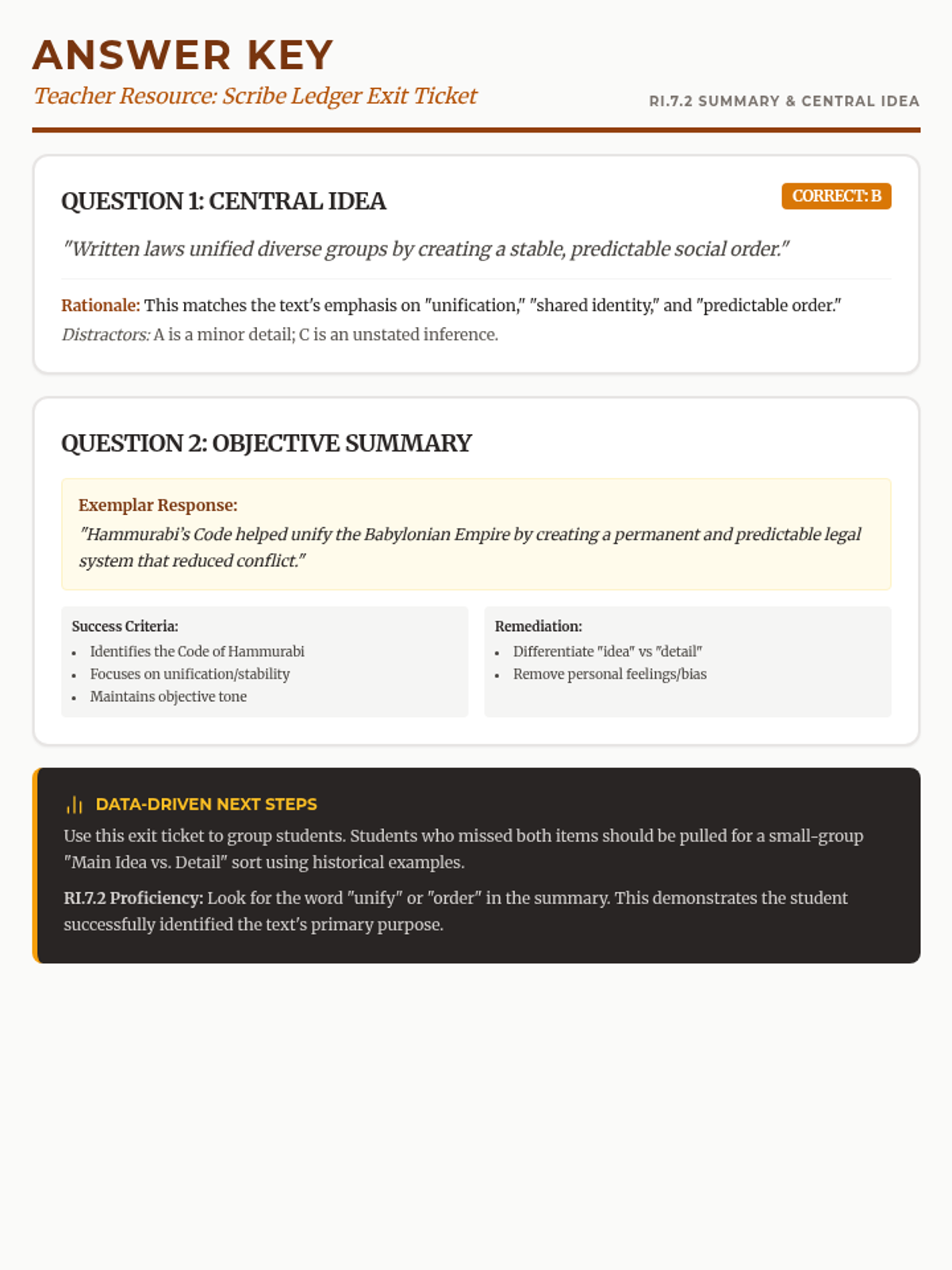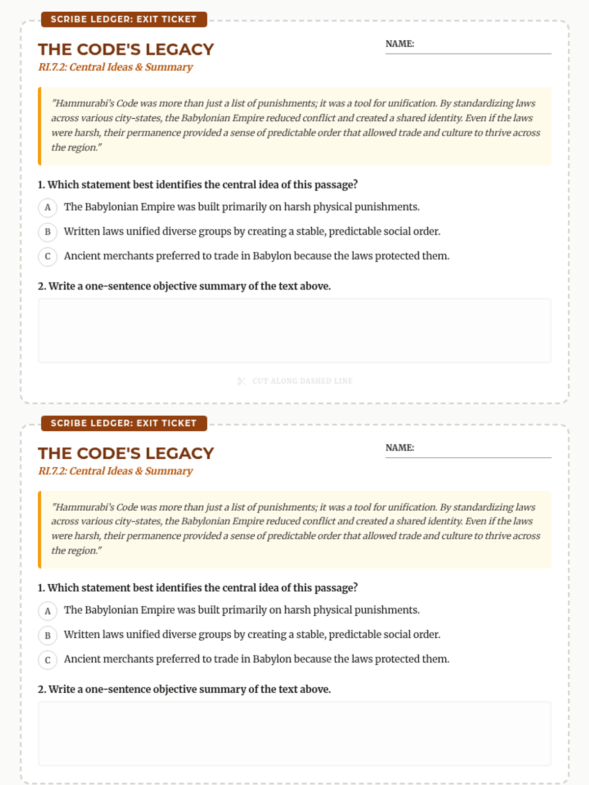 A quick bell-ringer activity focused on identifying central ideas and summarizing key concepts about Ancient Mesopotamia.