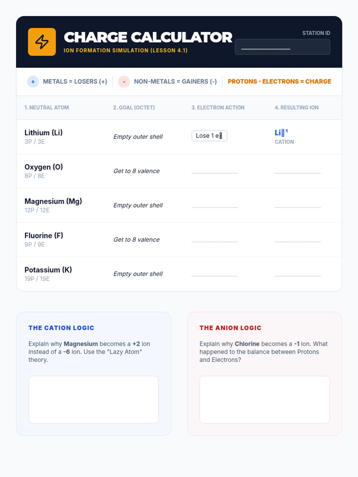 Students predict the formation of cations and anions based on an atom's need to satisfy the octet rule.