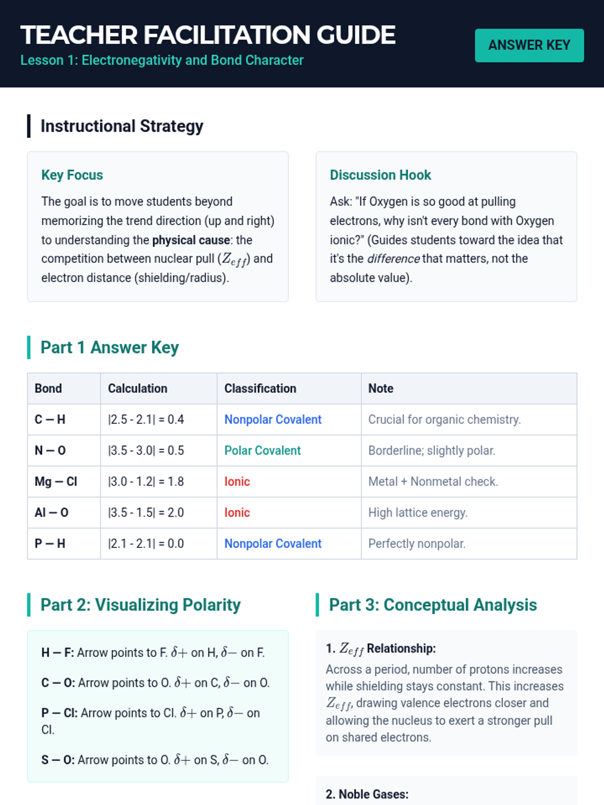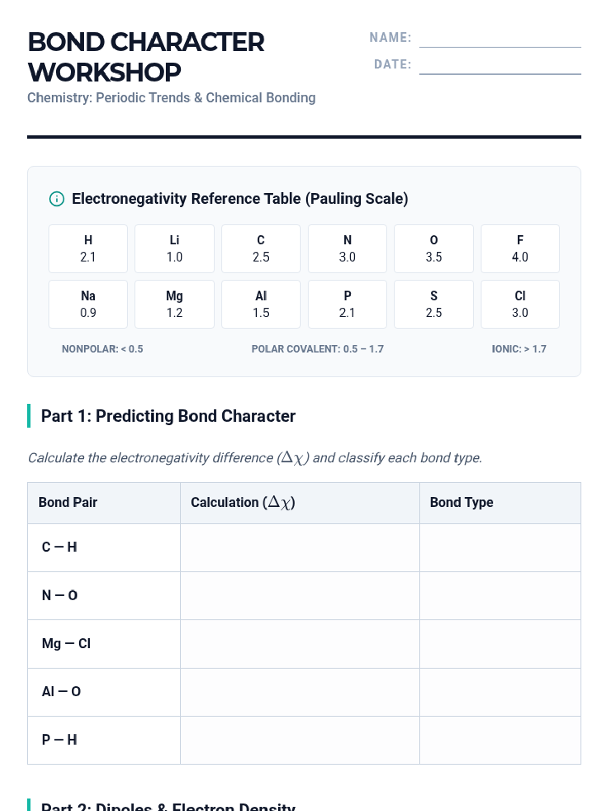 Students explore electronegativity through the Pauling scale, correlating it with effective nuclear charge and atomic radius to predict bond polarity and character.