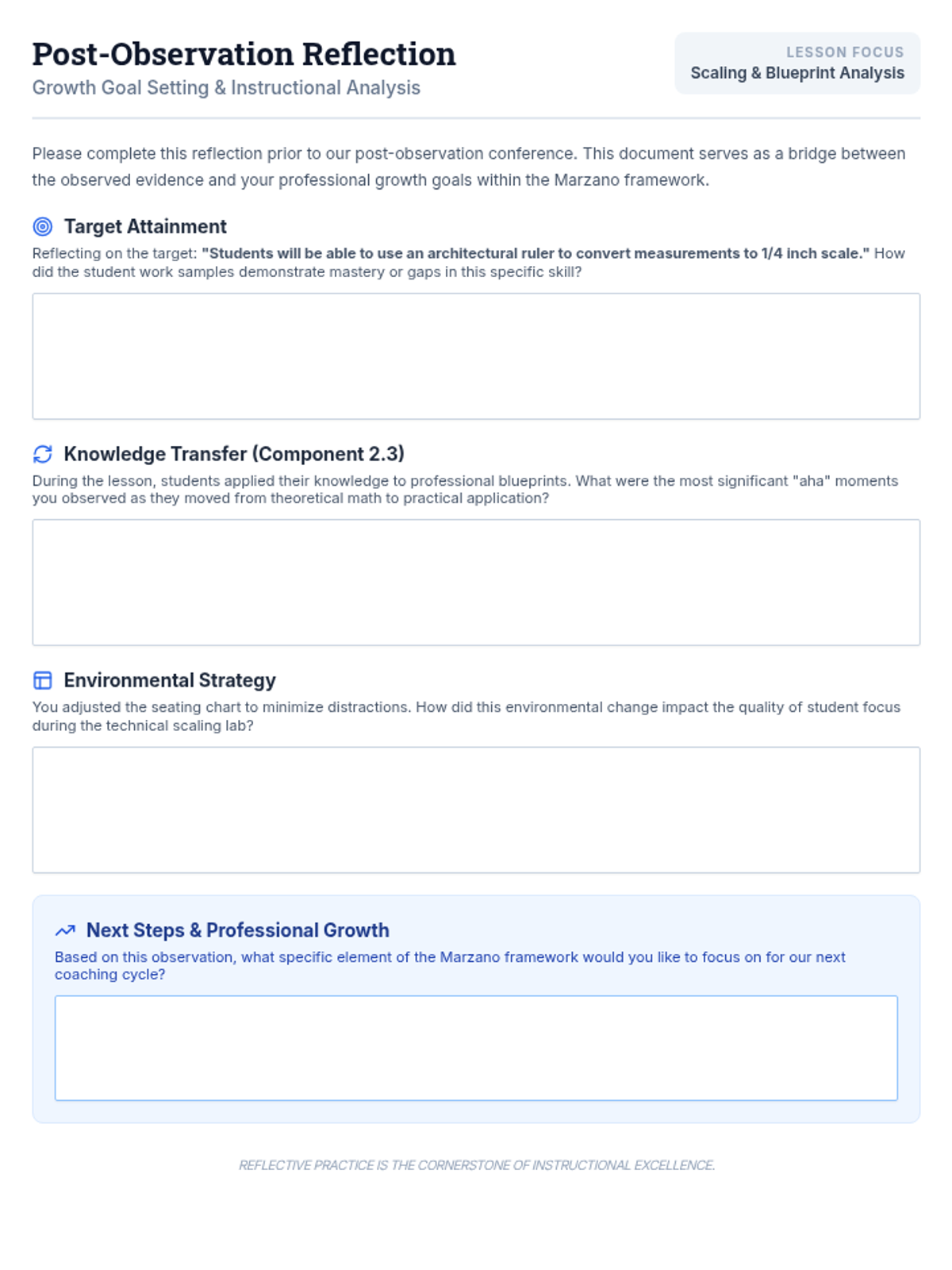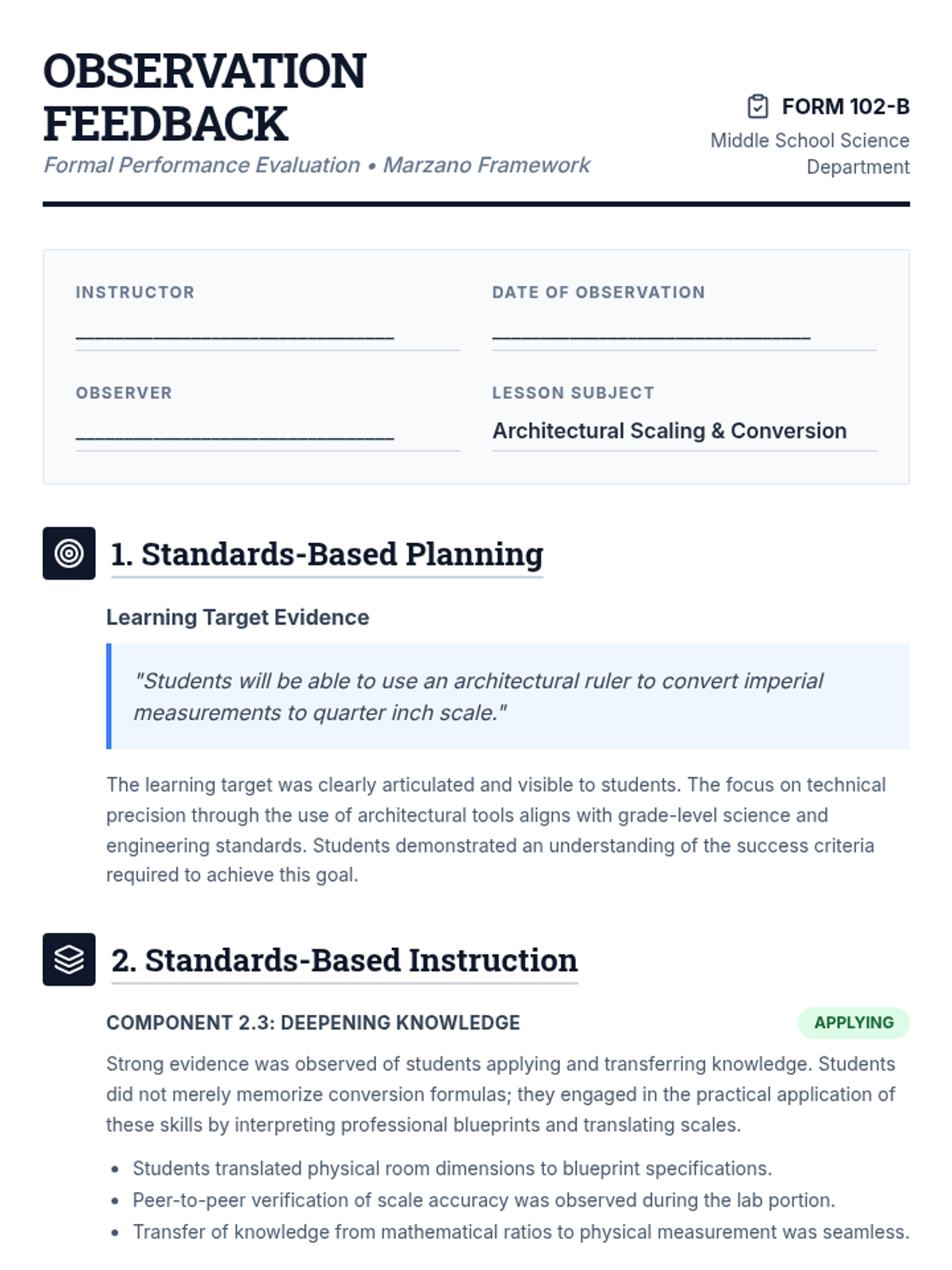 A comprehensive teacher evaluation suite focused on an architectural scaling lesson, incorporating the Marzano framework for formal feedback and professional growth.