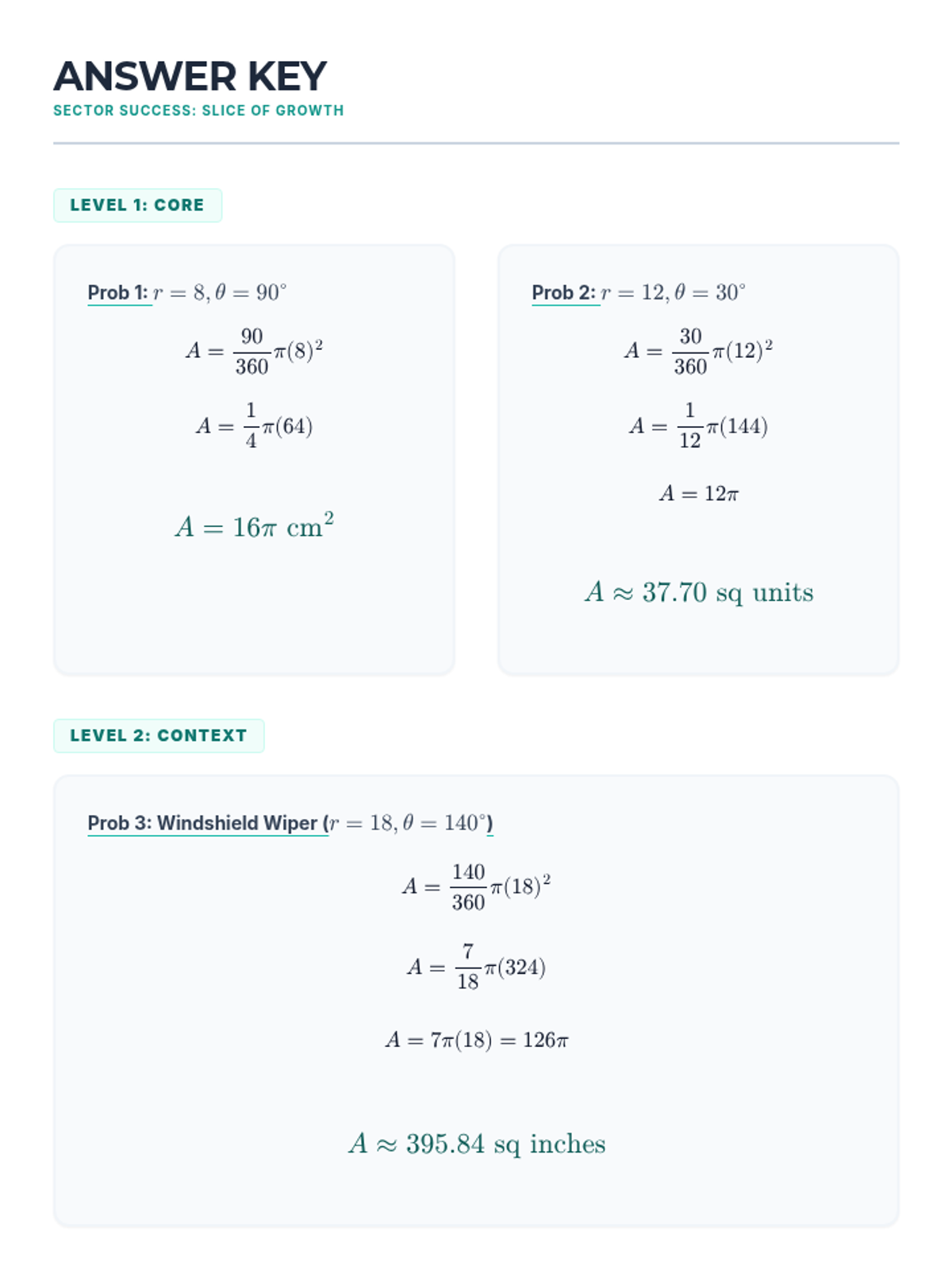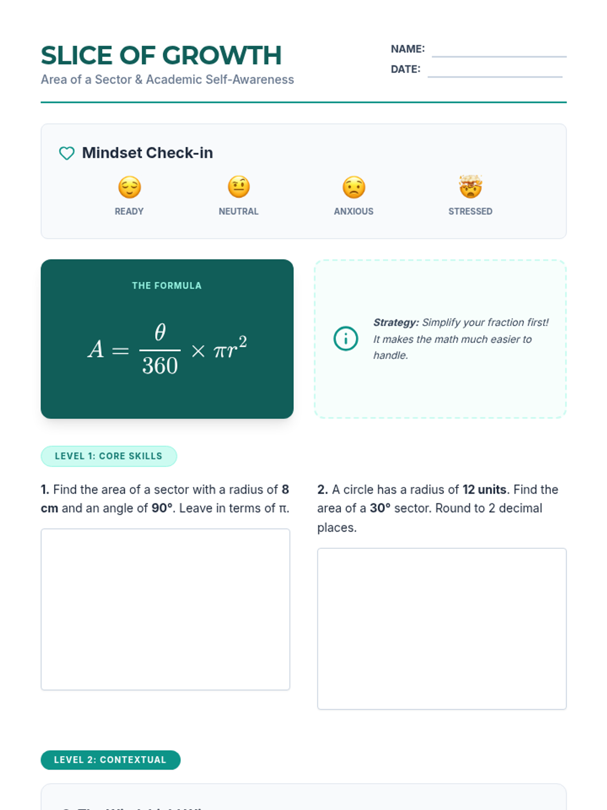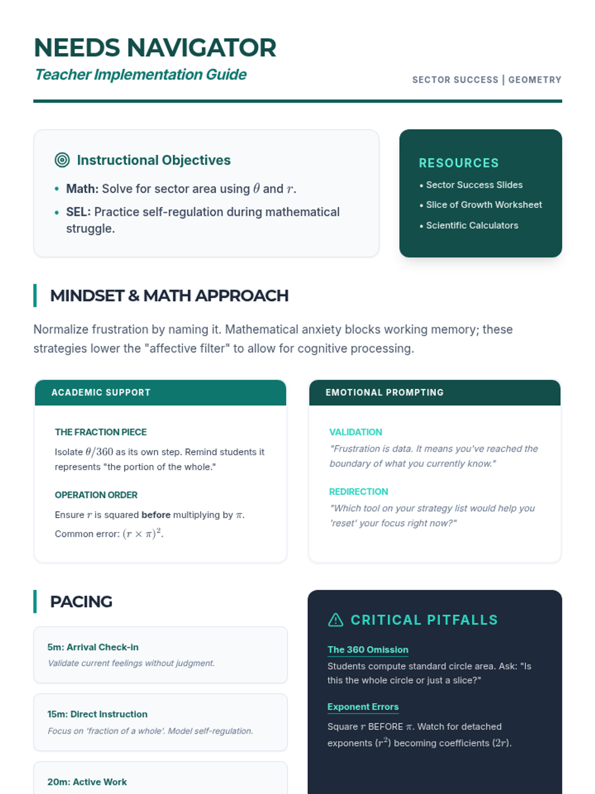 A geometry lesson that balances rigorous academic instruction on calculating the area of a sector with integrated social-emotional support strategies. Students learn the mathematical formula while practicing self-regulation and academic self-advocacy.