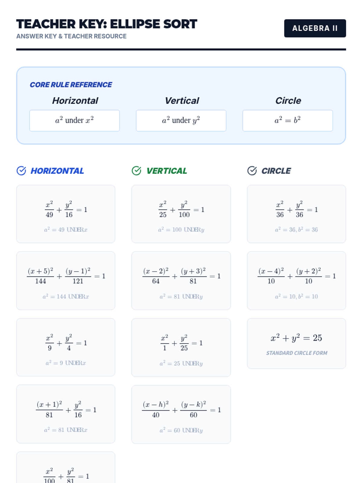 Students will learn to identify the orientation of an ellipse (horizontal vs. vertical) by analyzing standard form equations, focusing on the relationship between 'a' and 'b' and the role of the major axis.