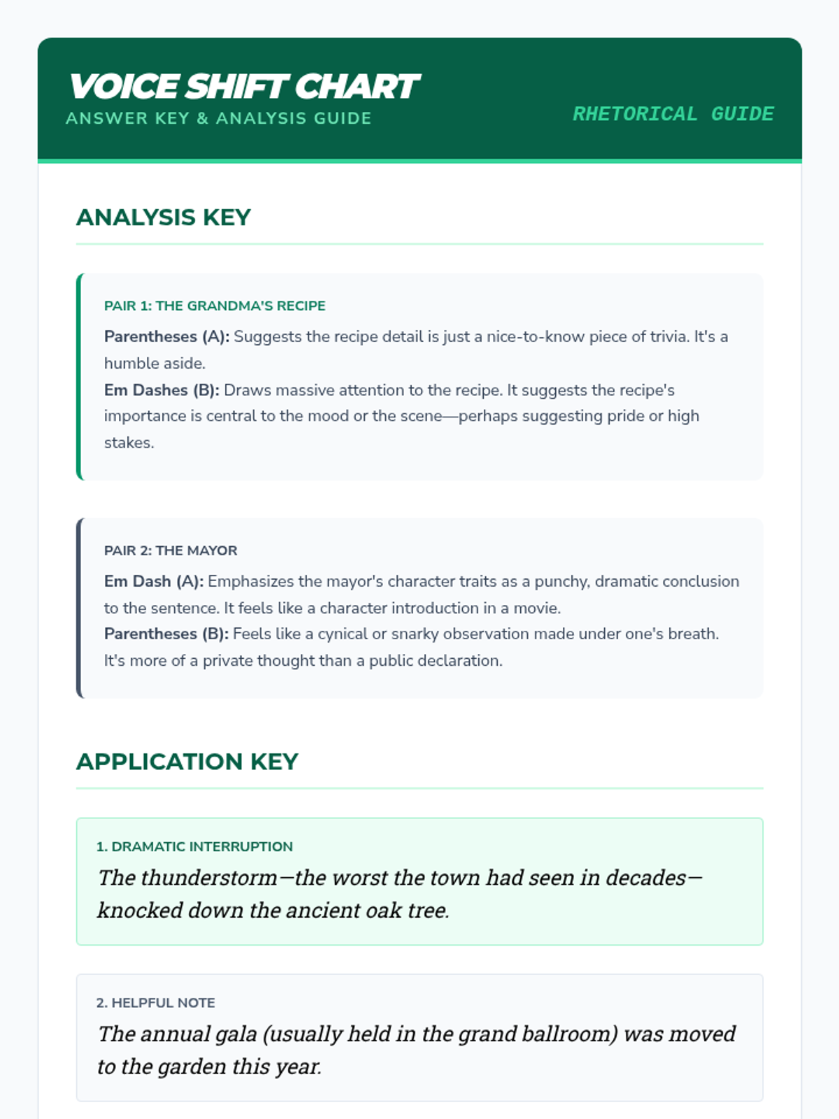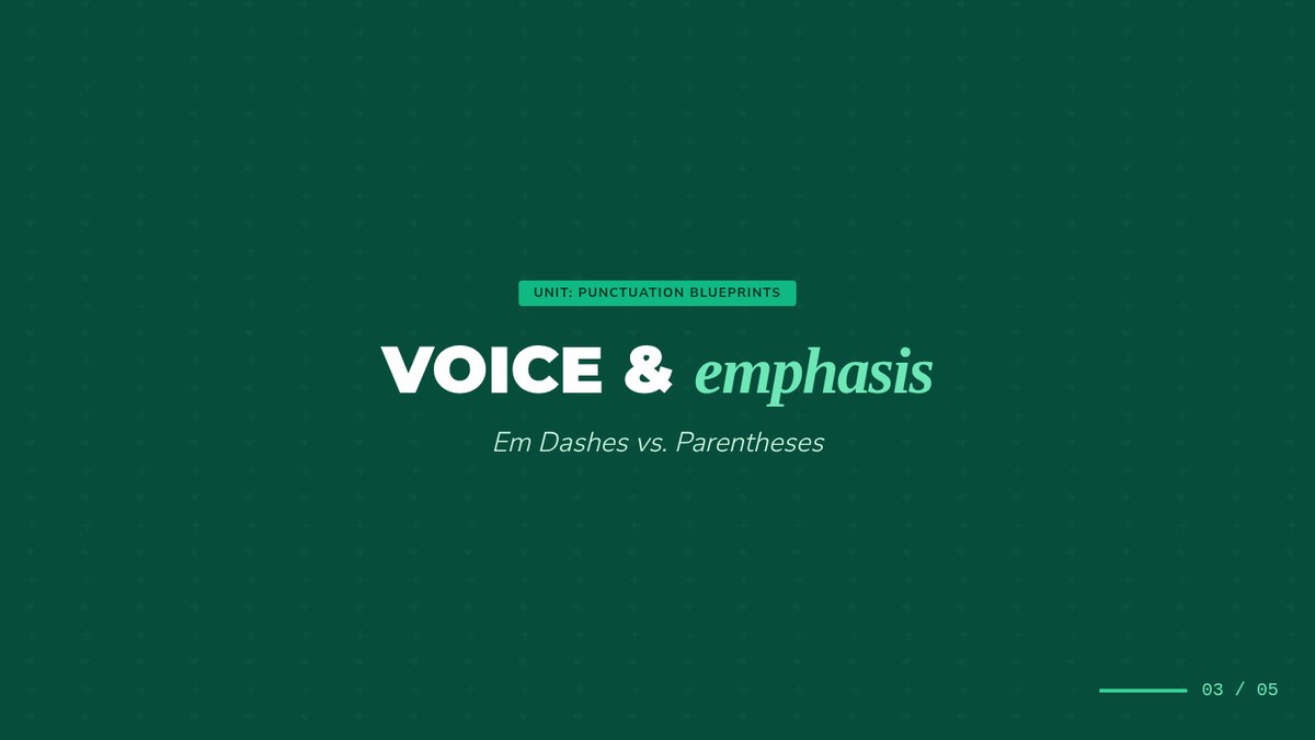 Explores the difference between em dashes (emphasis) and parentheses (asides), analyzing how they alter the tone and voice of writing.