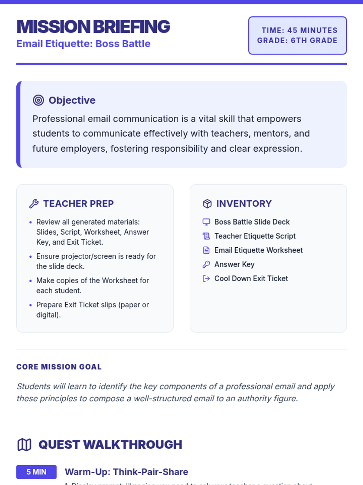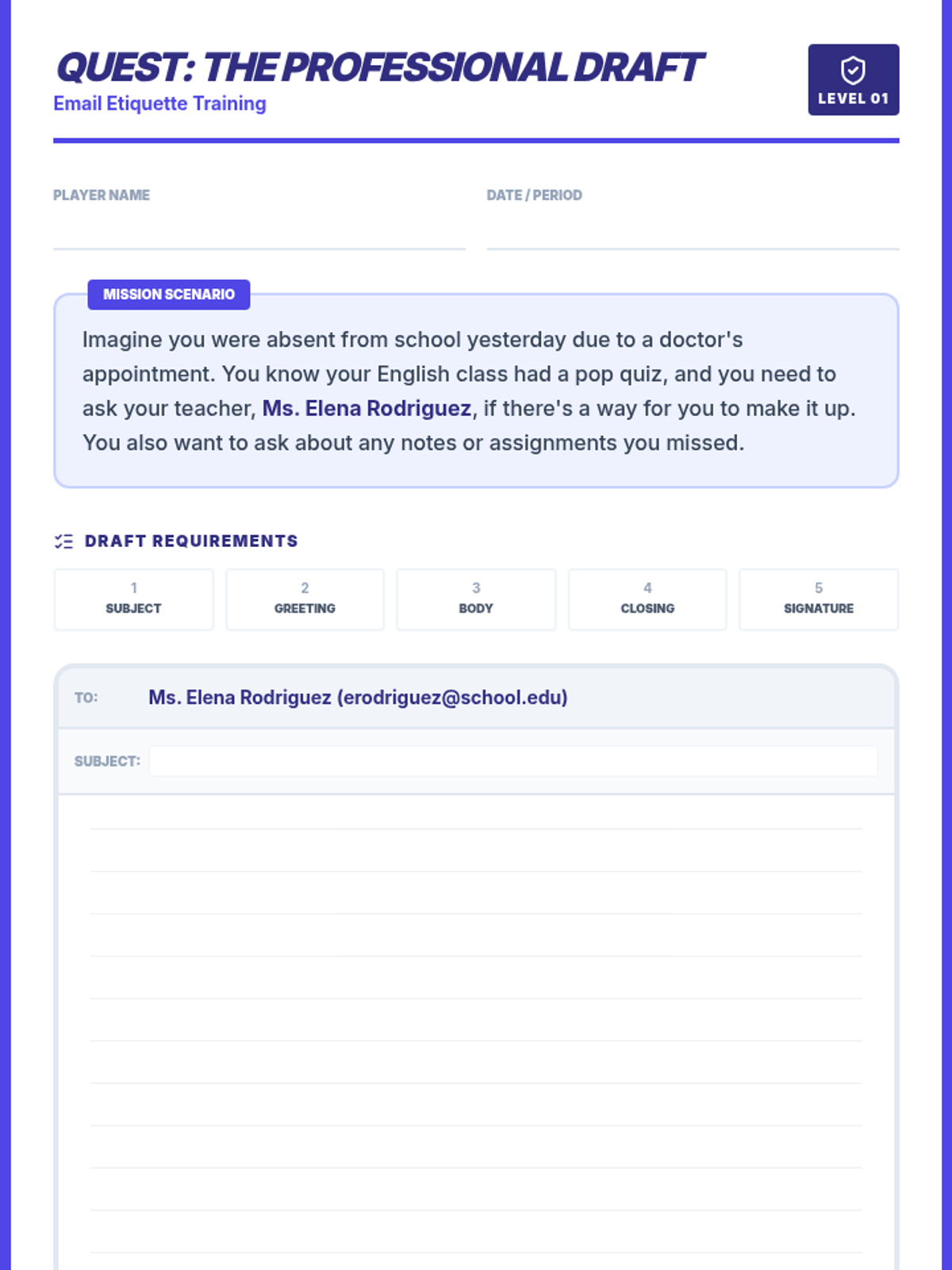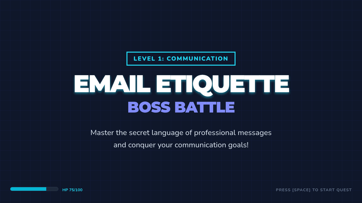 Students master the art of professional email communication through a gamified 'Boss Battle' theme, learning to navigate greetings, subject lines, and professional tone when contacting authority figures.