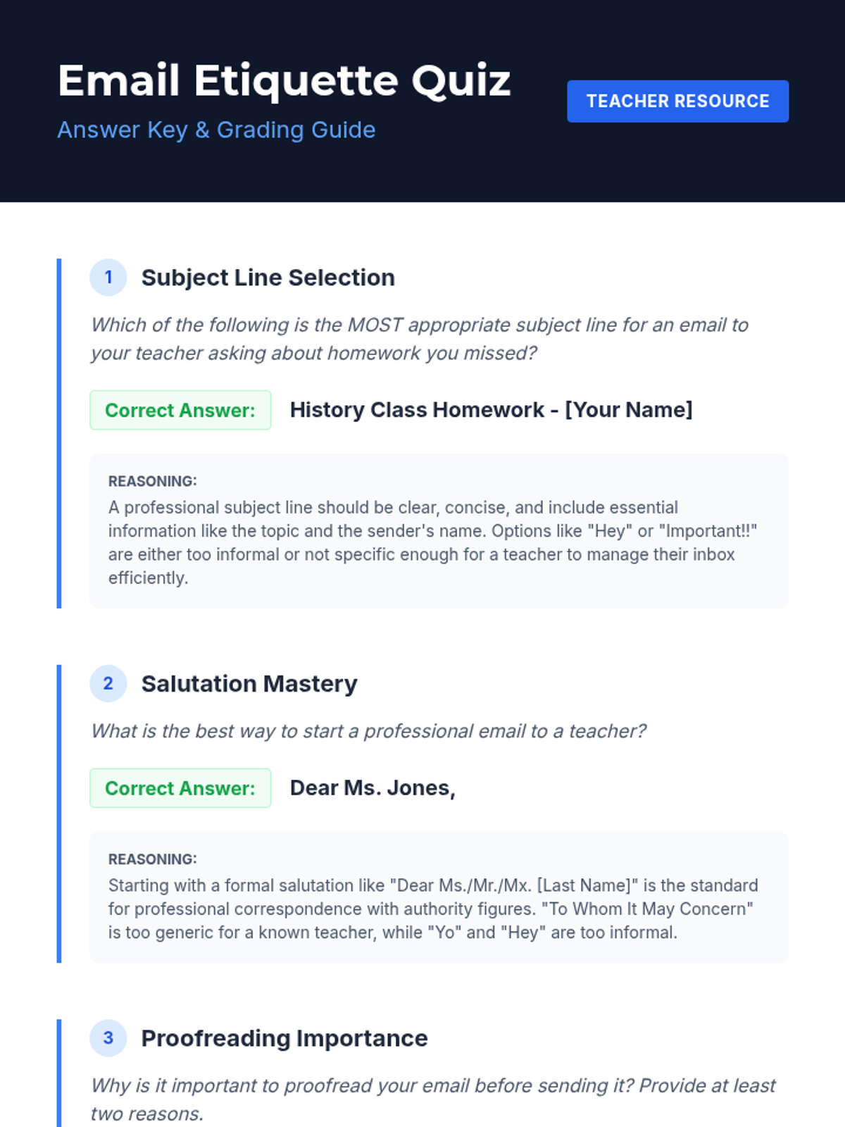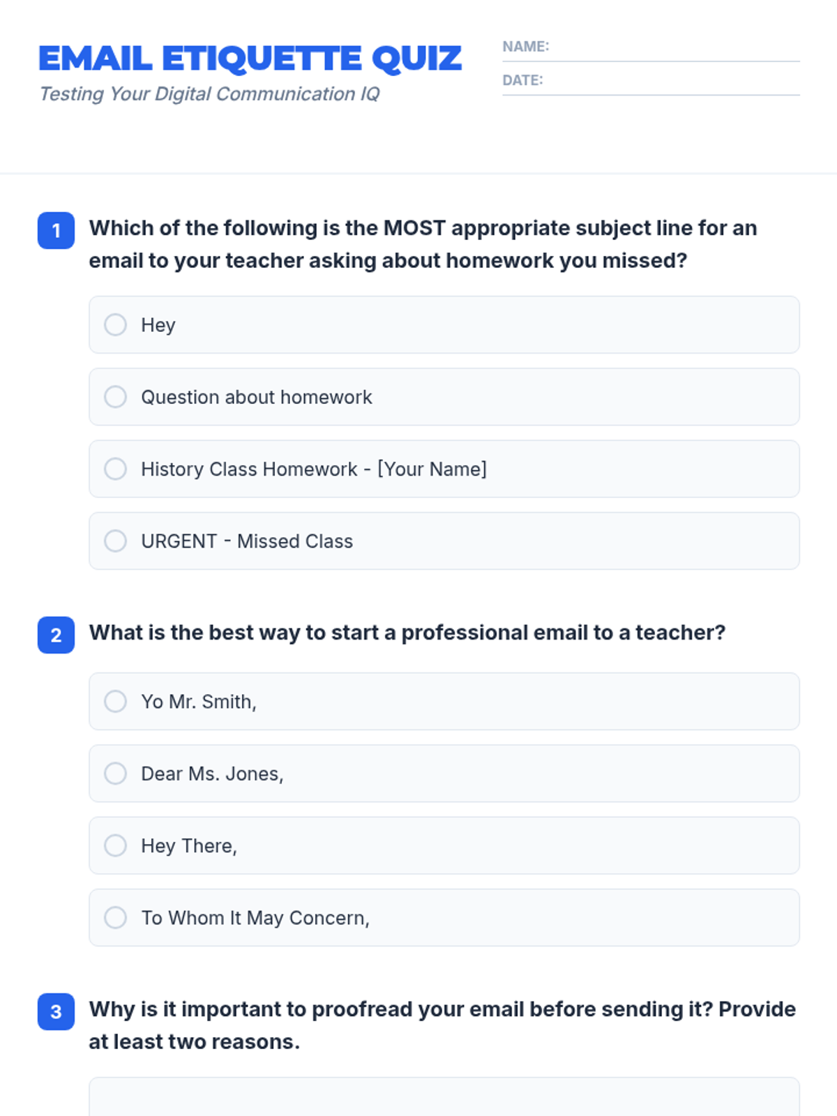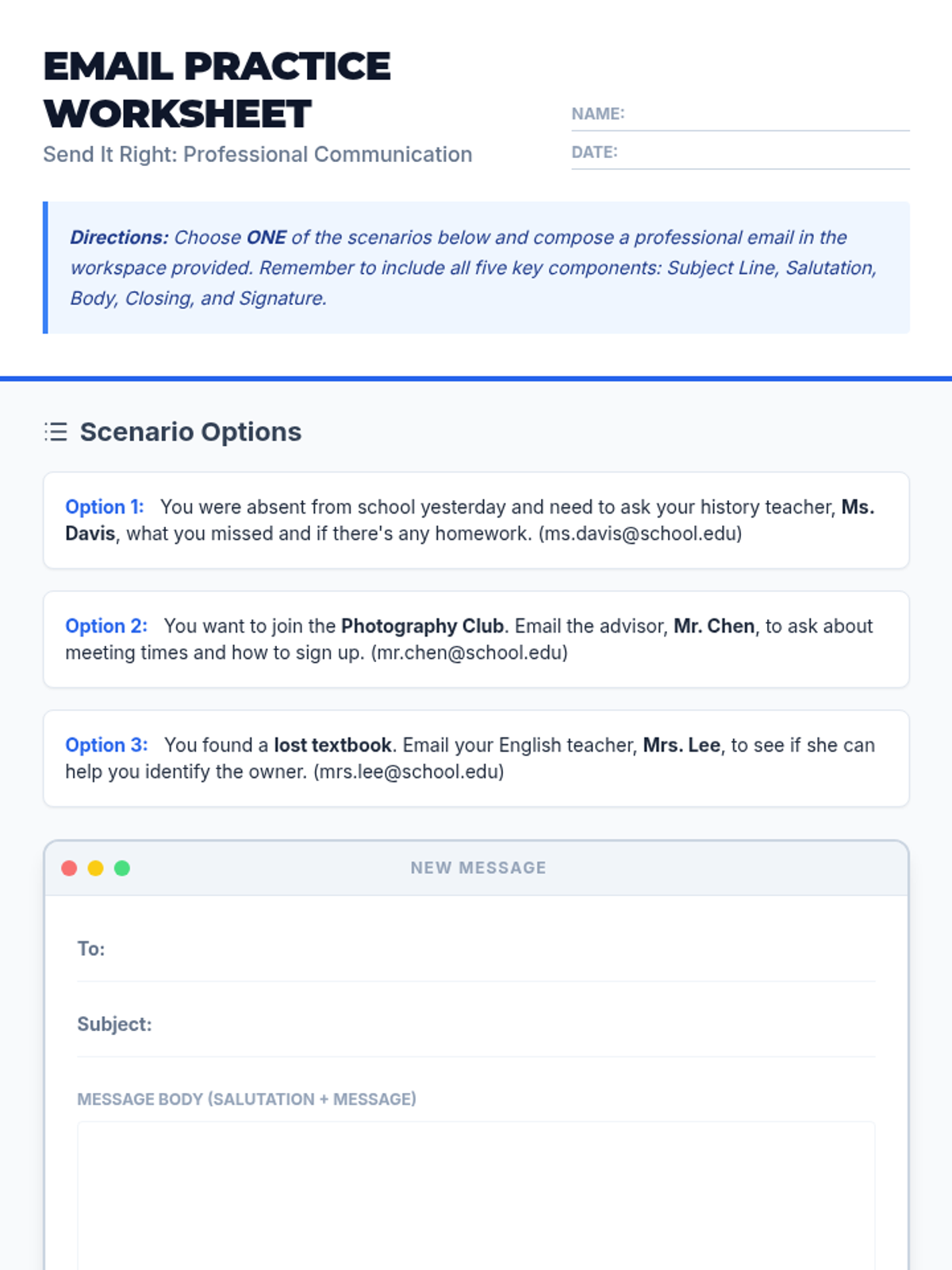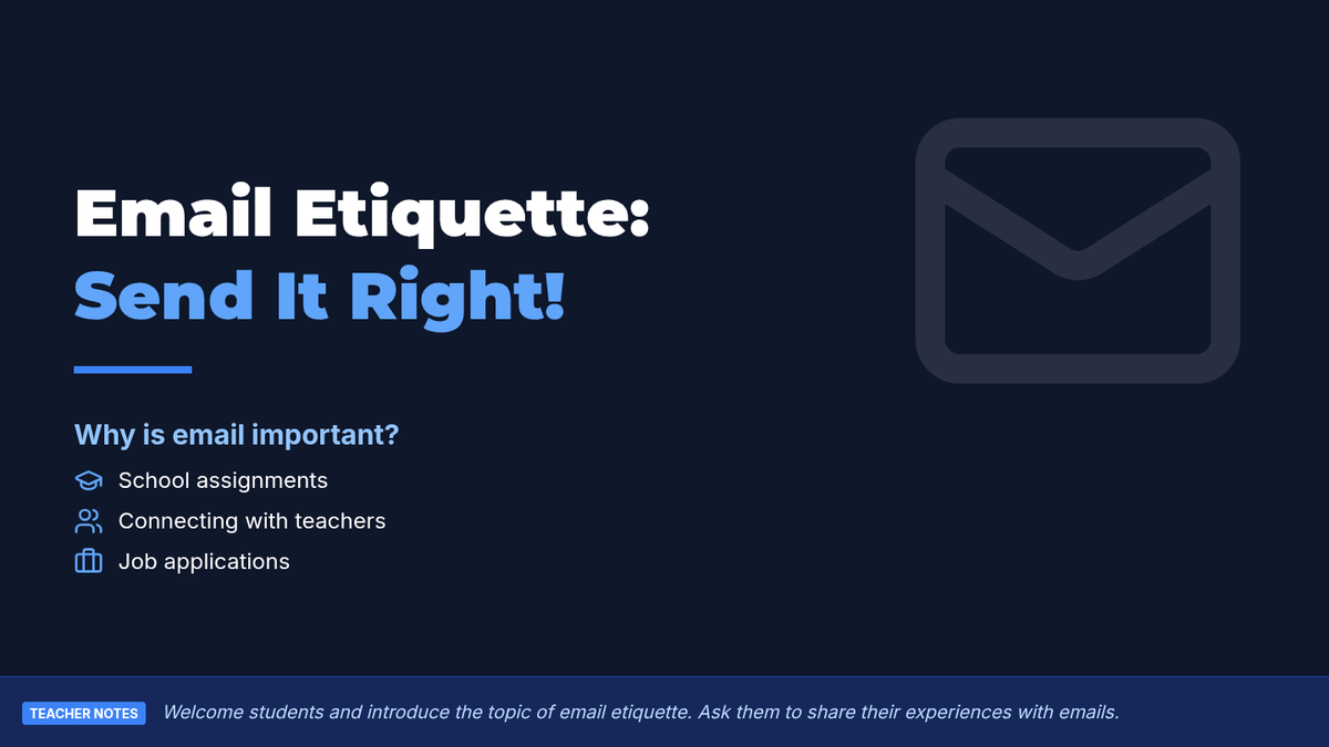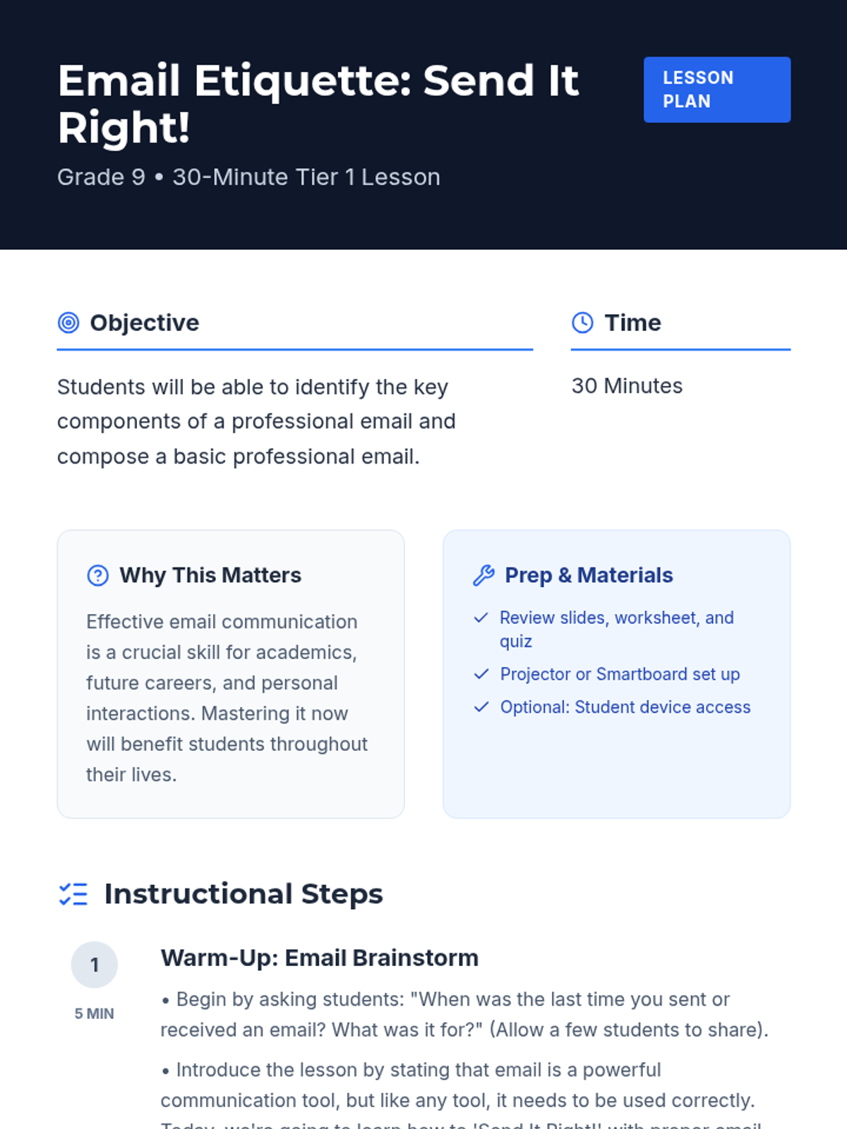 A 30-minute Tier 1 lesson for 9th-grade students covering the anatomy of professional emails and proper digital communication etiquette. Students will learn about subject lines, salutations, body content, closings, and signatures through guided practice.