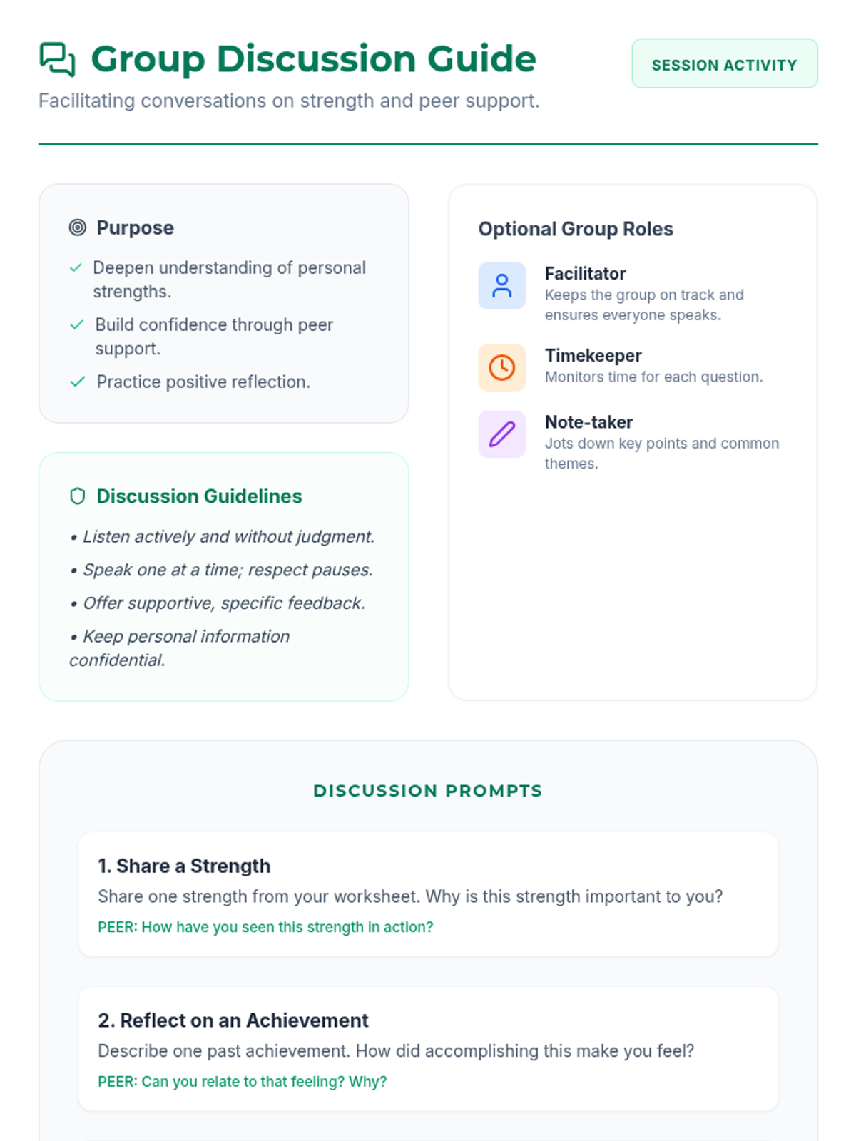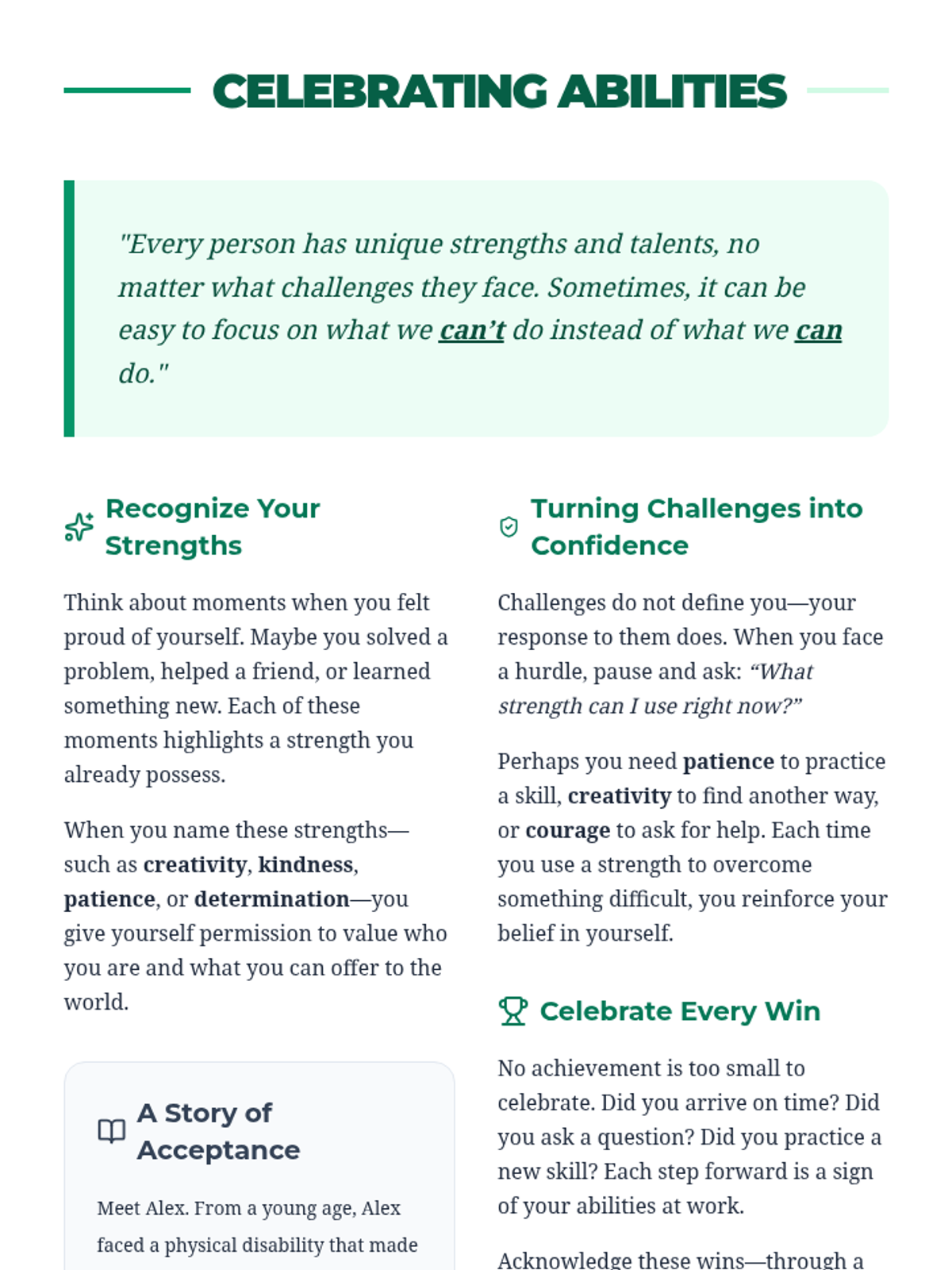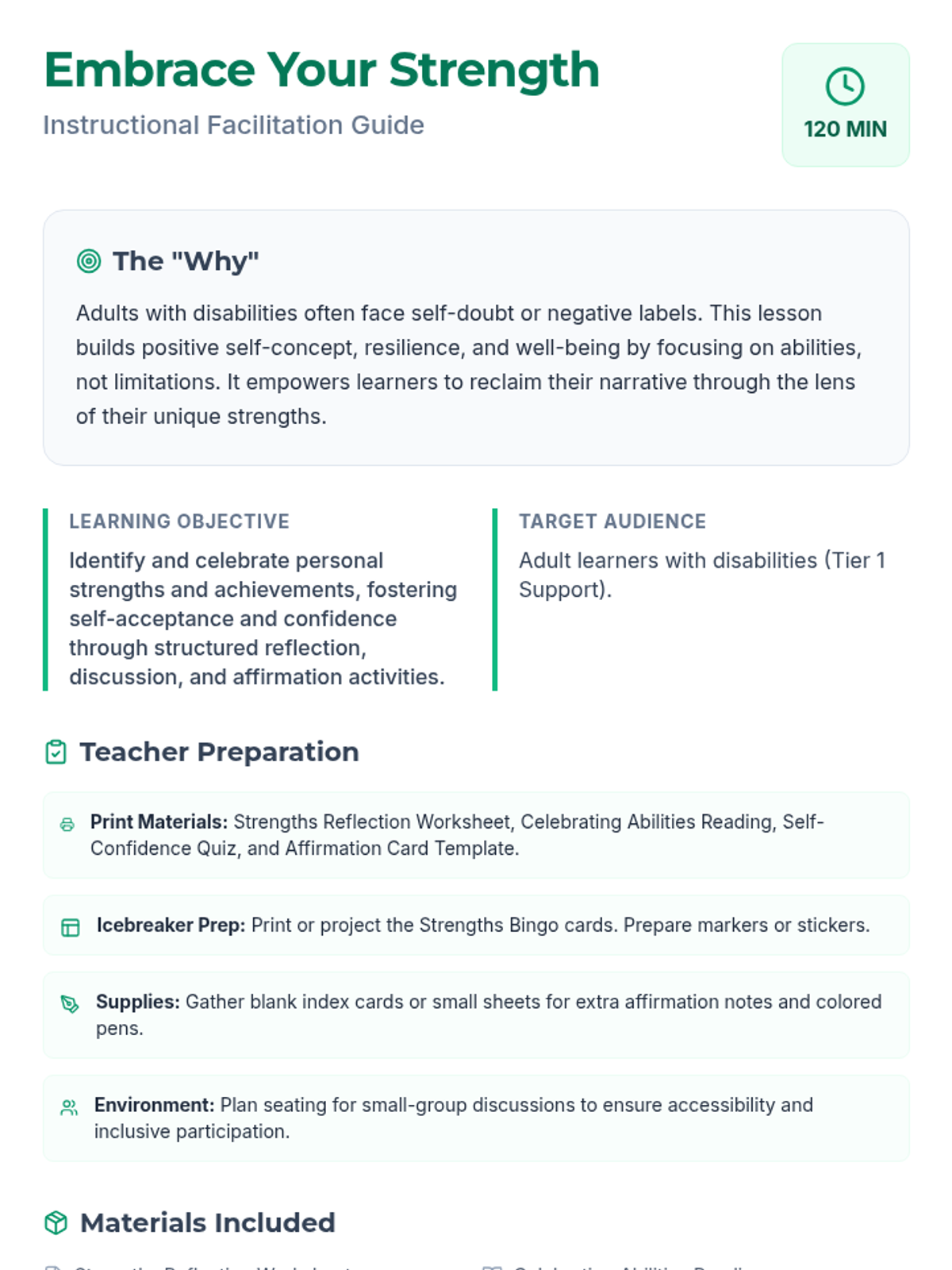 A 2-hour session for adult learners with disabilities focused on identifying personal strengths, building self-confidence, and celebrating achievements through reflection and peer support.