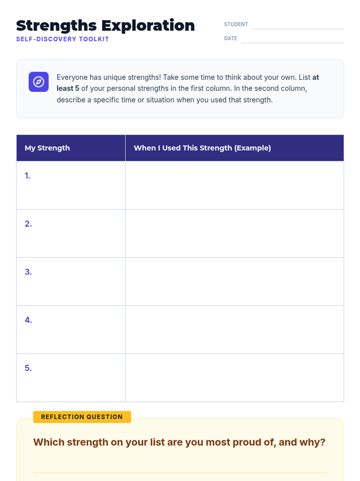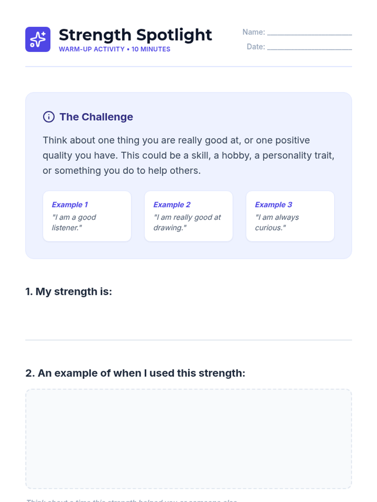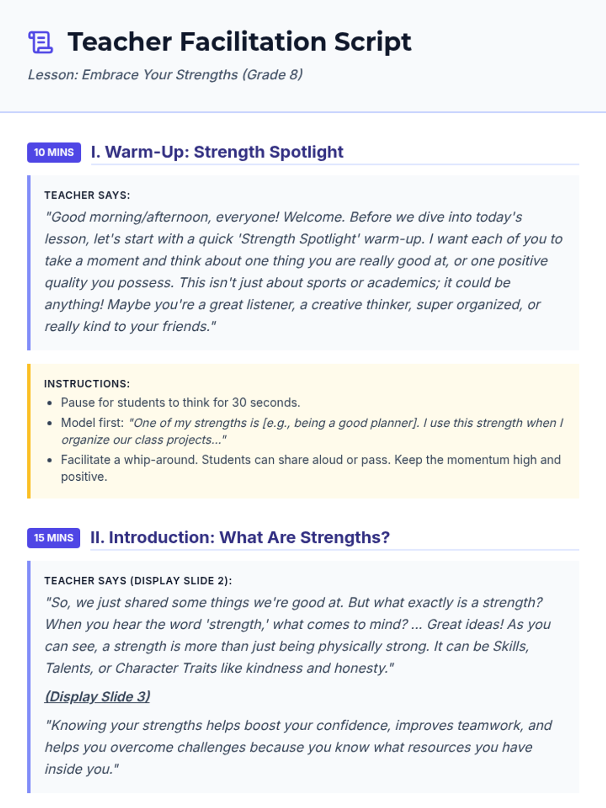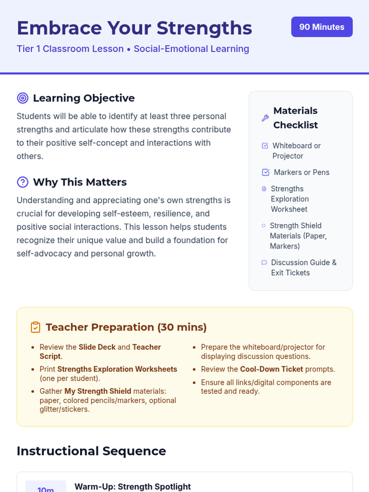 An 8th-grade Social-Emotional Learning lesson focused on identifying personal strengths, building self-esteem, and fostering a supportive classroom environment through creative activities and reflection.