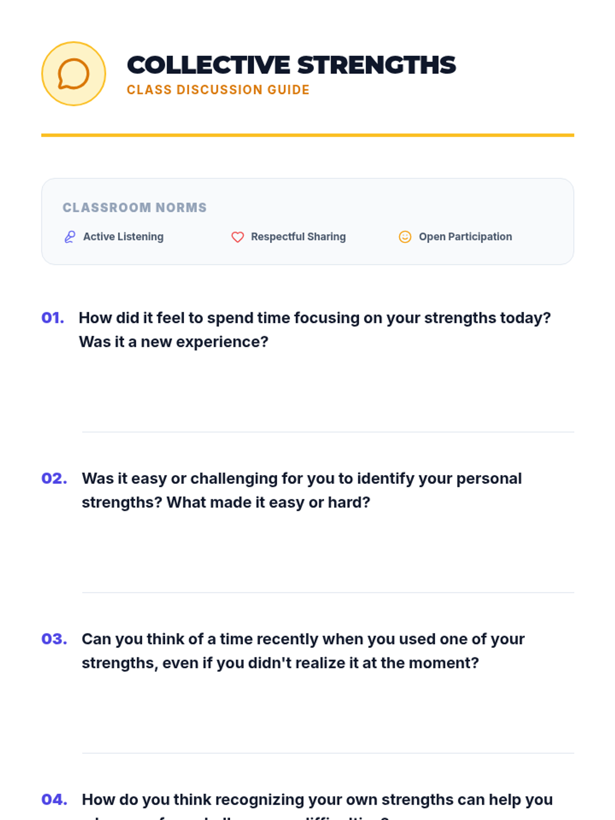 A concise 15-minute introduction to classroom norms centered on the core values of Respect, Integrity, and Safety. Students will define these values and commit to a shared culture of success.