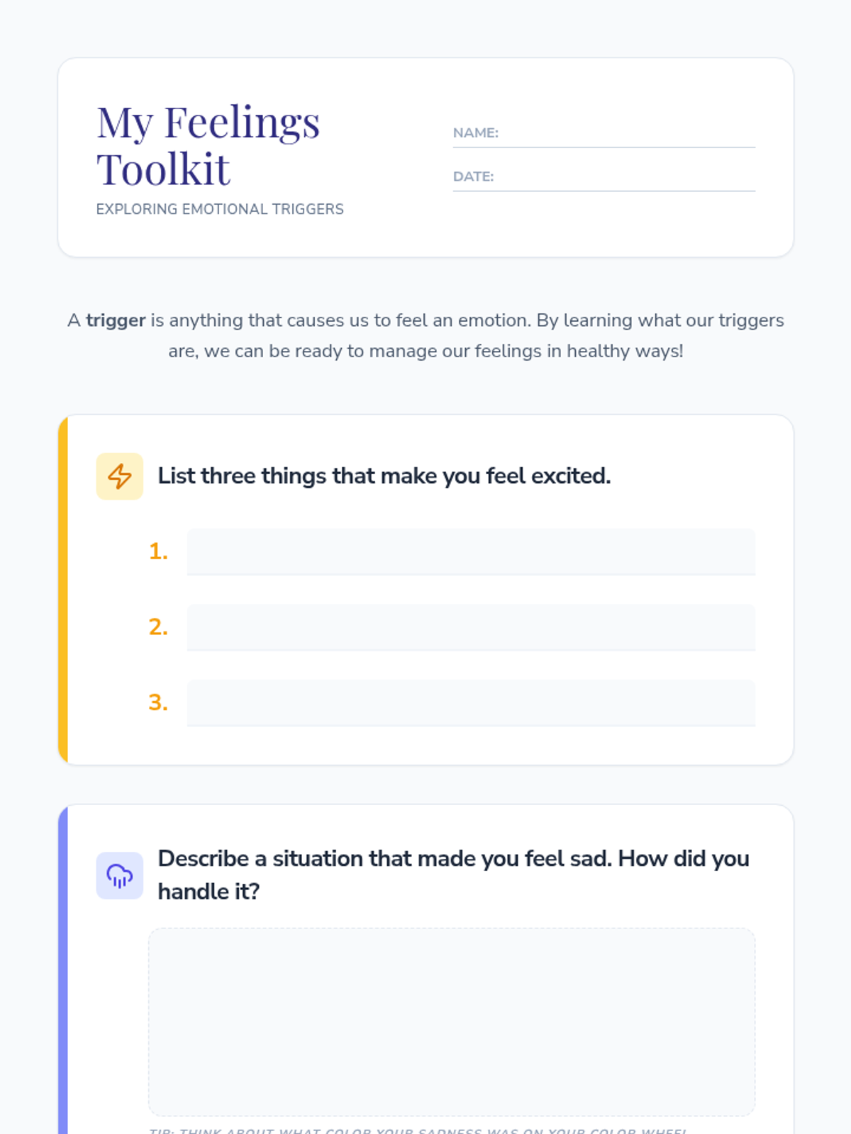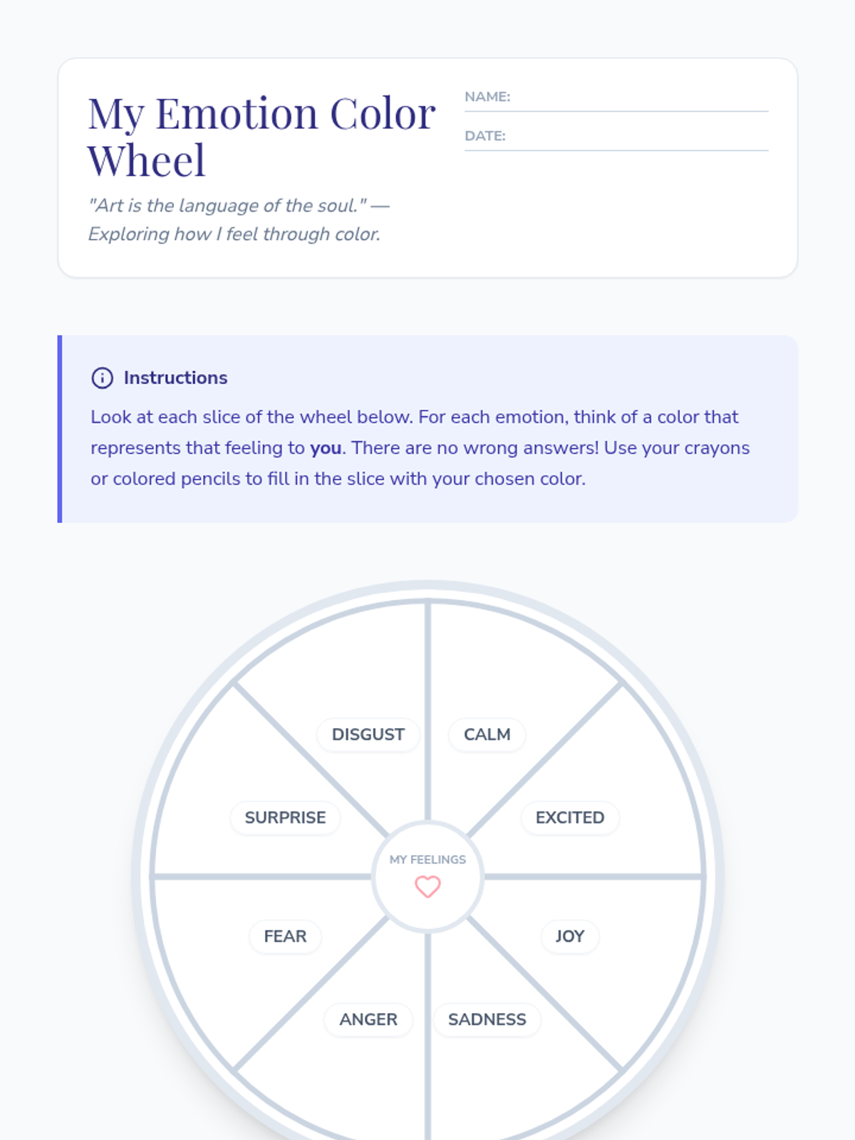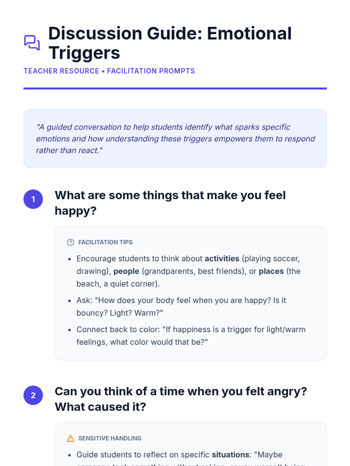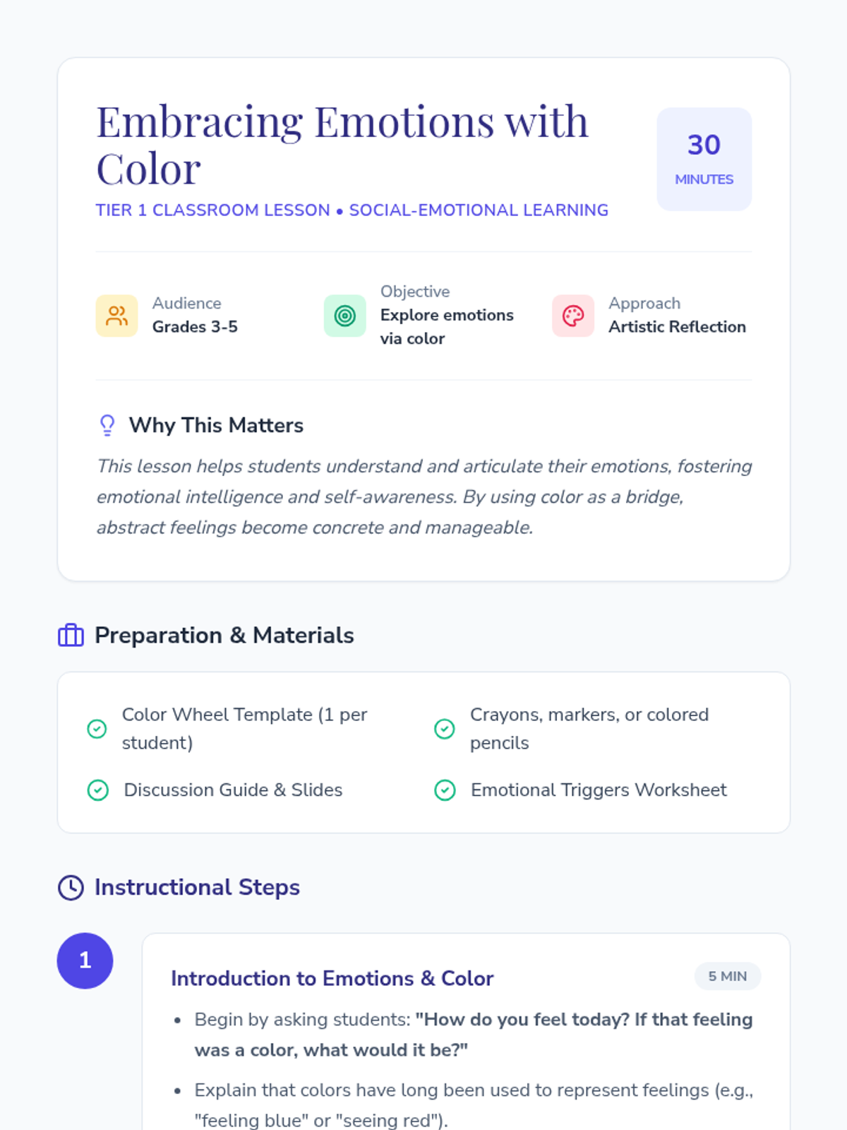 A 30-minute social-emotional learning lesson for grades 3-5 where students explore the connection between colors and emotions, create a personalized color wheel, and identify emotional triggers.