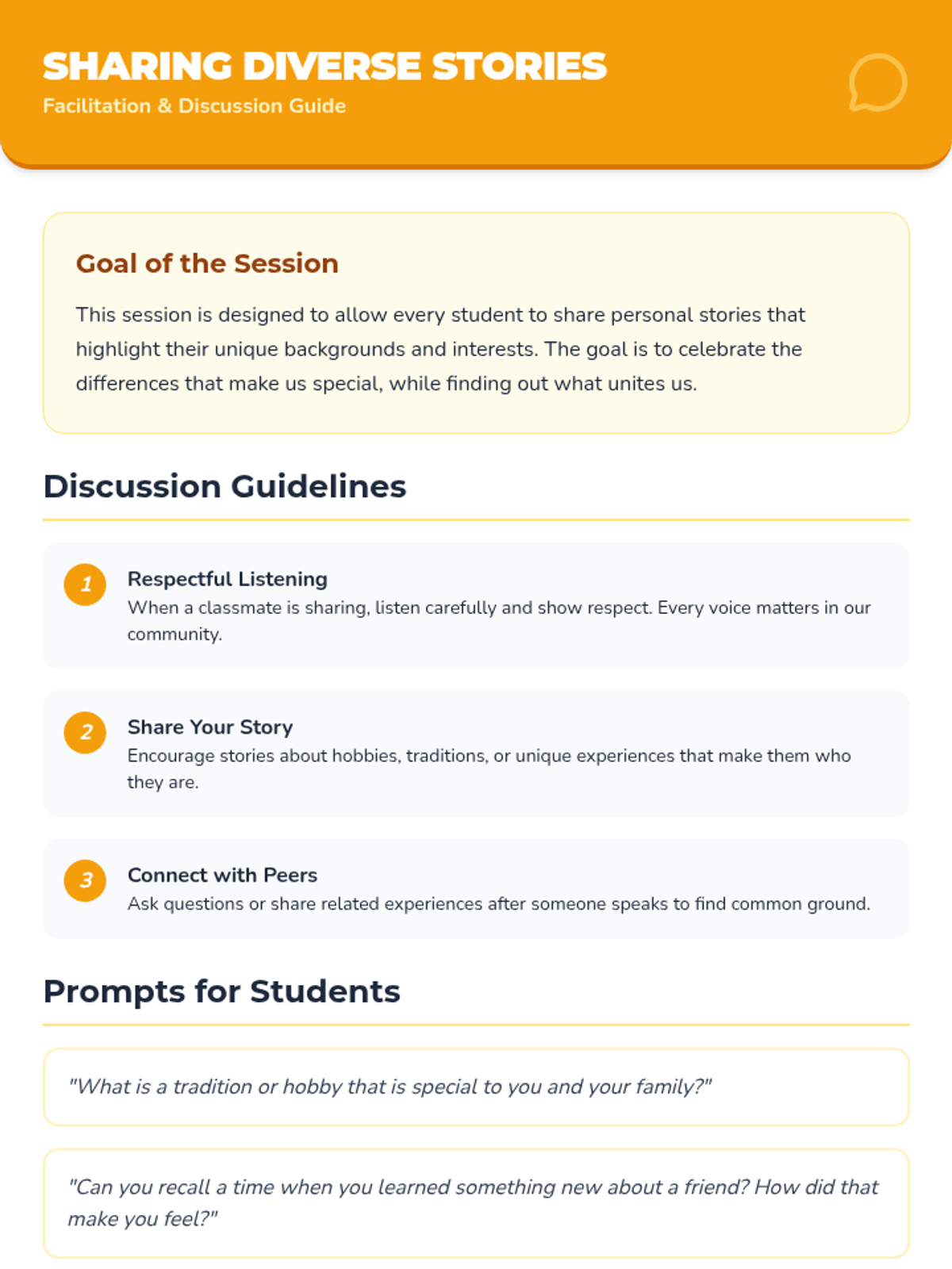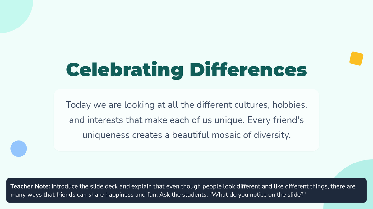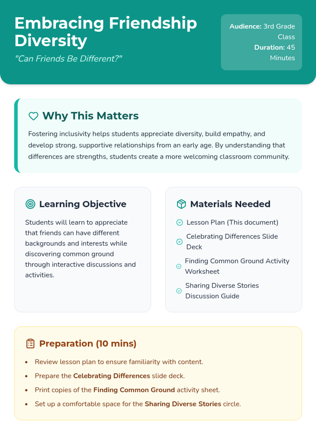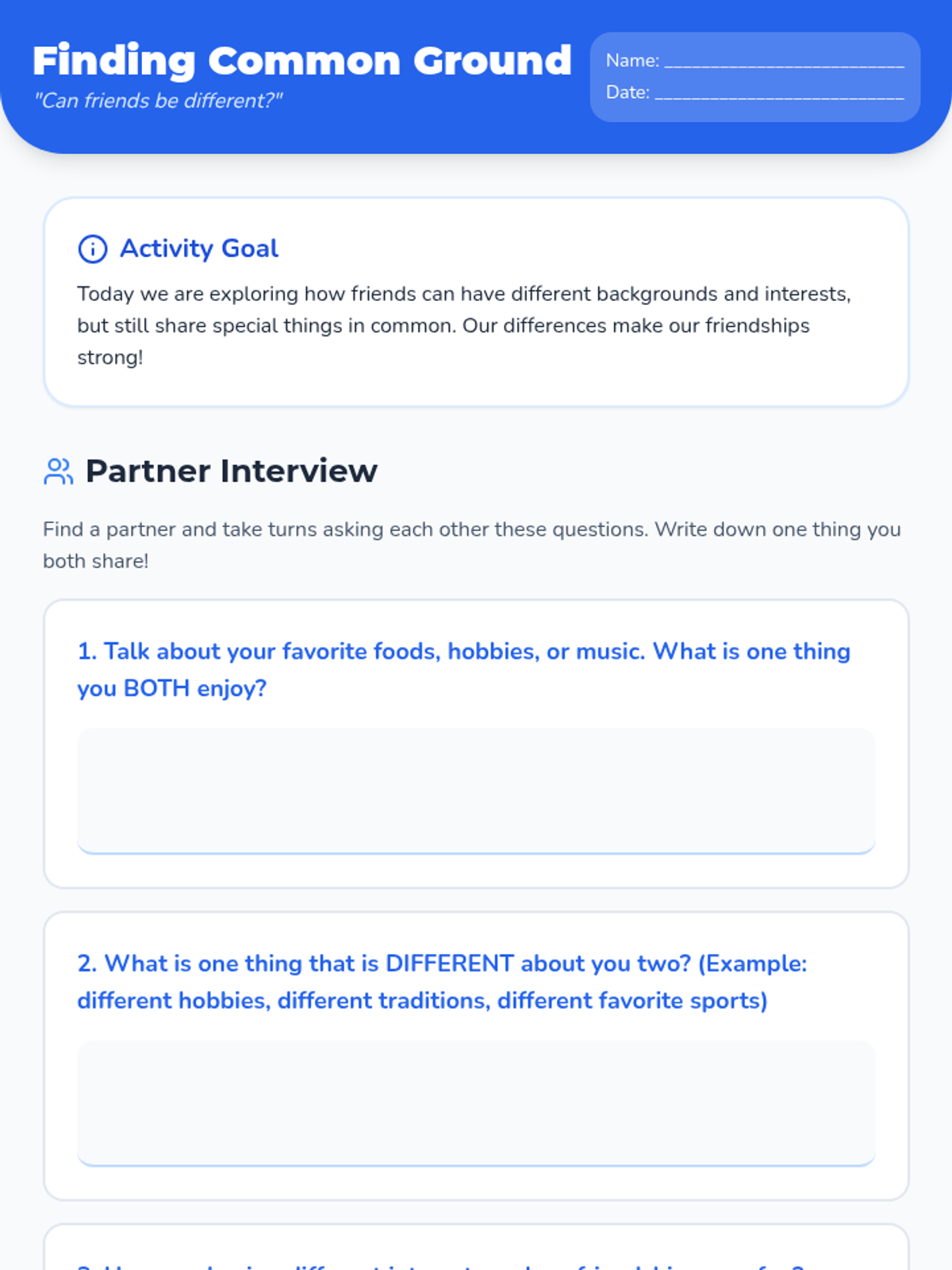 A 45-minute lesson for 3rd graders to explore diversity in friendships, learning that different backgrounds and interests make friendships richer while finding common ground.