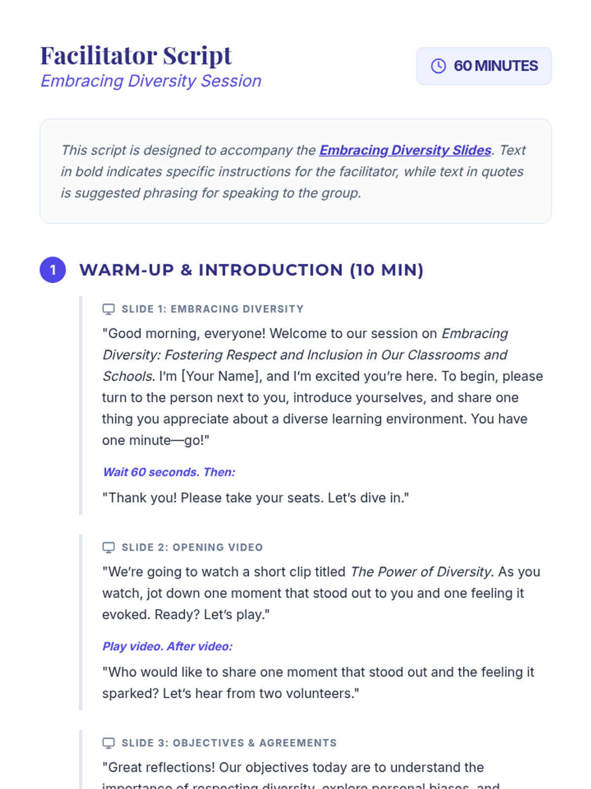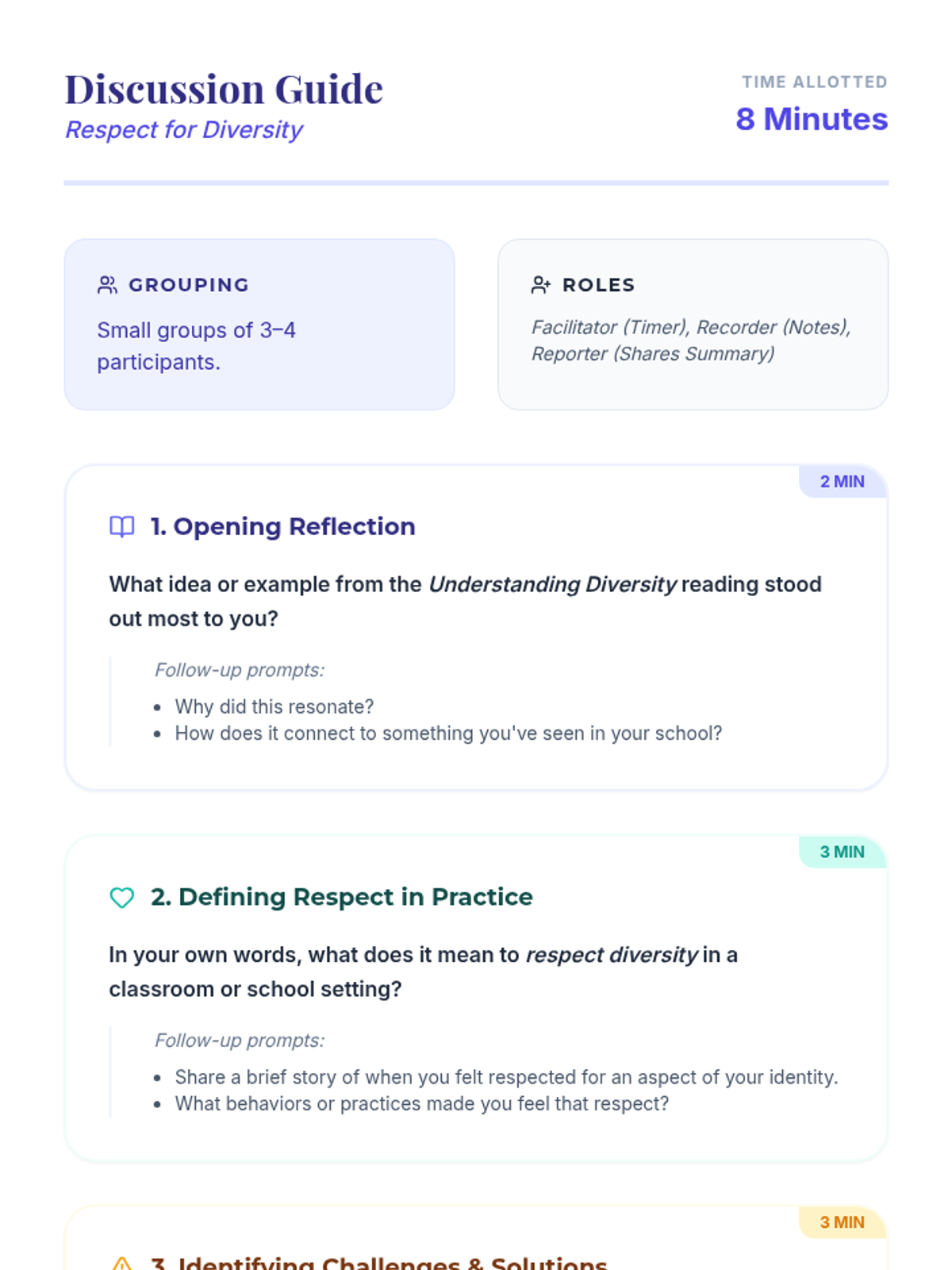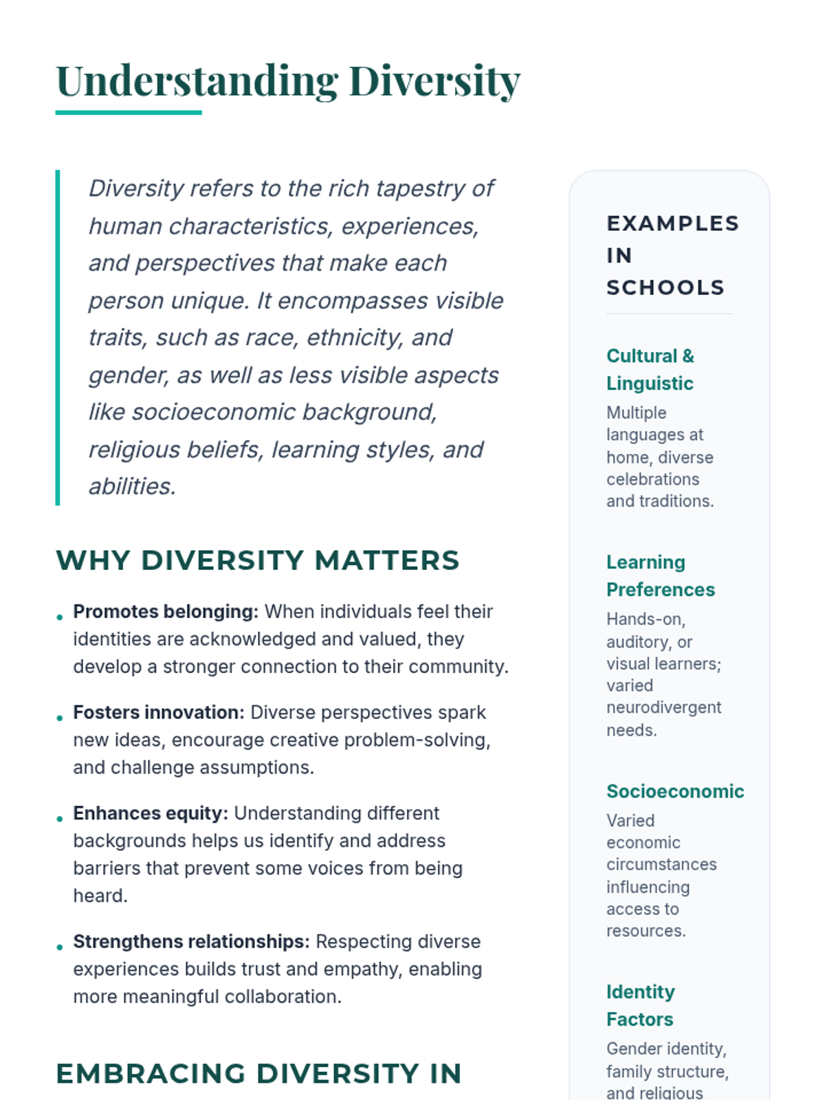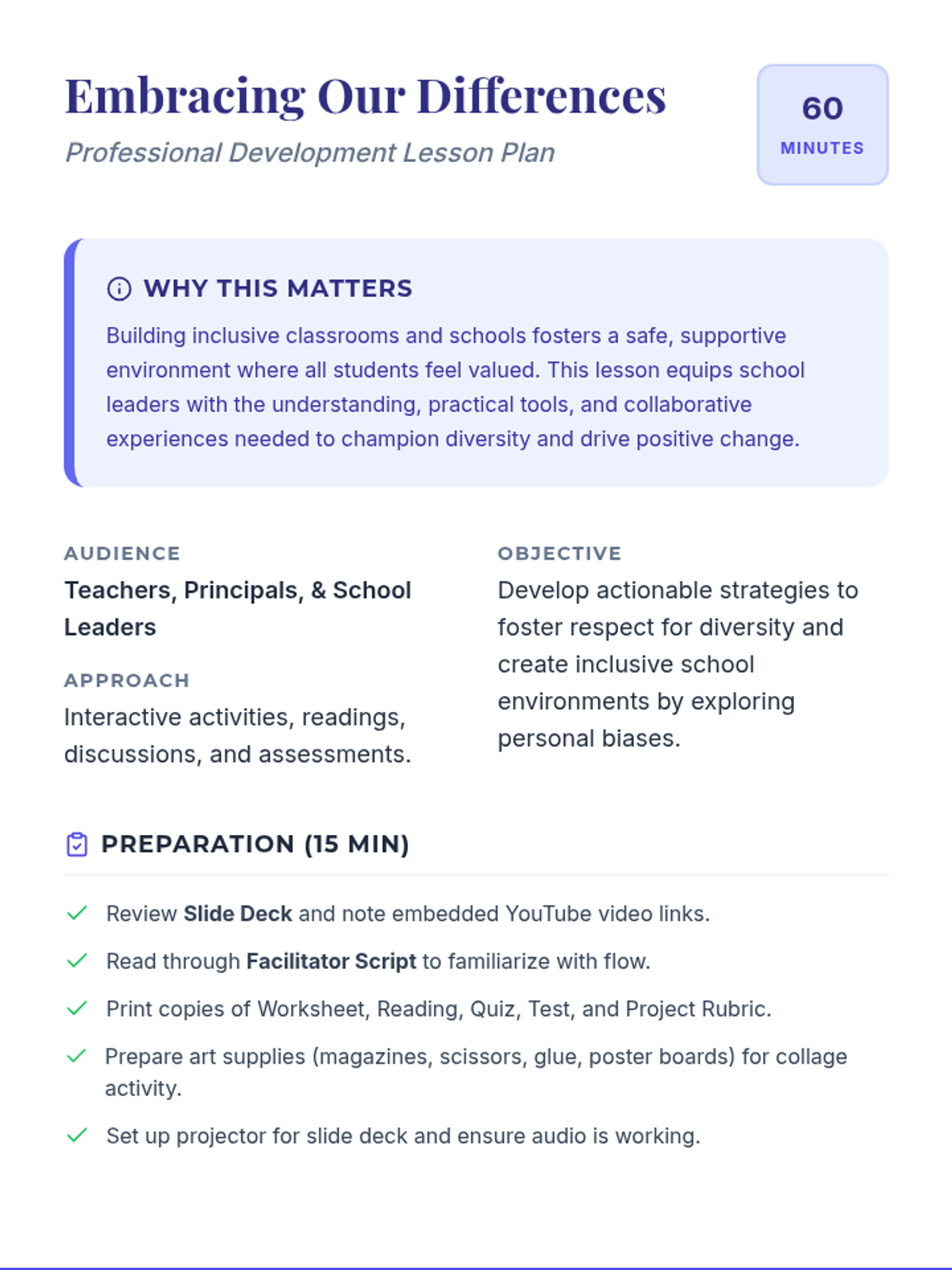 A one-hour professional development session for school leaders to explore diversity, identify personal biases, and develop actionable strategies for inclusive school environments. Participants engage in interactive activities, readings, and collaborative planning to foster a culture of respect.