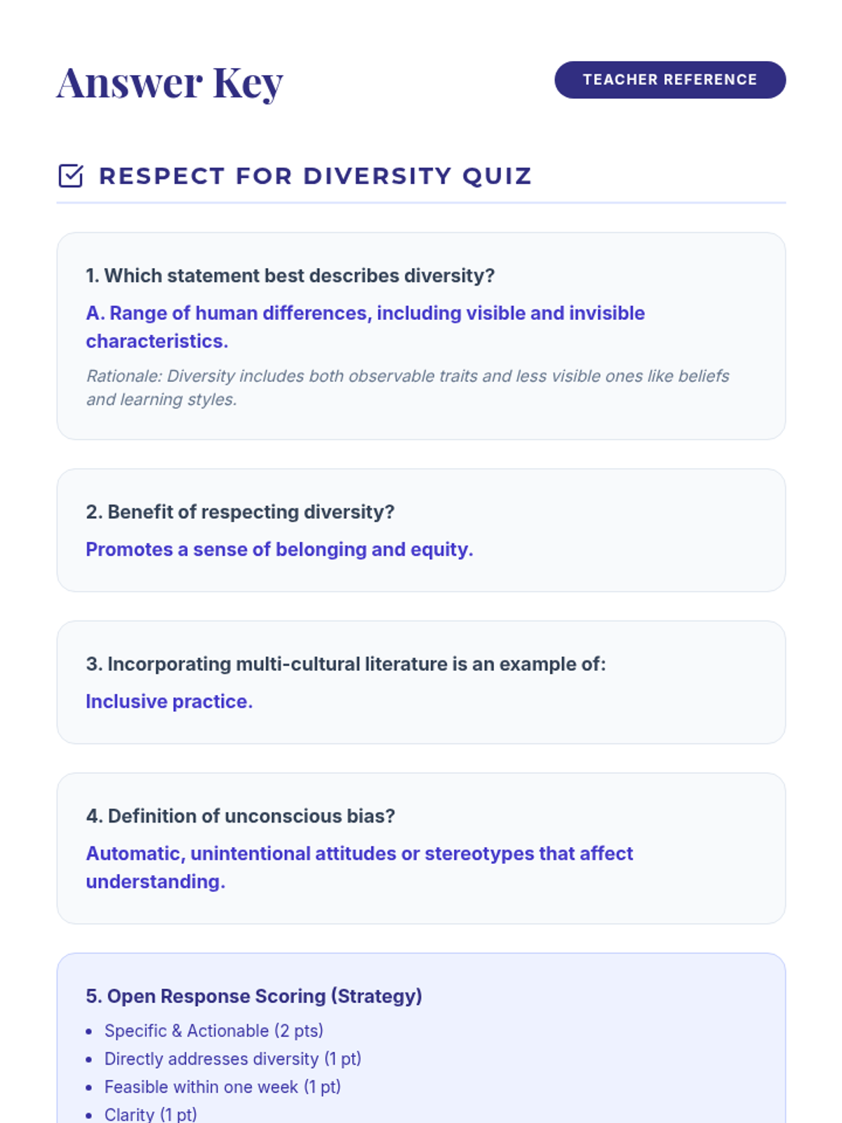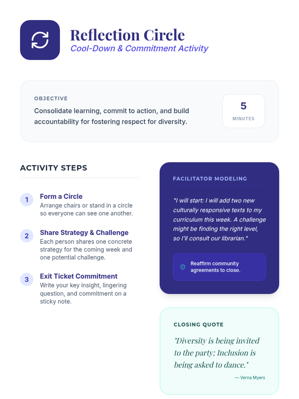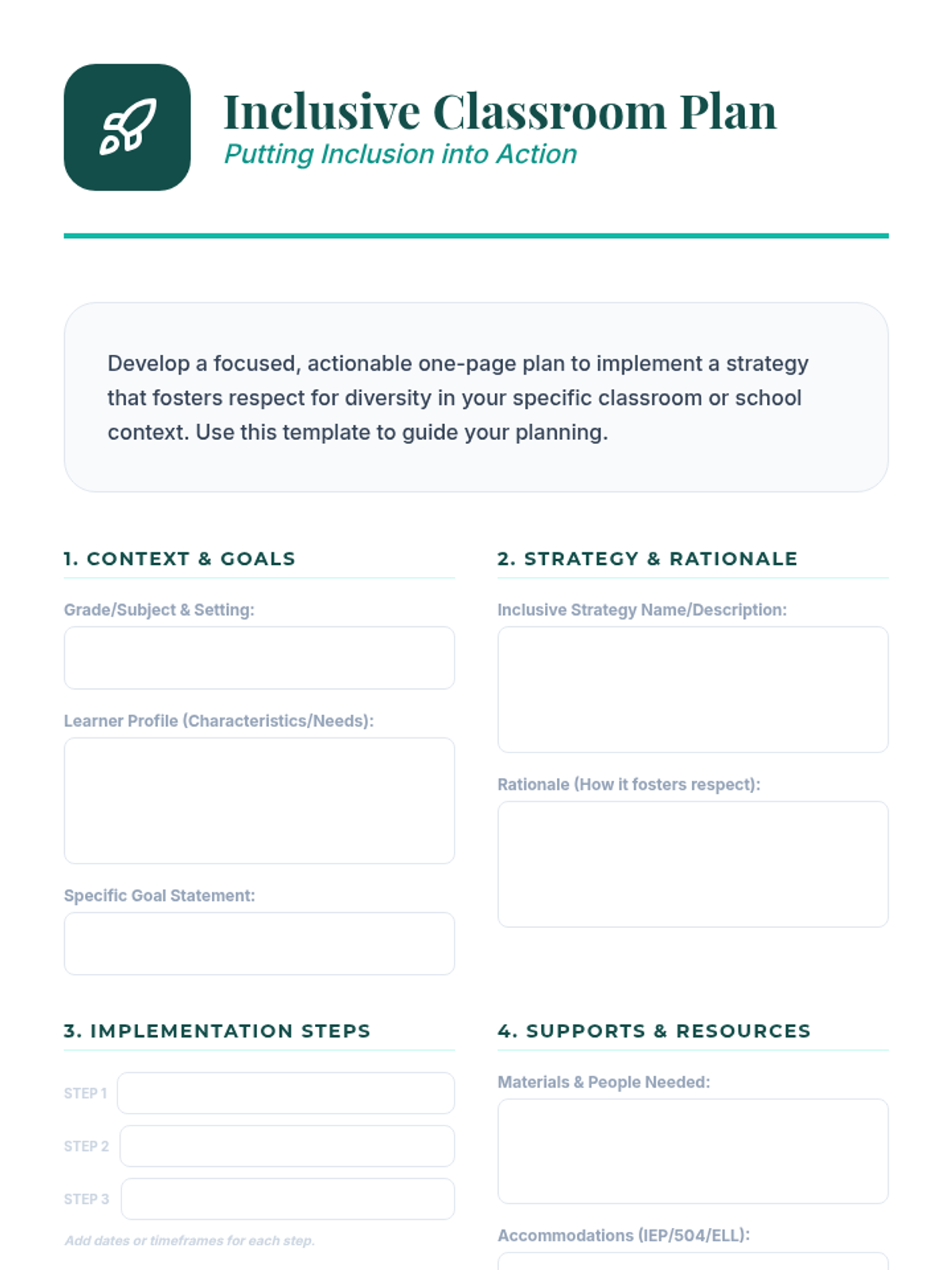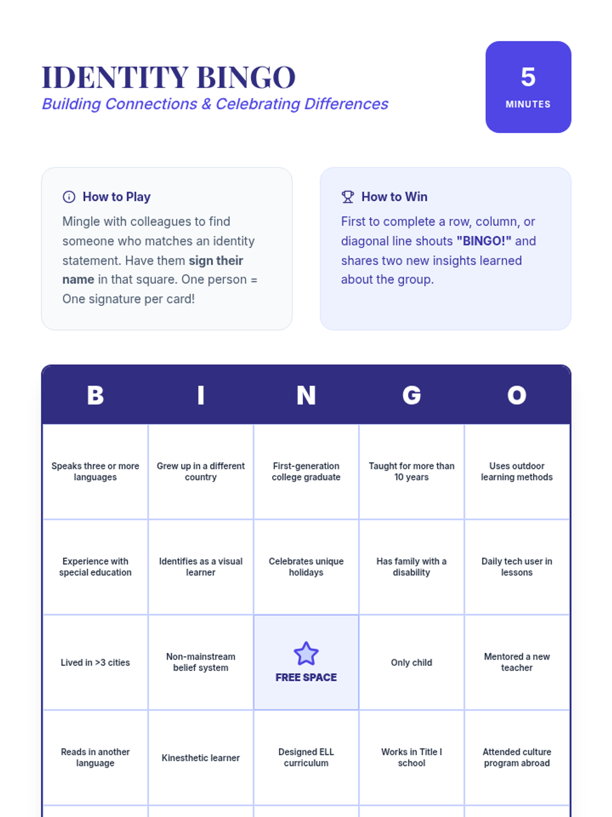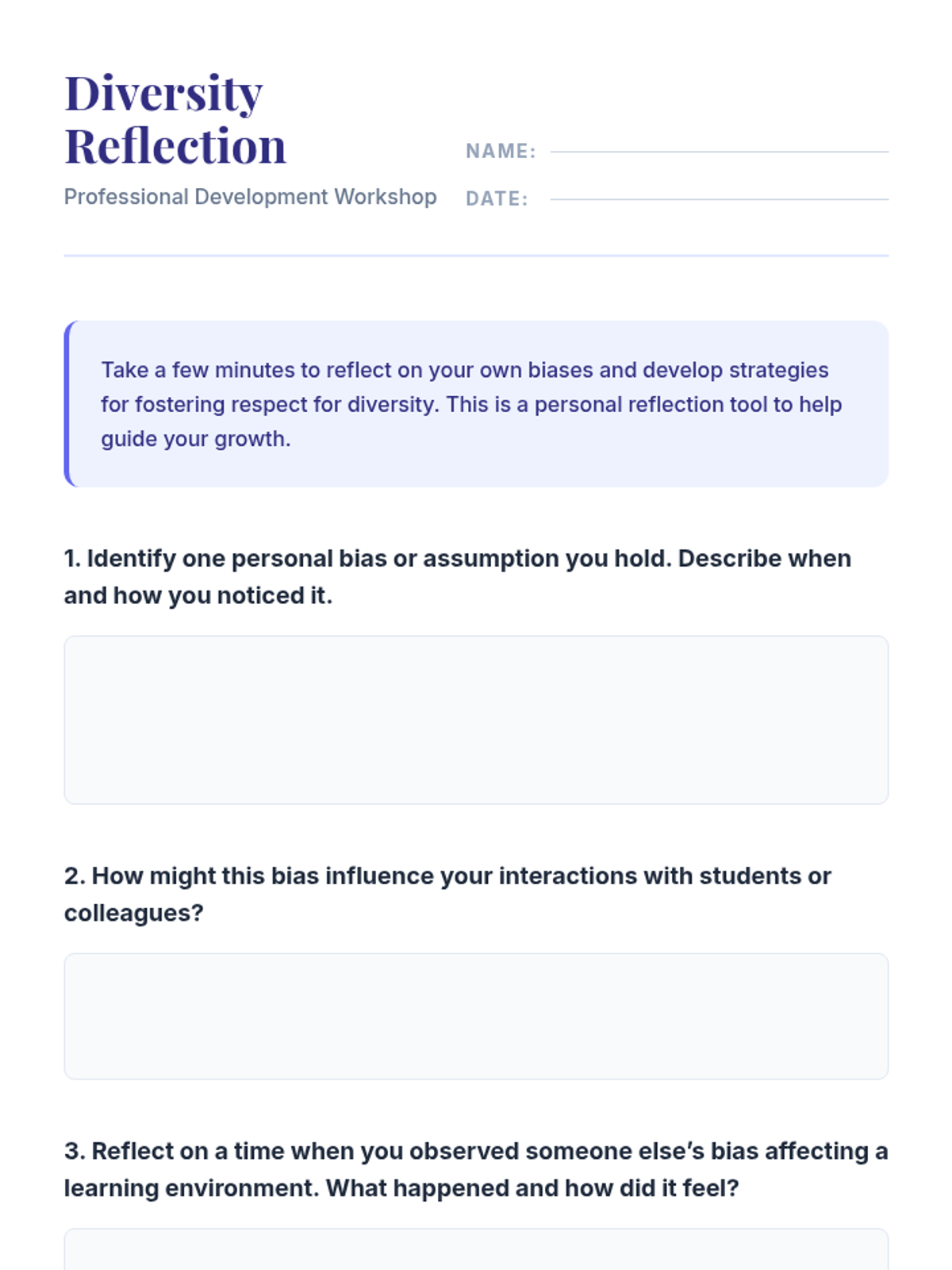 A one-hour professional development session for school leaders to explore diversity, identify personal biases, and develop actionable strategies for inclusive school environments. Participants engage in interactive activities, readings, and collaborative planning to foster a culture of respect.