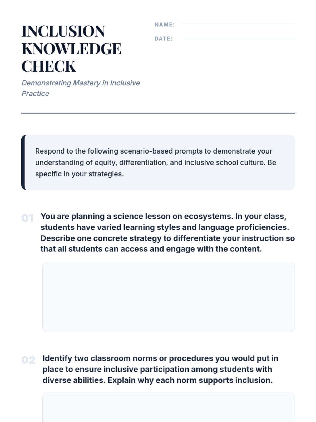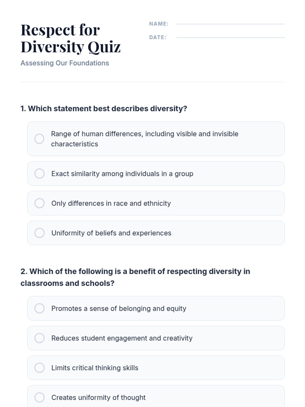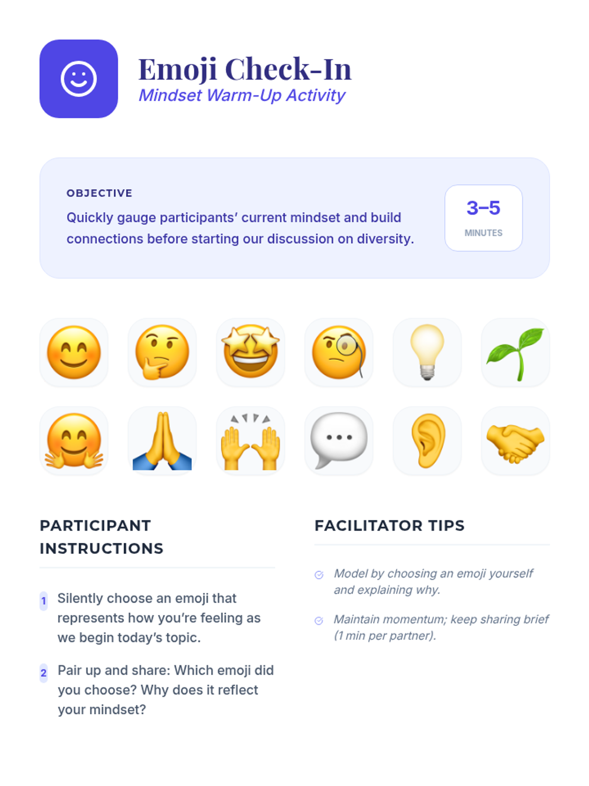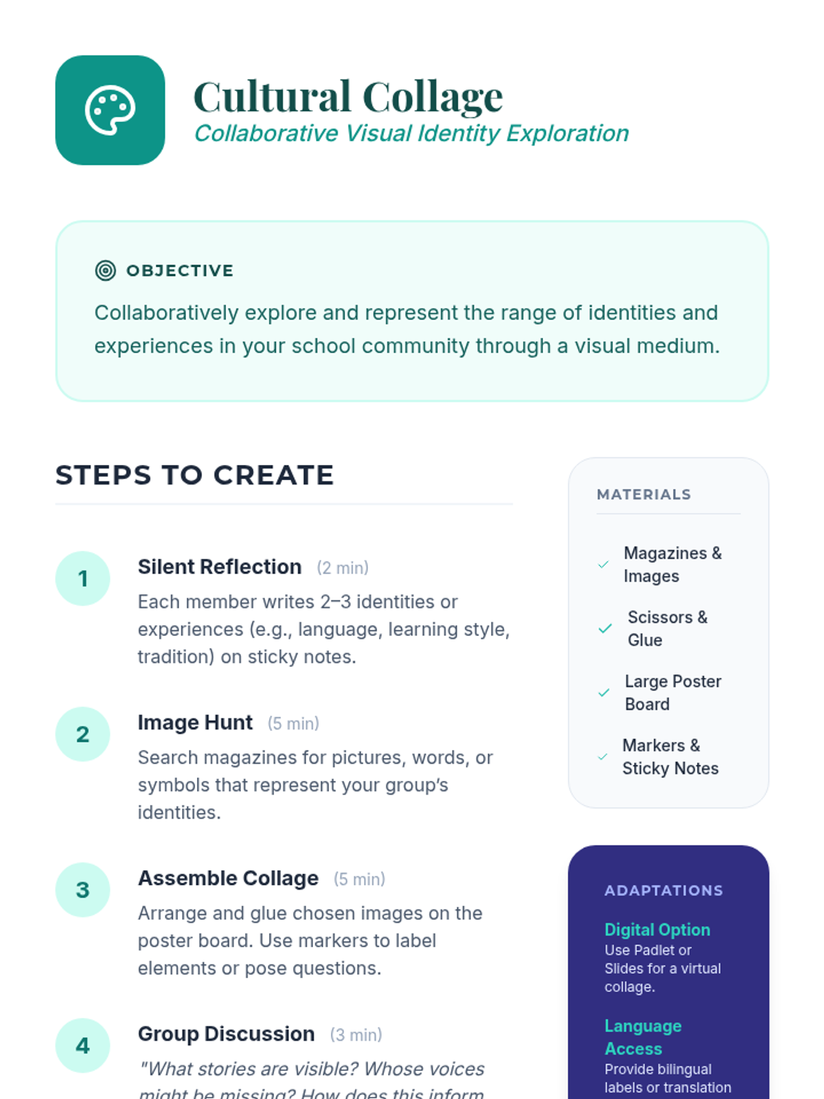 A one-hour professional development session for school leaders to explore diversity, identify personal biases, and develop actionable strategies for inclusive school environments. Participants engage in interactive activities, readings, and collaborative planning to foster a culture of respect.