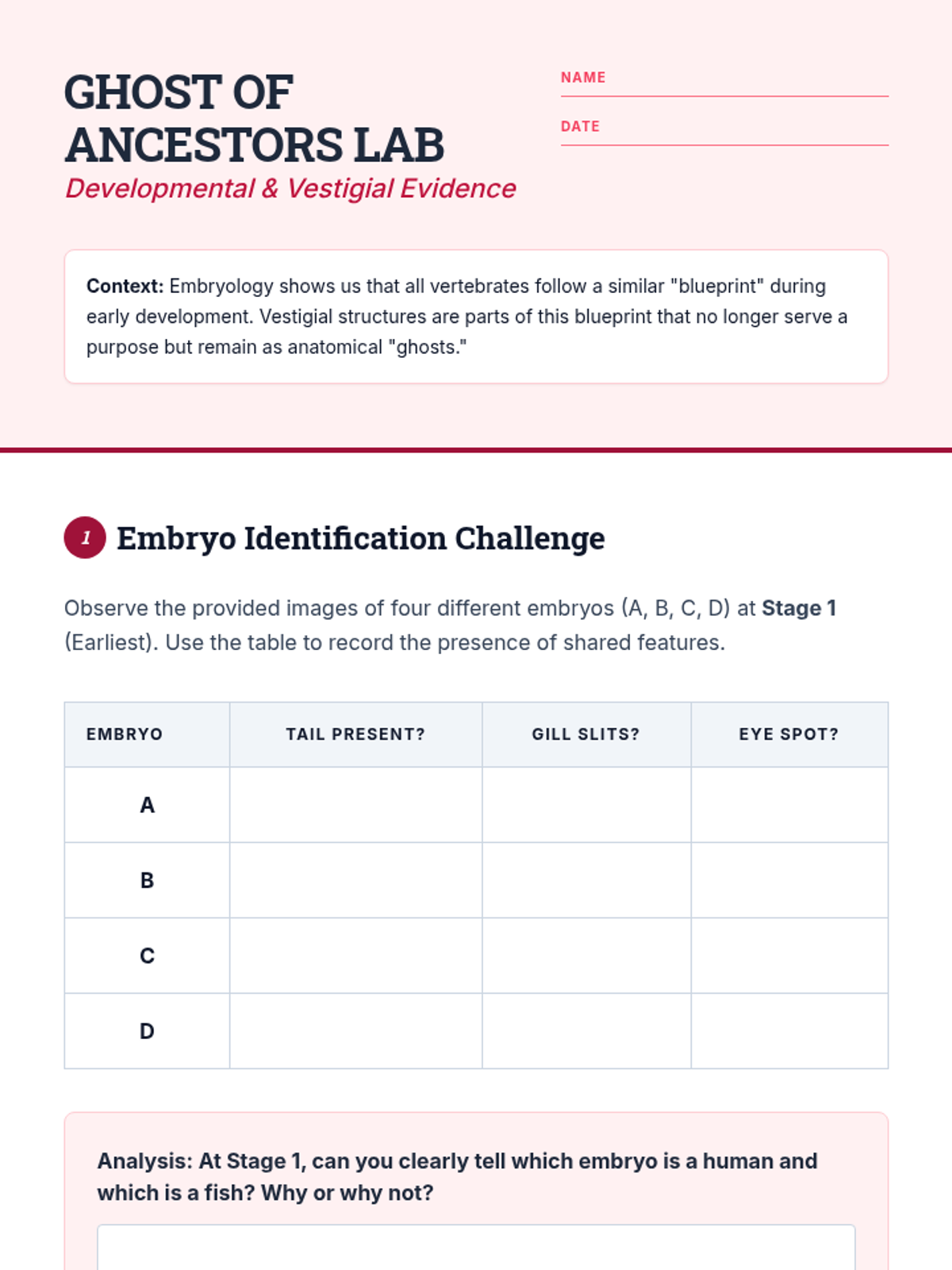 Students compare images of vertebrate embryos at different stages of development and identify shared features like pharyngeal pouches. They also examine vestigial structures in humans (appendix, tailbone) as remnants of ancestry.