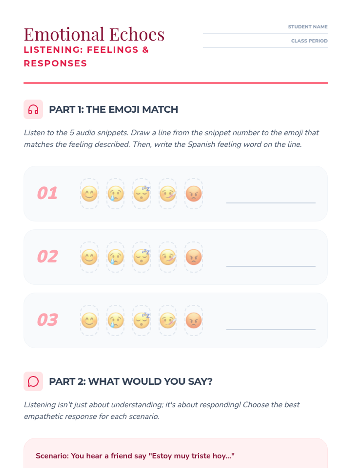 Students move beyond basic greetings to listen for and respond to descriptions of well-being and emotional states in Spanish.
