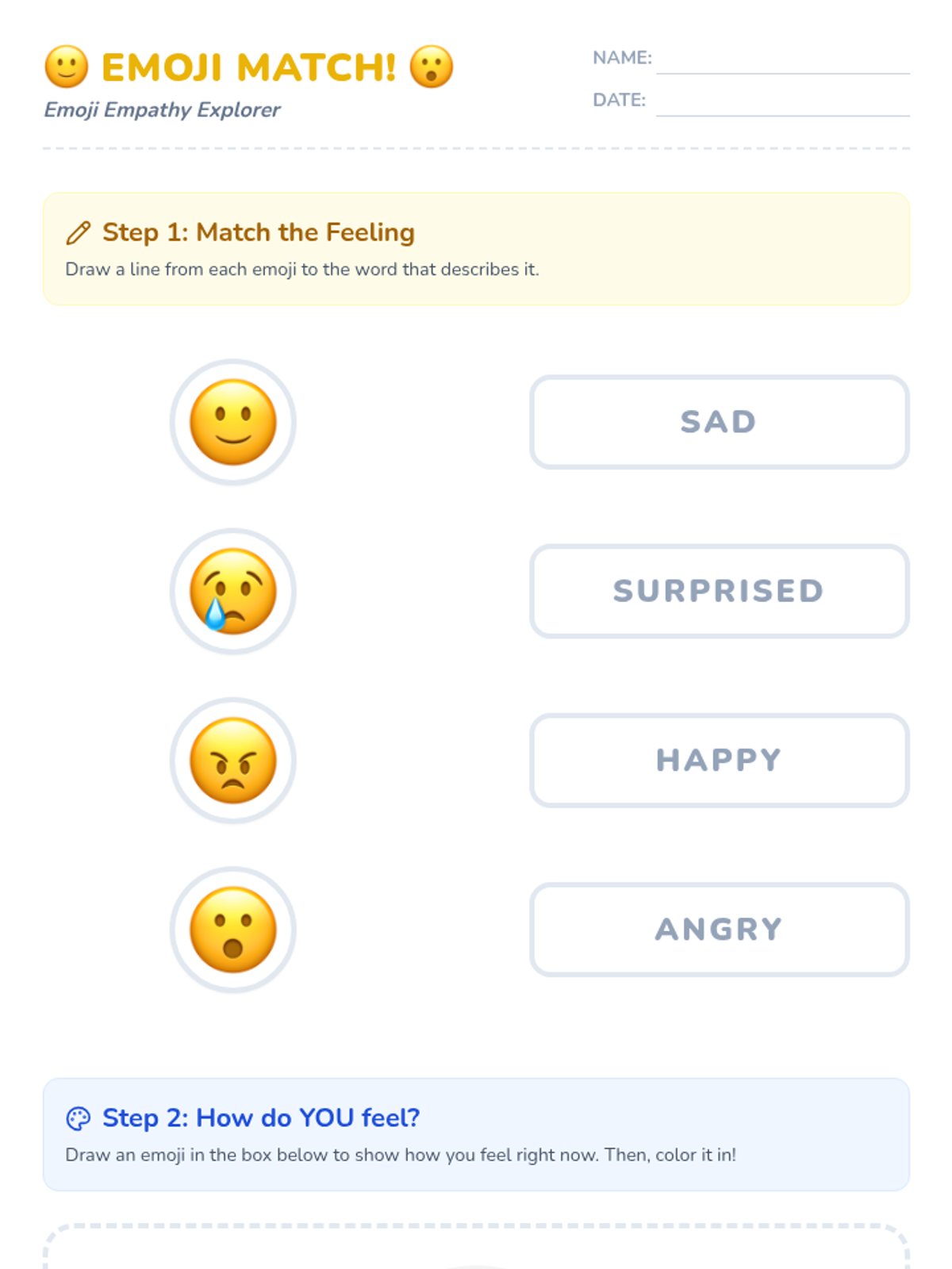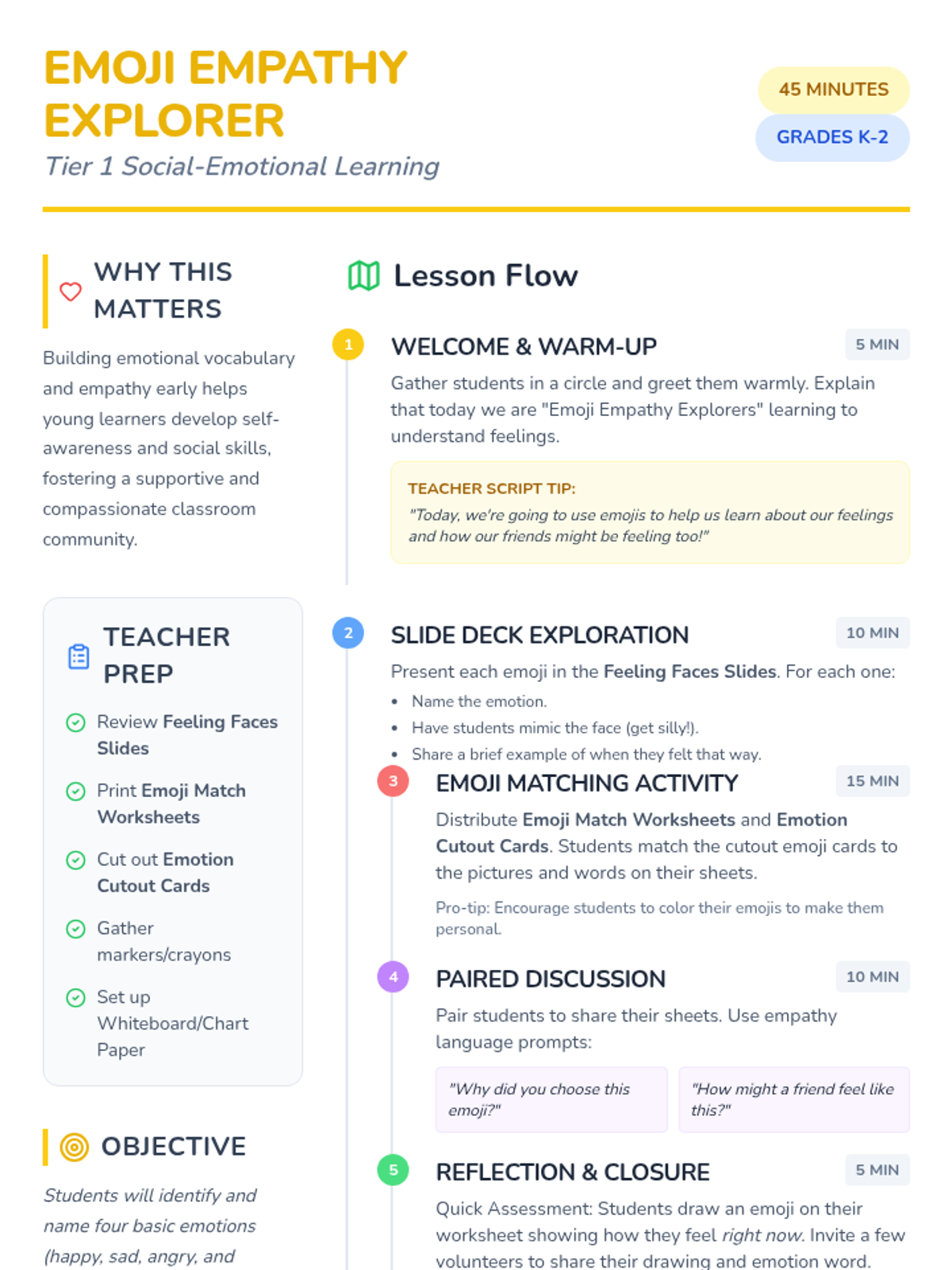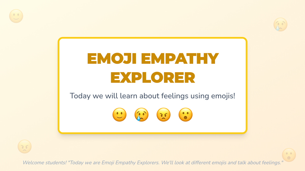 A foundational lesson for K-2 students to identify and name basic emotions using emojis, fostering empathy and social-emotional skills through interactive slides and matching activities.