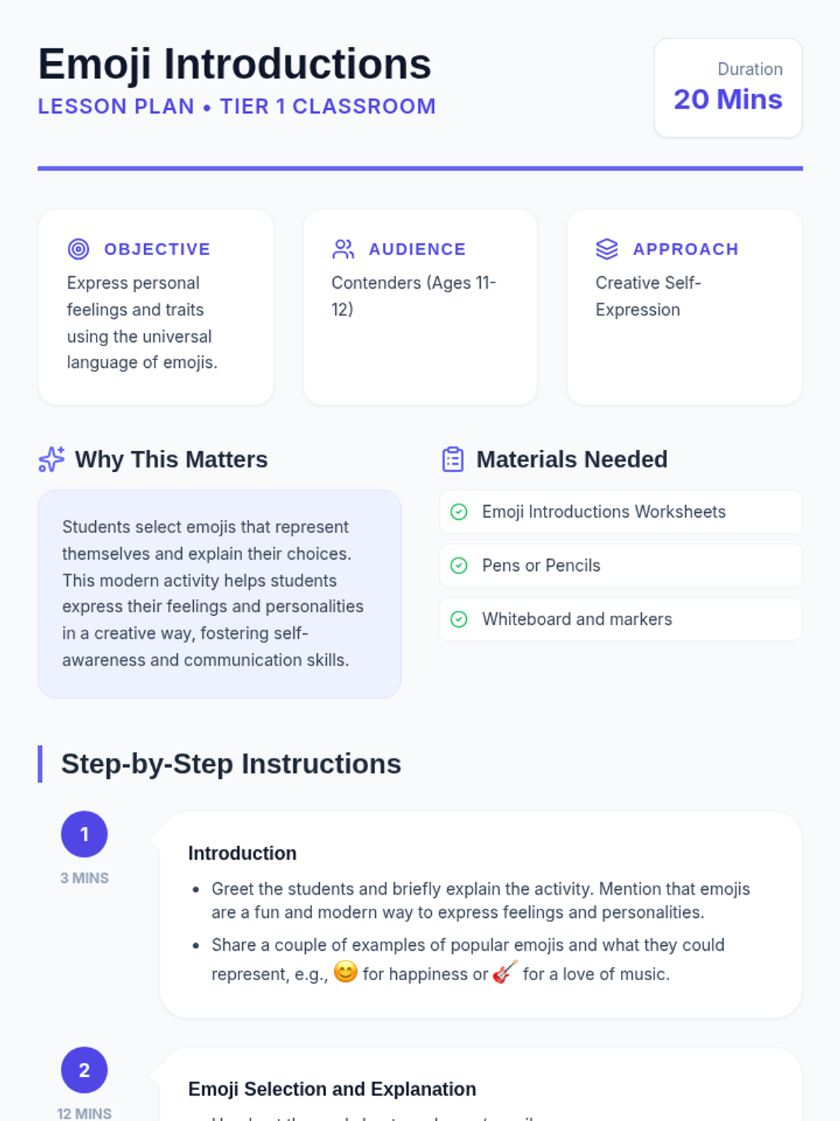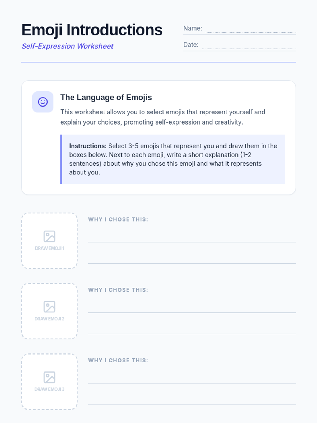 Students select and explain emojis that represent their personality and feelings, fostering self-awareness and creative communication.