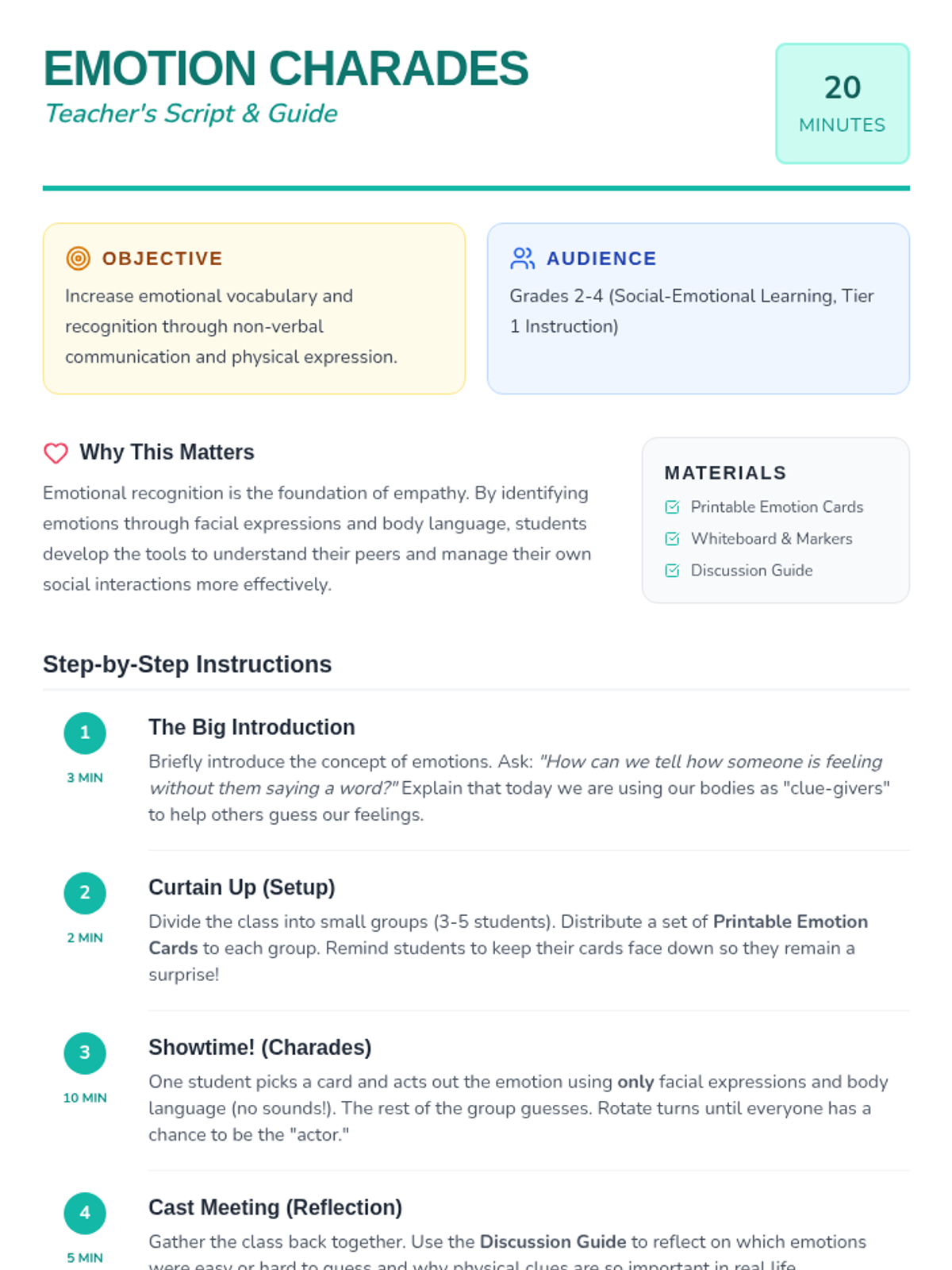 A fun, interactive lesson where students use facial expressions and body language to express and identify emotions, building their emotional vocabulary and social-emotional awareness.