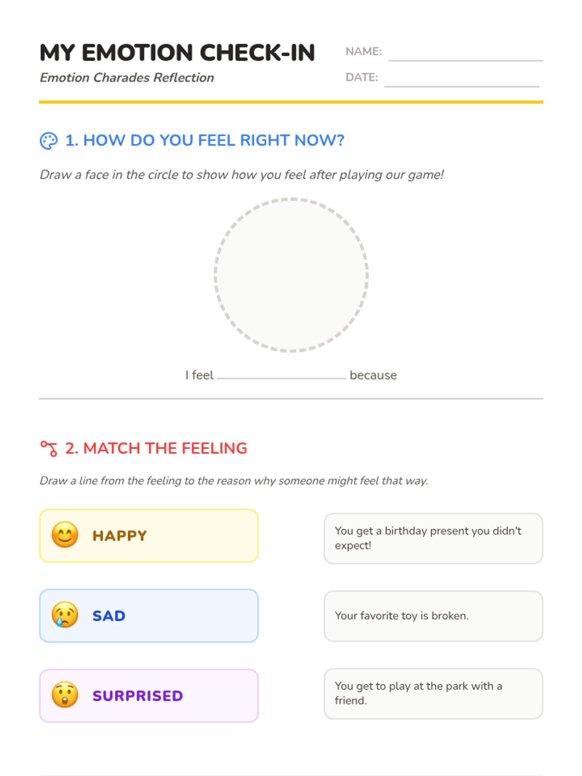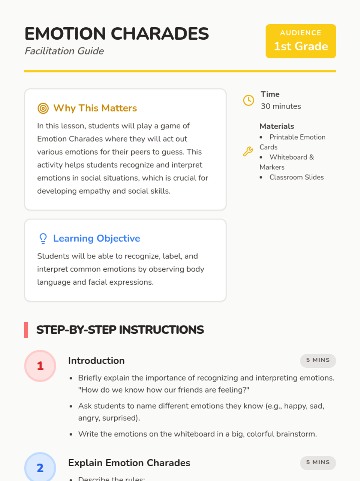 A fun, interactive lesson where 1st grade students practice recognizing and interpreting emotions through a game of charades, building essential social-emotional skills.
