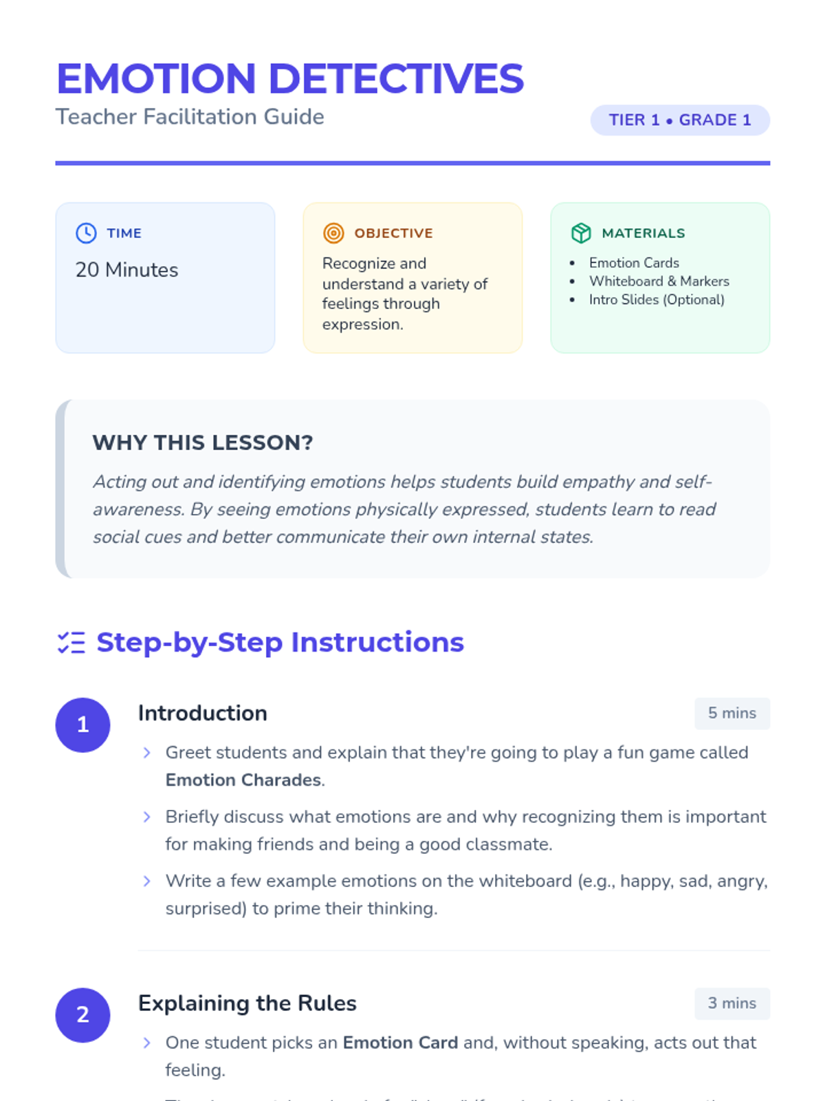 A fun, interactive lesson where 1st-grade students practice recognizing and expressing various emotions through a game of charades, building social-emotional awareness.