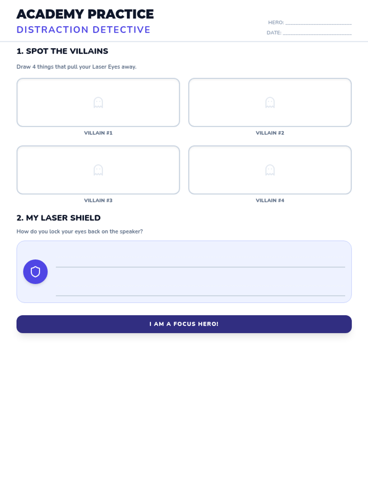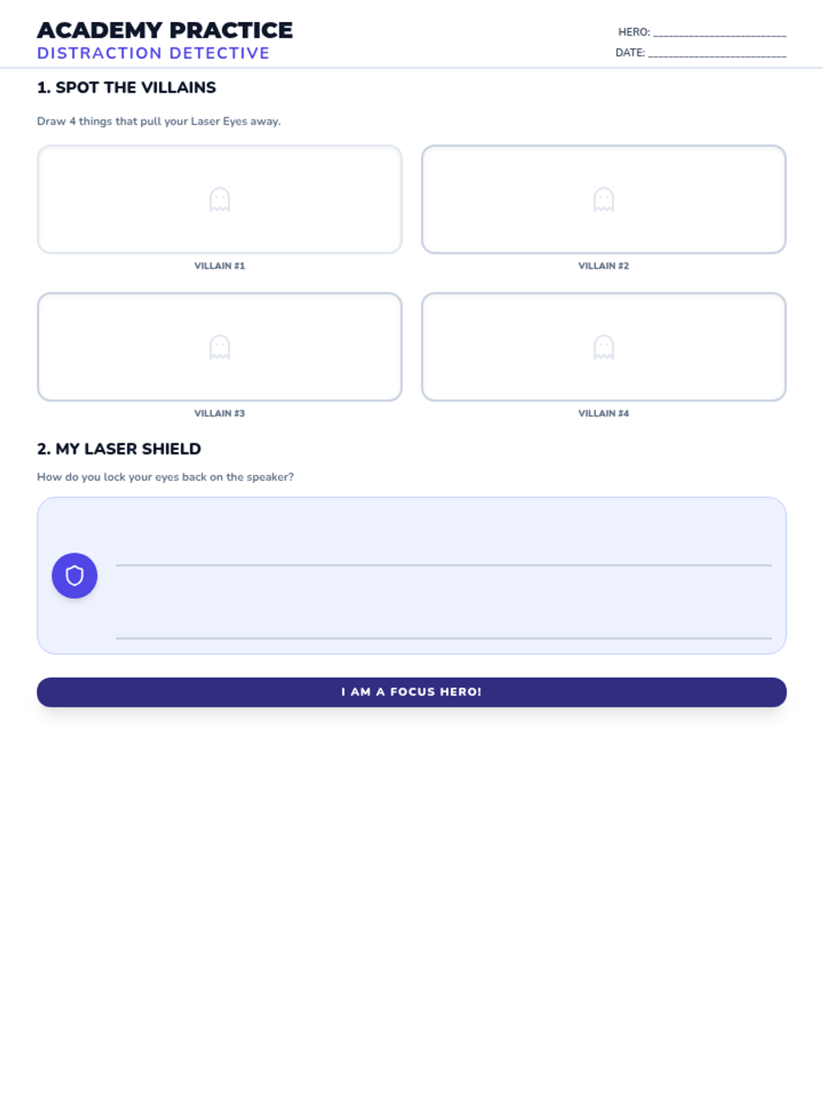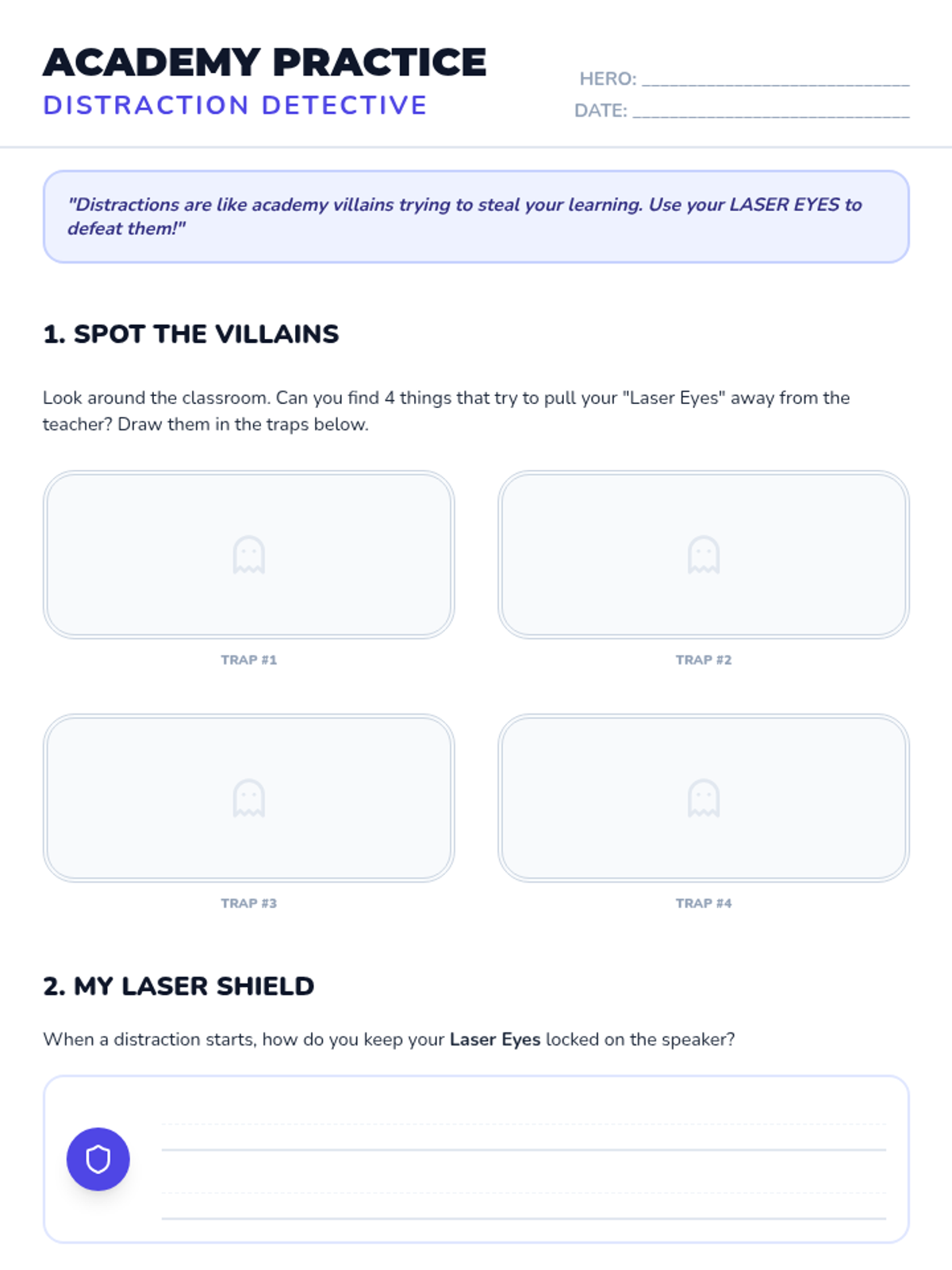 Teaches students how to use 'Laser Eyes' to focus their attention on the speaker and ignore classroom distractions.