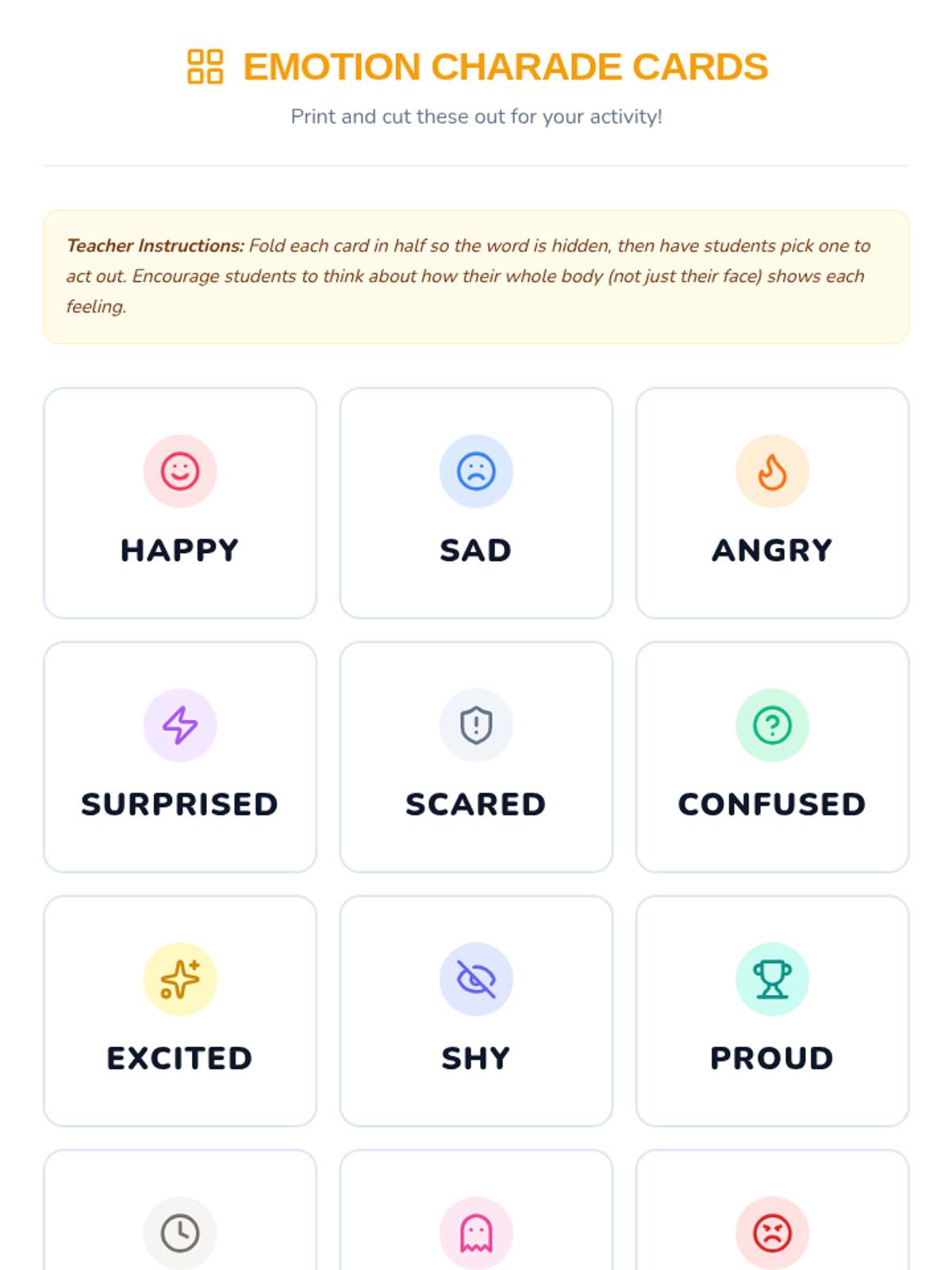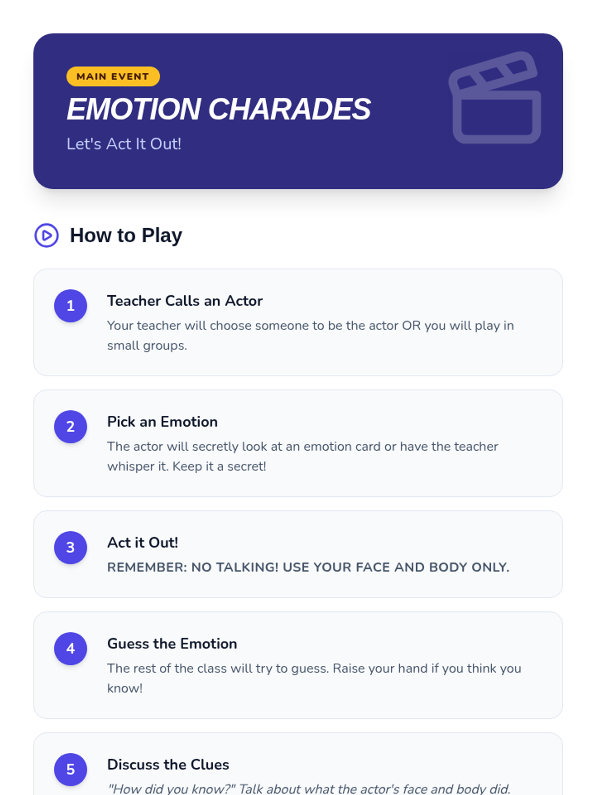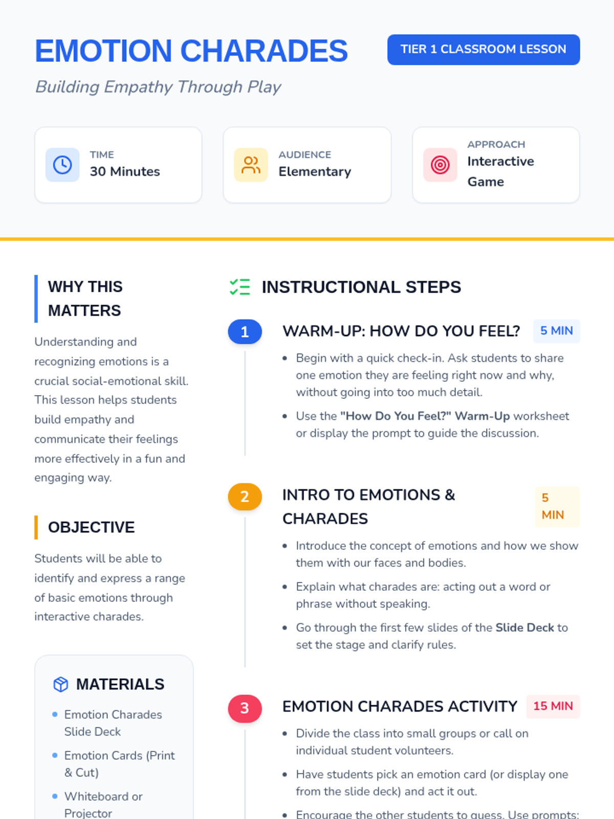 A fun and interactive 30-minute lesson for elementary students to explore and identify different emotions through charades, building empathy and communication skills.