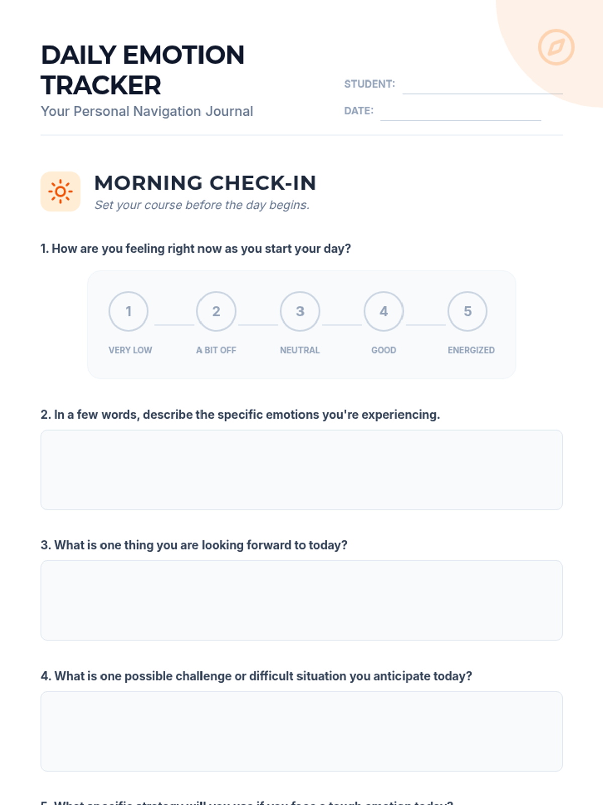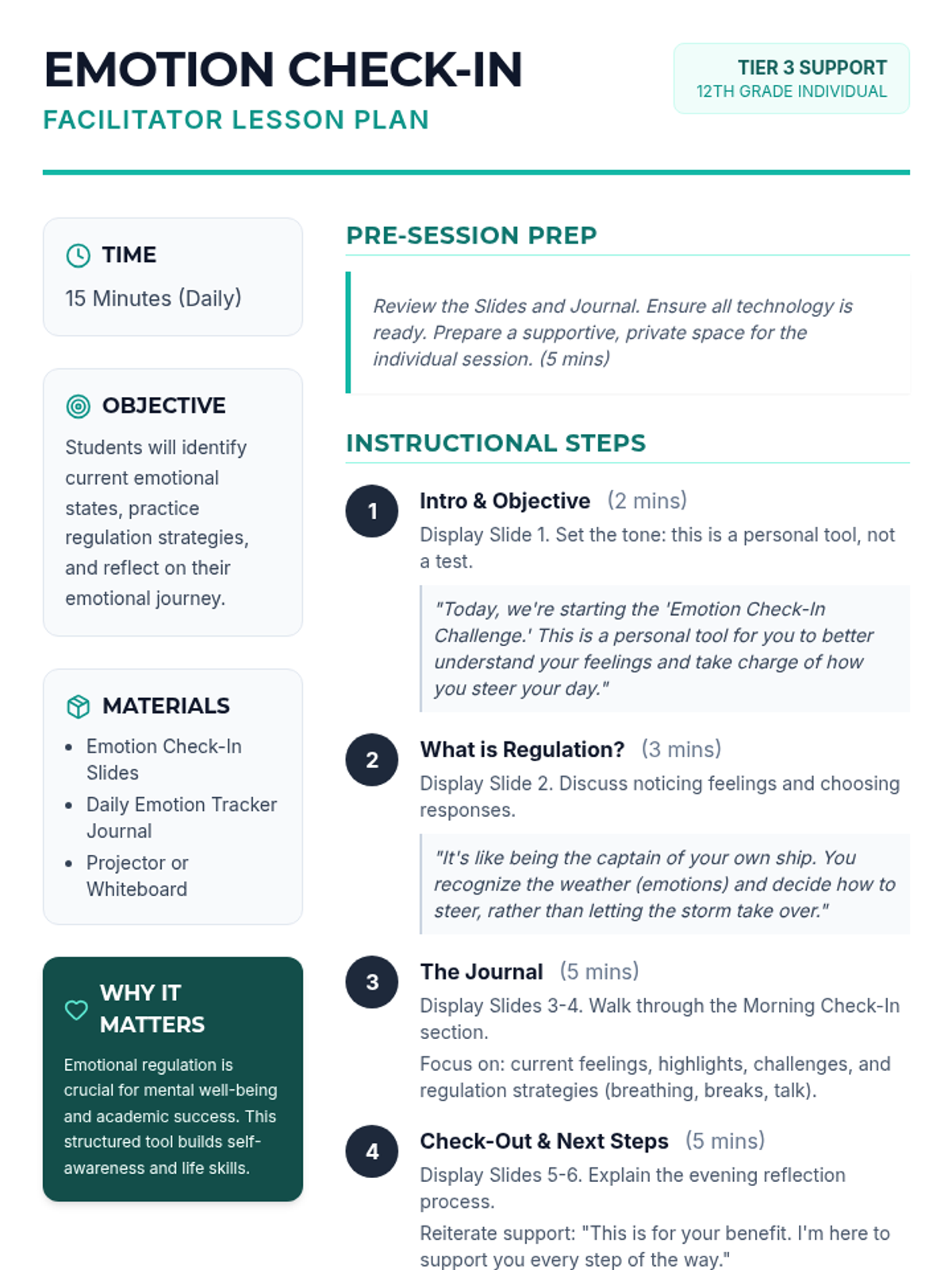 A 15-minute Tier 3 individual support session for 12th graders focused on developing emotional self-awareness and regulation through a daily check-in/check-out journal system.