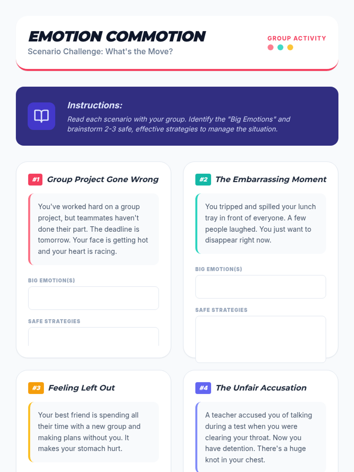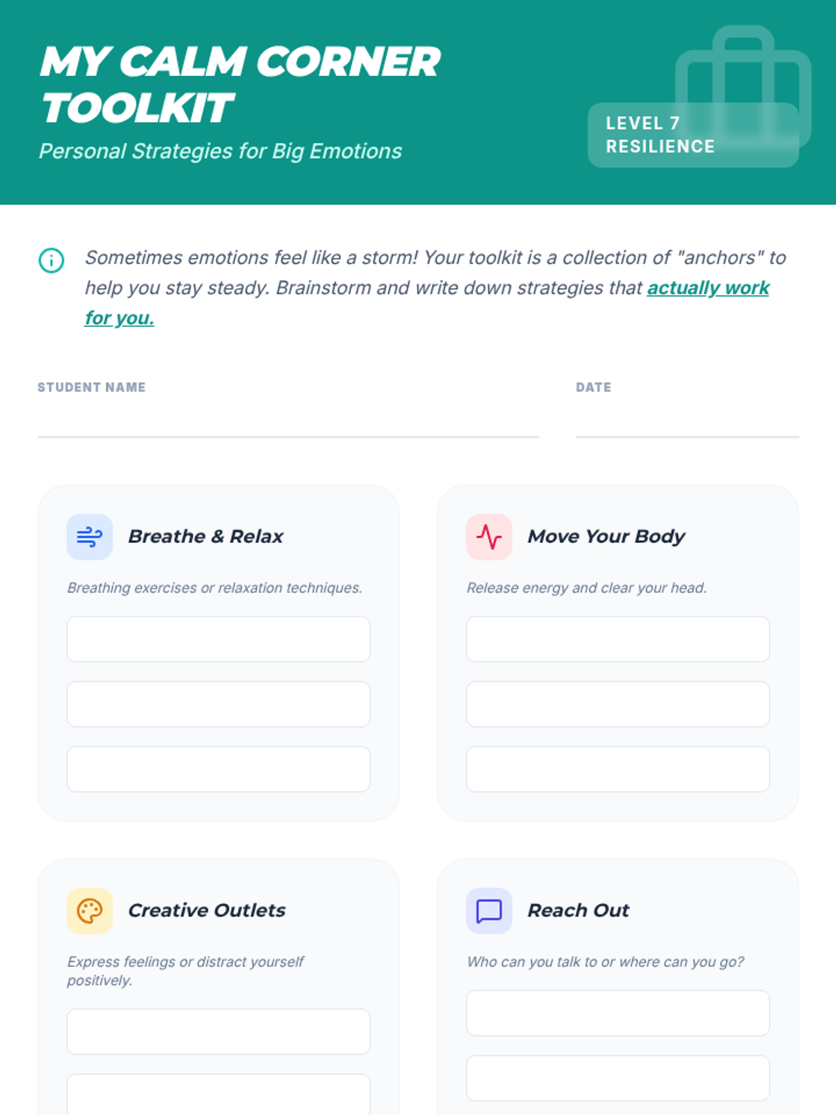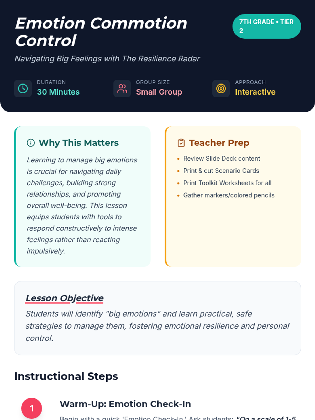 A 30-minute Tier 2 group lesson for 7th-grade students focused on identifying and safely managing intense emotions using a 'Calm Corner Toolkit' approach.