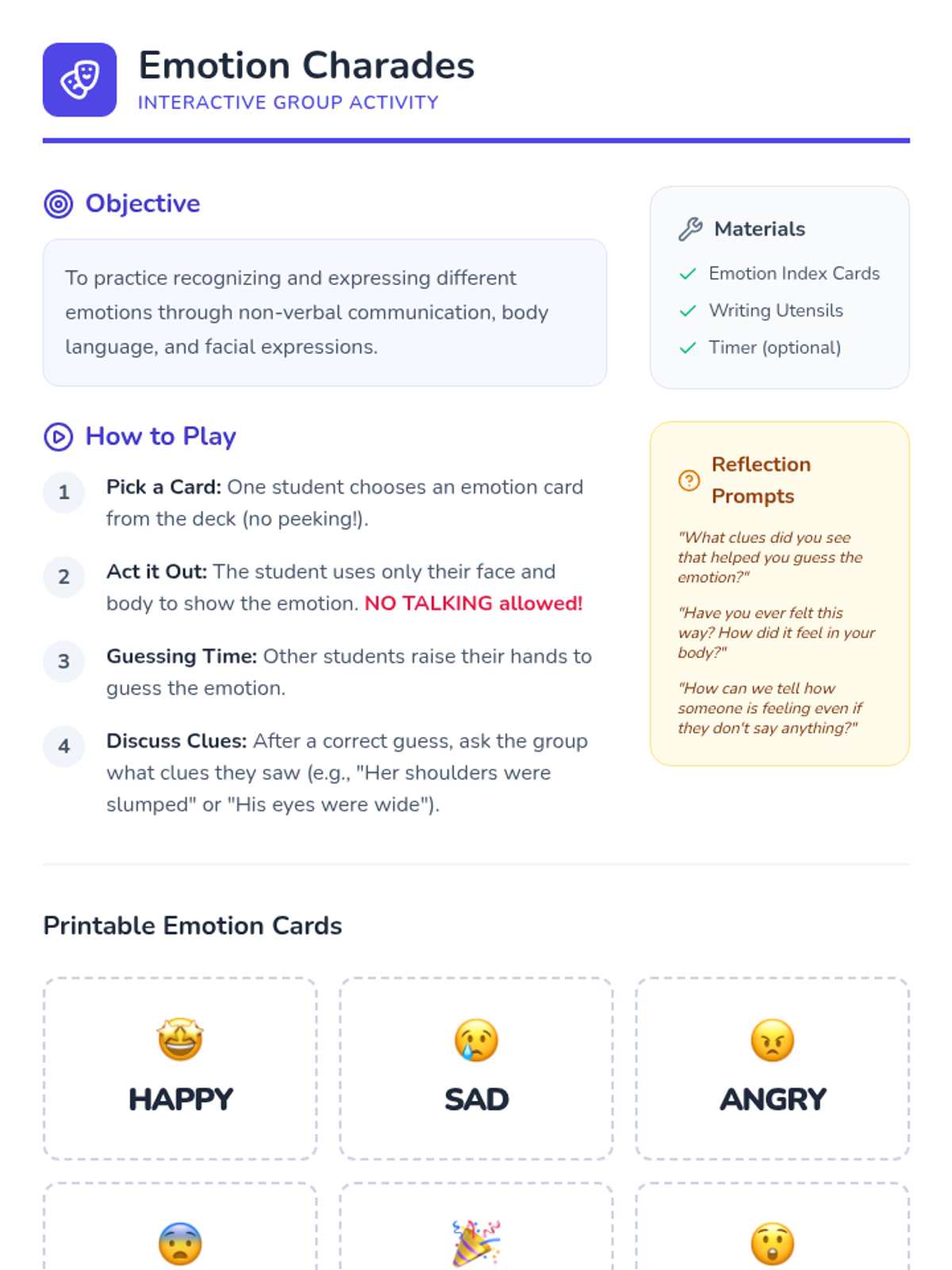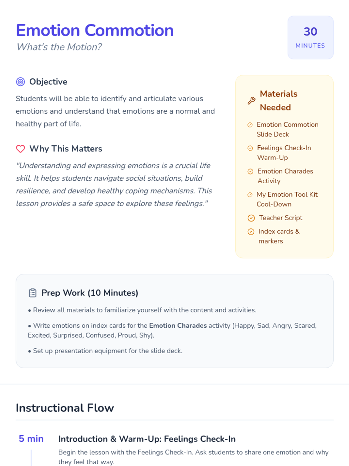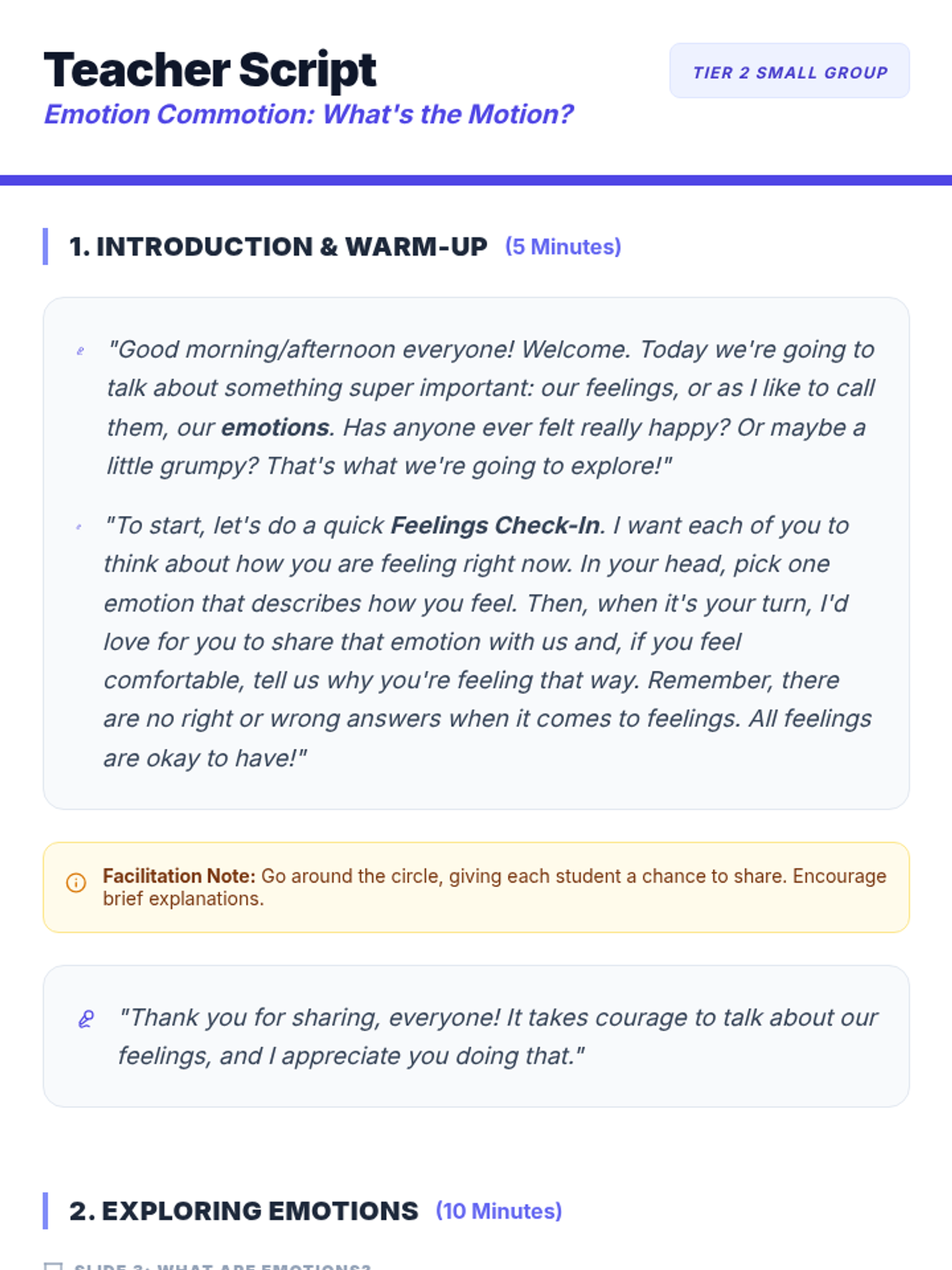 A 30-minute Tier 2 small group lesson for 3rd graders to identify, articulate, and normalize various emotions through interactive discussion and charades.